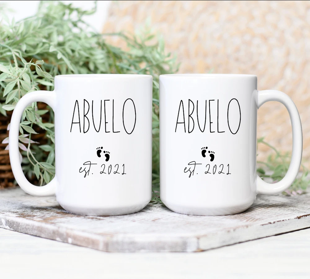 Abuelo Est. 2021 Mug Gift For First Time Abuelo Pregnancy Announcement New Product Details.. This high quality 11oz. ceramic white mug has a premium hard coat that provides crisp and vibrant color reproduction sure to last for years. Perfect for all hot & cold beverages. The highest quality printing possible is used. It will never fade no matter how many times you wash it. Material: 100% Ceramic. Print both sides. Dishwasher and Microwave Safe. High Gloss + Premium White Finish. Printed in the U.S.A. Personalized & Custom. We support personalized and custom mug to add custom, when placing an order, you can add notes to the "order note" in shipping address section. Also you can contact us directly via message. Shipping Info. Ready to ship in 1 to 2 business days, All products are made-to-order and proudly printed in the United States. Shipped by USPS and DHL, You will receive your order in 5-7 days. Replace & Refund. All products are defective during shipping broken, chipped will be replaced free of charge. You are not satisfied with the product, we will refund 100% money to you. If any other issues arise, please do not hesitate to message, we would be more than happy to assist you.