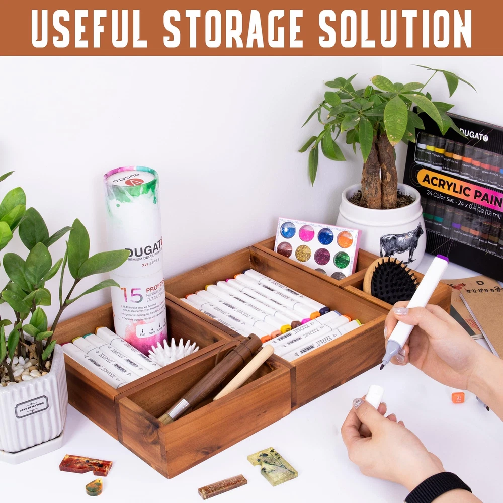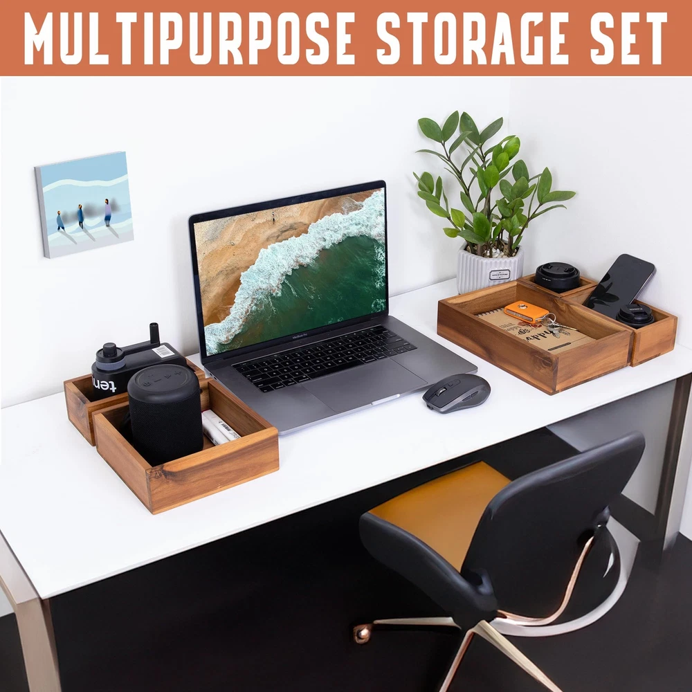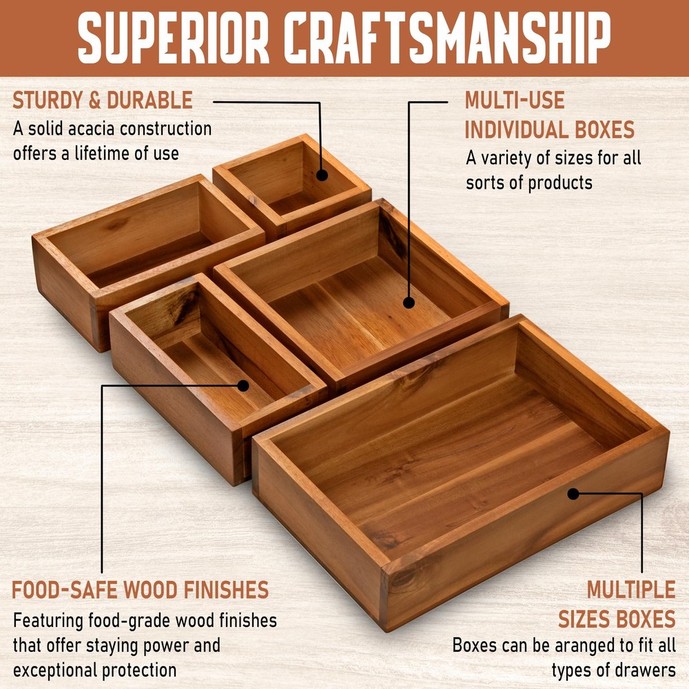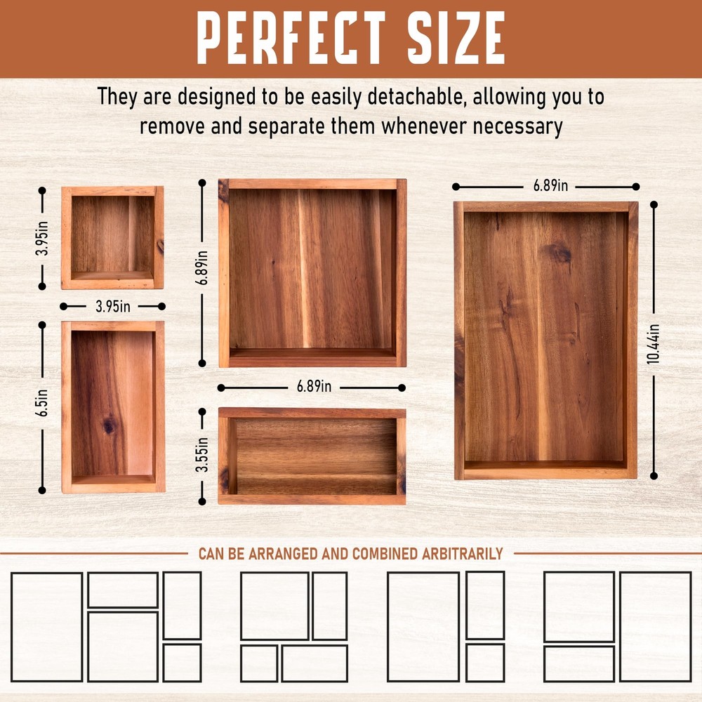 Set of 5 Storage Drawer Organizer: By incorporating this wooden storage bin set into your room, you can bid farewell to the tiresome task of searching for misplaced items. With everything neatly arranged, you'll save valuable time and avoid the frustration of rummaging through clutter. The drawer set is suitable for organizing in various areas of your home, including the living room, kitchen, bedroom, bathroom, dresser drawer, office drawer organization. Different Sizes for Utensil Organizer: The cabinet drawer includes 5 small drawer organizers, each available in different sizes. The compact dimensions of 3.95 x 3.95", 3.95 x 6.5", 3.55 x 6.89", 6.89 x 6.89", and 6.89 x 10.44" make them convenient for use as a vanity organizer, catering to your personal needs. Our wooden boxes can be rearranged to your preference, allowing you to organize these storage bins individually or as a set. Feel free to mix and match the inserts to perfectly suit your spaces. Useful Kitchen Divider Boxes: Simplify your kitchen organization with these utensil storage trays. With 5 sturdy and durable acacia containers, allowing you to conveniently view and store your collection of small culinary gadgets, cookware accessories, and cooking tools. Experience a clutter-free space with our practical storage solution, featuring deep compartments that fit perfectly in drawers. Optimal Wood Storage Boxes for Office Tools & Accessories: Streamline your tabletop and cabinet space with these helpful acacia wooden trays, serving as a neatly arranged office organizer. Save your office supplies in your desk drawer to keep pens, markers, staplers, paper clips, scissors, sticky notes, and calculators. The tray edges with a height of 2.17 inches make it useful for storing even taller tools. Additionally, the storage bin with the smallest dimensions can provide an ideal saving box for your jewelry, hair ties, watches, bracelets, and necklaces. Superior Craftsmanship Drawer Ensemble: Our kitchen drawer holder acacia drawer organizer box is crafted by skilled artisans with years of experience. The finished storage boxes feature thick wooden edges and a smooth surface, showcasing the excellent workmanship of our dedicated workers in our workshop. Enjoy not only its practical functionality but also its beautiful aesthetic—the variations are endless! Enhanced Space Organization: These durable containers are perfect for everyday use. Designed to accommodate even the tightest drawer areas in your home, this small storage bin holder set offers enhanced space organization. Experience the benefits of our efficient drawer organizers, eliminating countertop clutter and providing a neat storage solution. Note: The color representation of our wood products in photographs may vary slightly from the actual product due to lighting conditions. We provide two colors of the product: acacia brown and black for your reference.