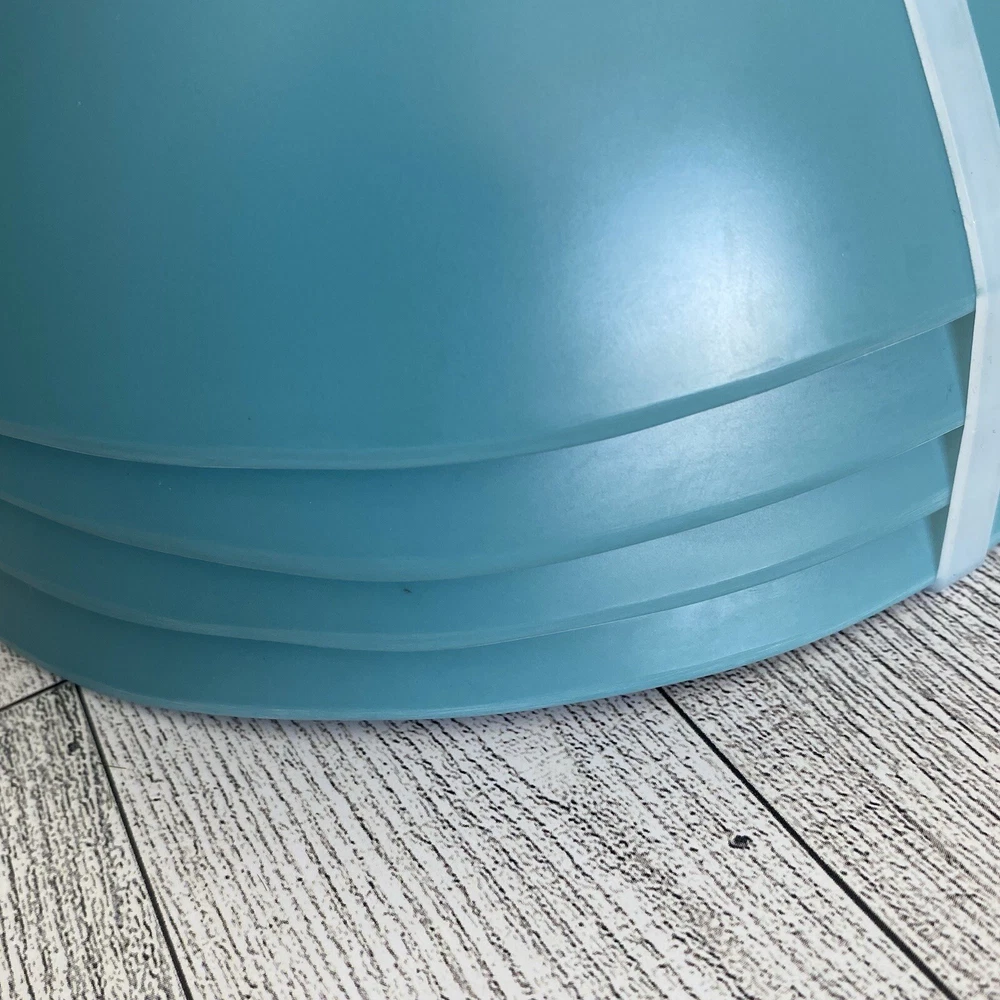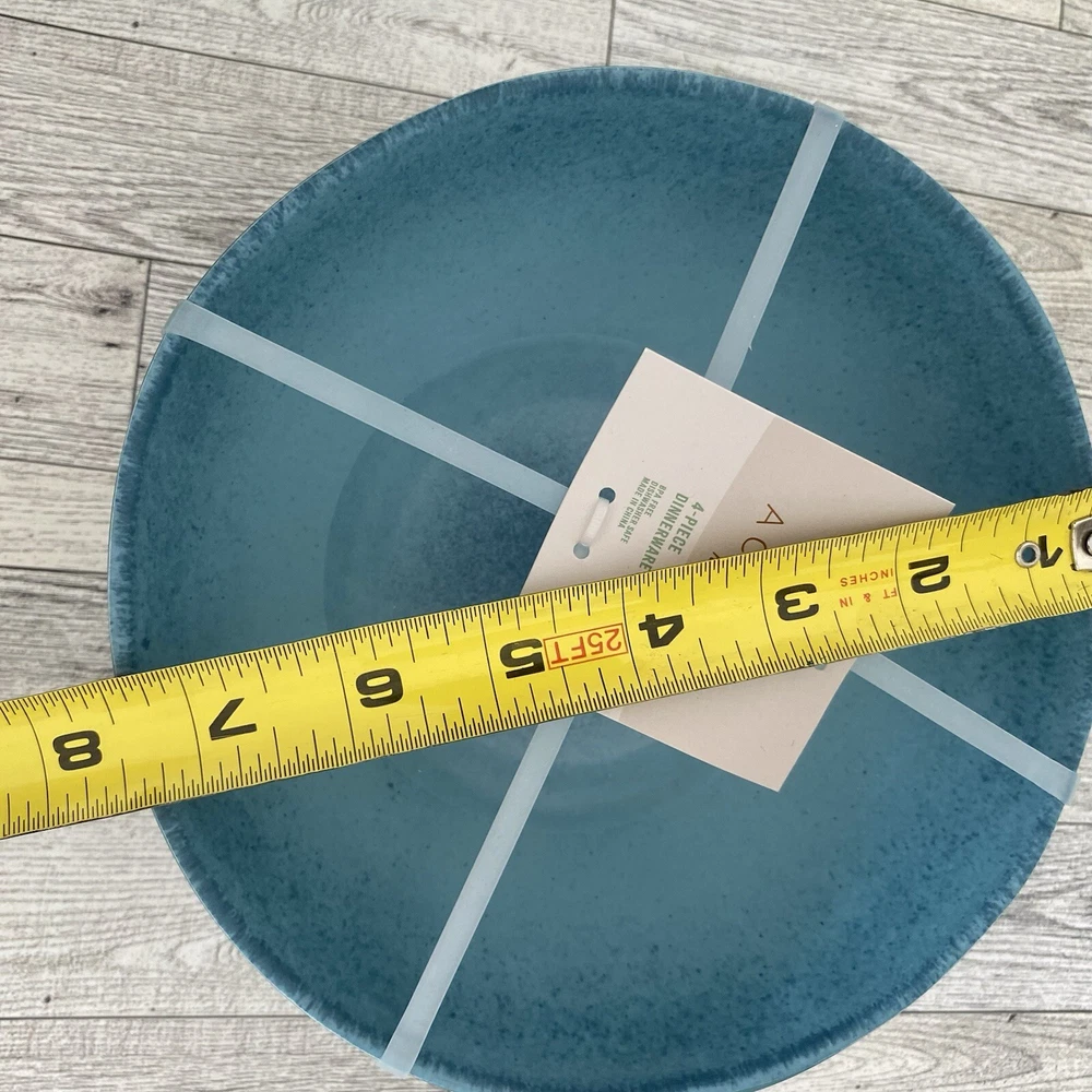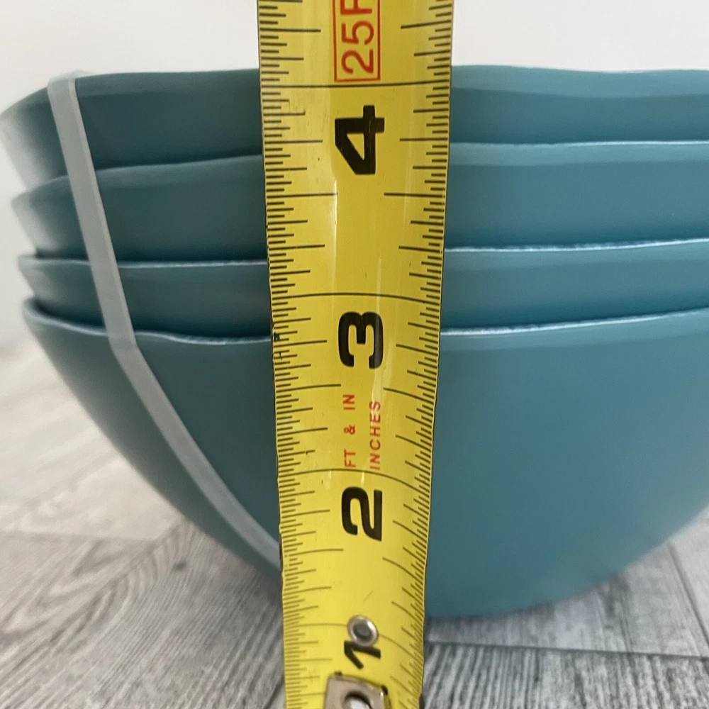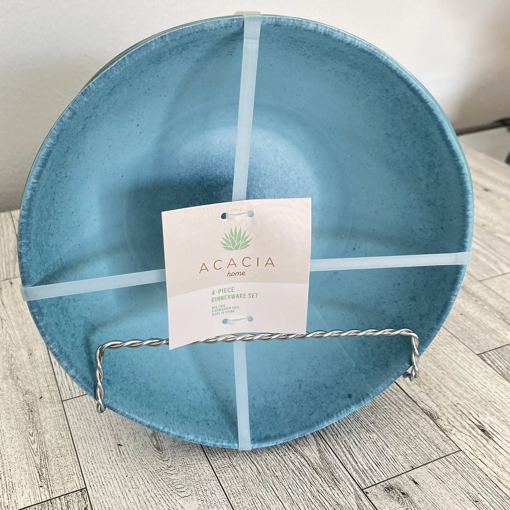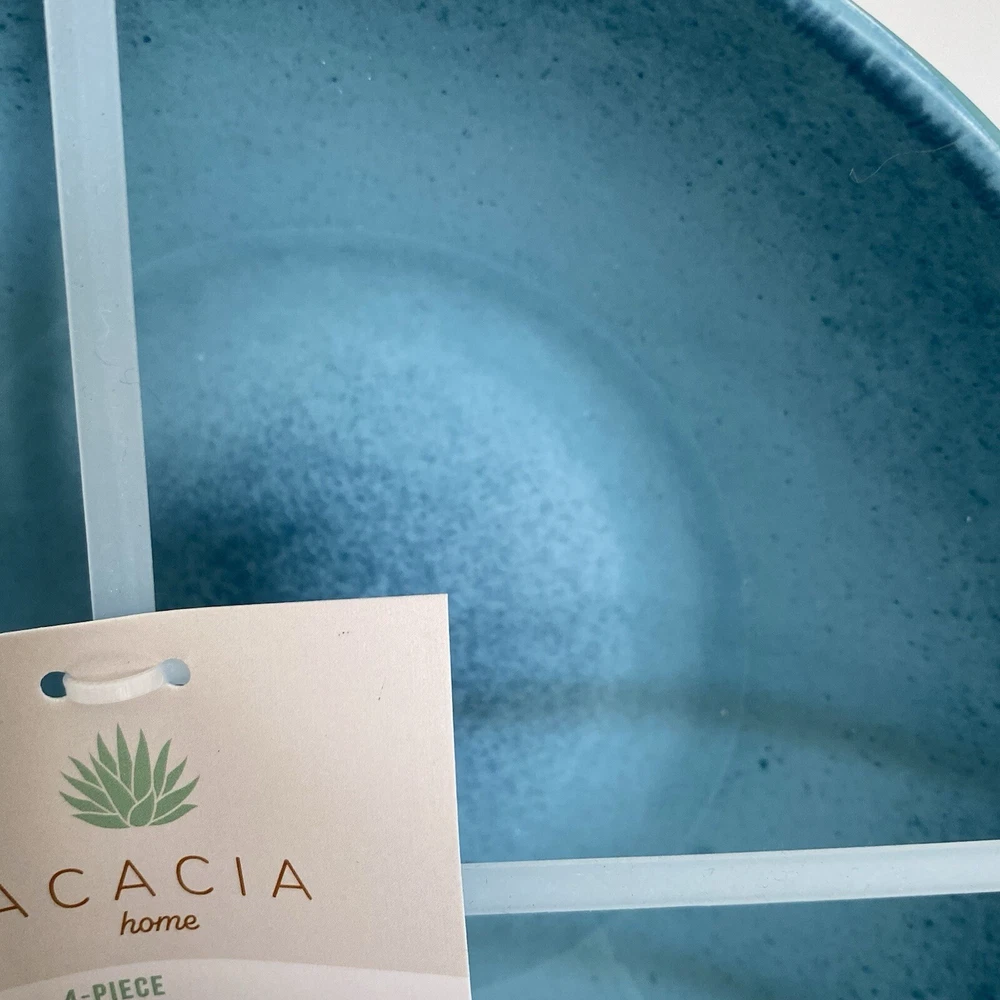 Acacia Home Set deep of 4 salad soup bowls in turquoise with a speckled design. These bowls are made of durable melamine material with a wavy edge design, perfect for any occasion. The bowls are solid in pattern and are ideal for serving soups or salads. The product is designed by Acadia Home and manufactured in China. 7" Wide x3" deep. New with Tags. Not microwave safe but dishwasher safe.
