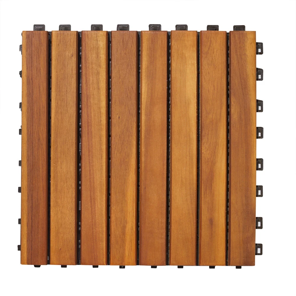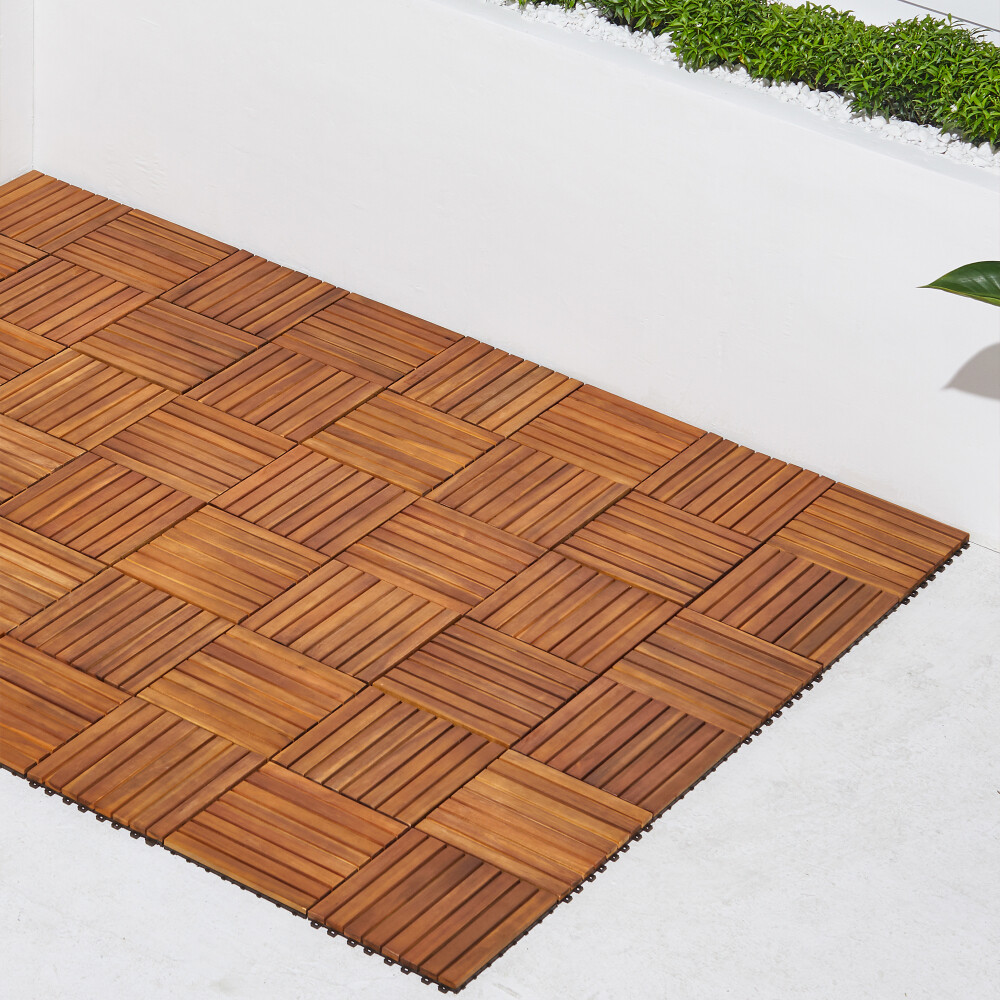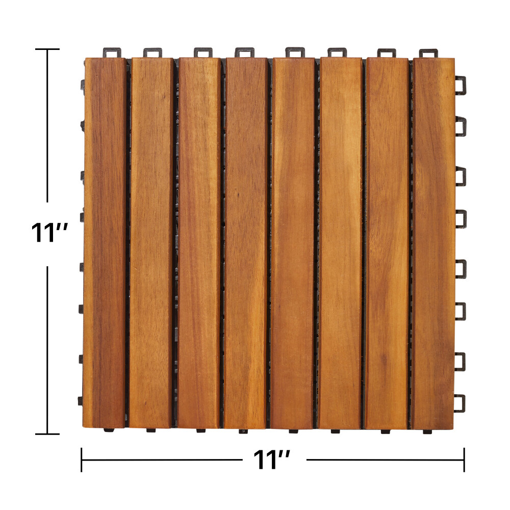 Pattern: Eight horizontal slats per tile Outdoor covering for patios, decks, balconies, porches, walkways, pools and hot tubs Indoor covering for garage floors, basement floors, and bathroom floors Pre-treated, expertly kiln-dried, extremely durable Acacia Hardwood Weather-resistant Backed with unique plastic interlocking grid for easy installation Fast snap-together installation with no nails, staples or glue Easy to remove, re-arrange and re-lay tiles Interchangeable styles to create patterns Wood slats permit water to flow through (Set of 10 Tiles)