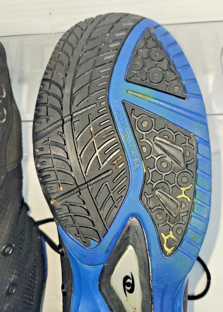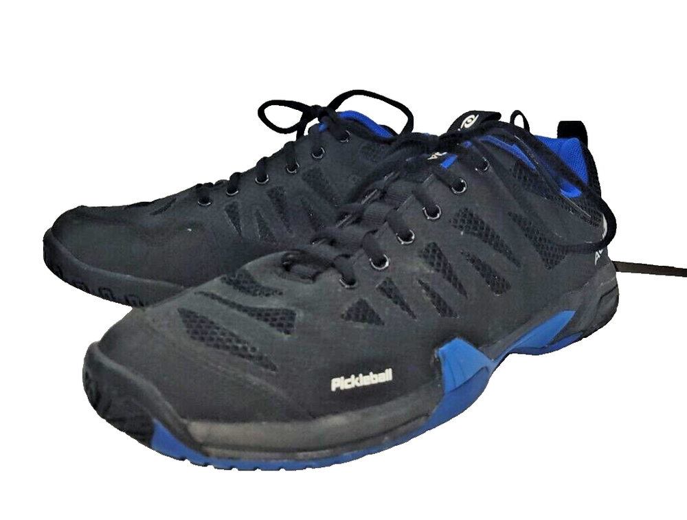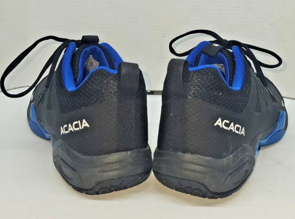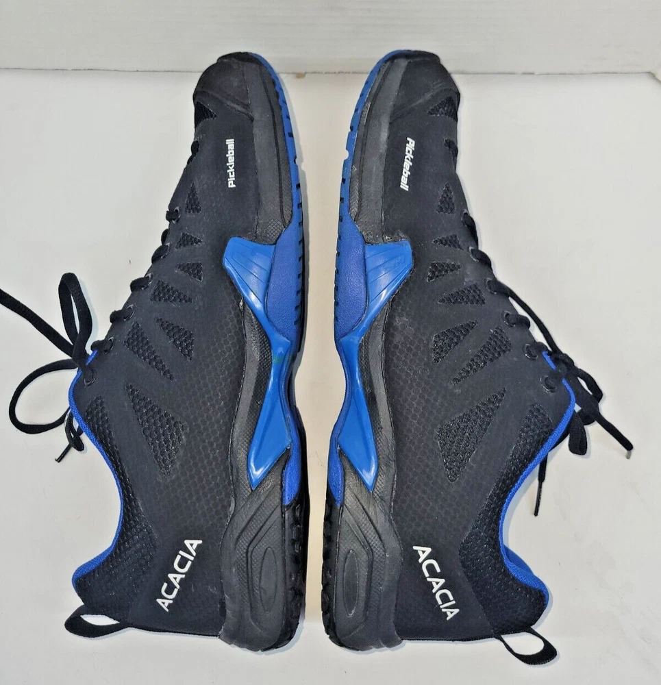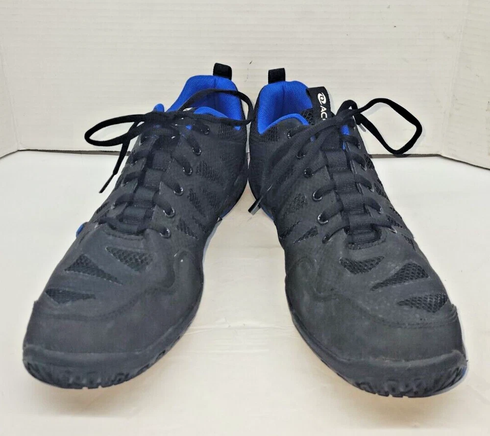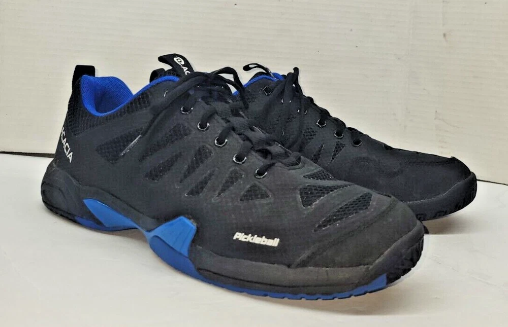 Elevate your performance with these Acacia Proshot athletic shoes. Designed for agility, the sneakers feature a precision fit and motion control, ensuring peak performance on the court or in the gym. The durable ballistic upper is water-resistant and breathable, while the rubber outsole provides non-slip traction. The shoes come in a stylish black and noir colorway and are suitable for all seasons. They are perfect for pickleball, tennis, cross-training, and other sports, providing comfort, cushioning, and arch support. The shoes are available in US size 11 and UK size 10.5, with a standard shoe width. Made in China, the shoes are tournament-grade and court-ready, making them a must-have for all sports enthusiasts. Shoes are in great condition, plastic piece on the outer midsole of both shoes have slightly come apart from shoe. Light wear A.A.