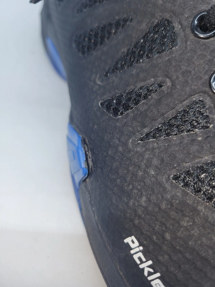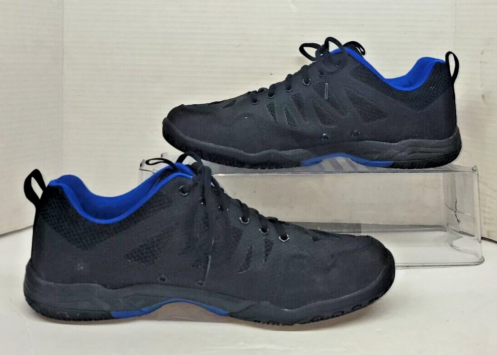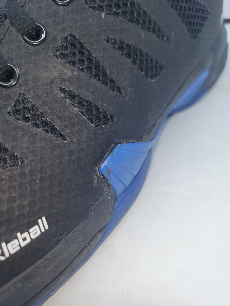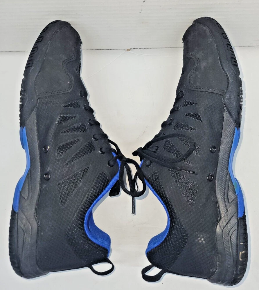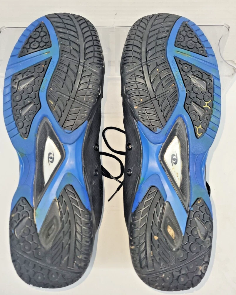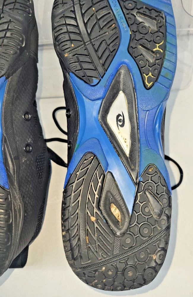 Elevate your performance with these Acacia Proshot athletic shoes. Designed for agility, the sneakers feature a precision fit and motion control, ensuring peak performance on the court or in the gym. The durable ballistic upper is water-resistant and breathable, while the rubber outsole provides non-slip traction. The shoes come in a stylish black and noir colorway and are suitable for all seasons. They are perfect for pickleball, tennis, cross-training, and other sports, providing comfort, cushioning, and arch support. The shoes are available in US size 11 and UK size 10.5, with a standard shoe width. Made in China, the shoes are tournament-grade and court-ready, making them a must-have for all sports enthusiasts. Shoes are in great condition, plastic piece on the outer midsole of both shoes have slightly come apart from shoe. Light wear A.A.