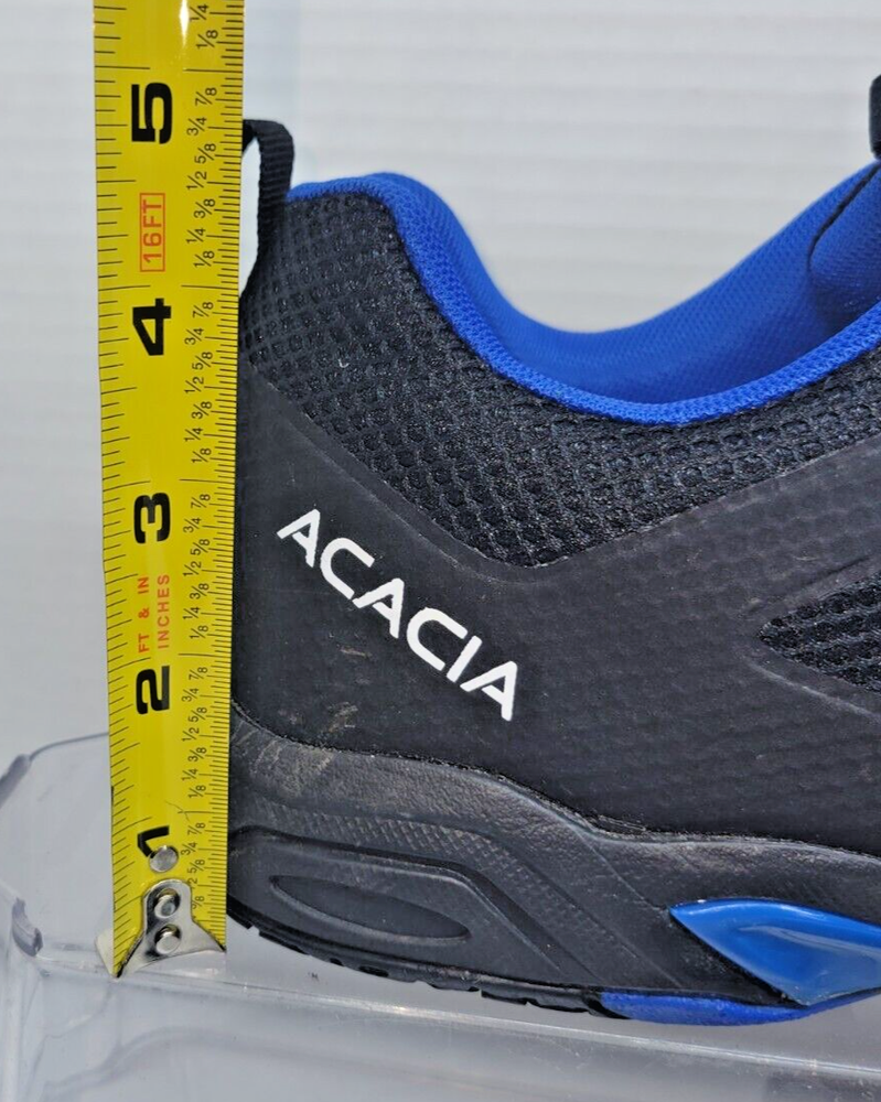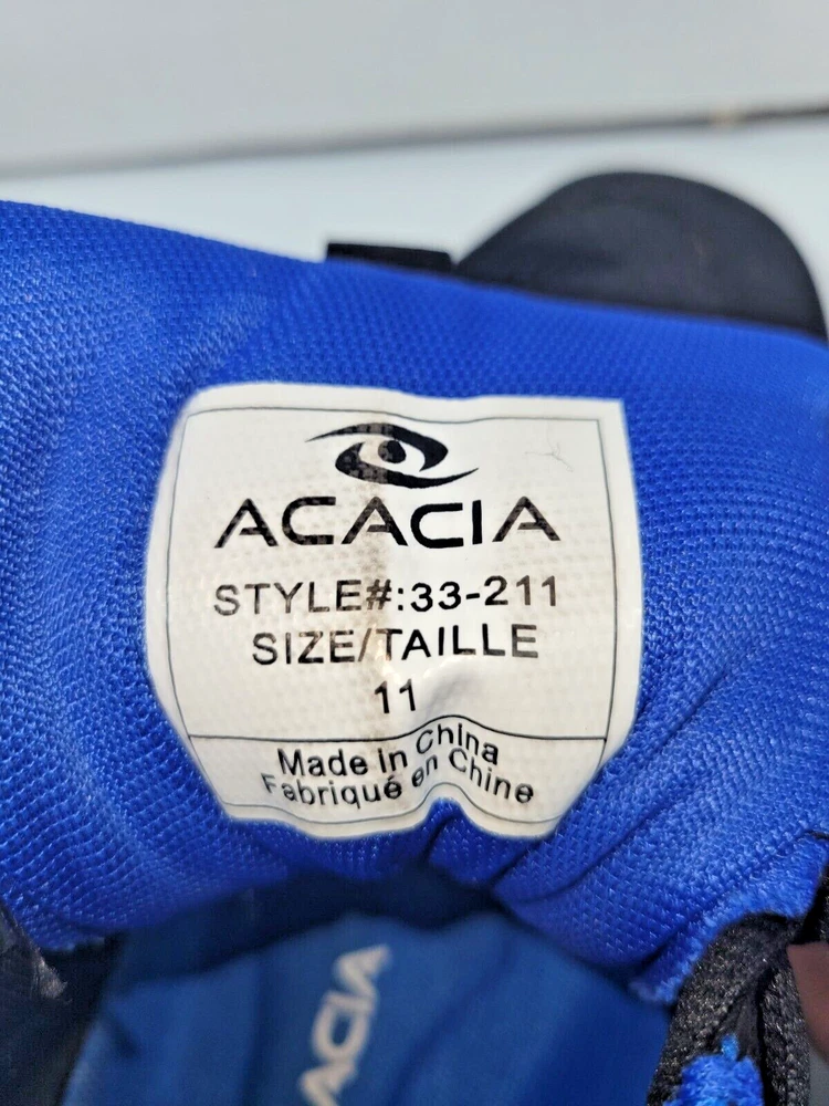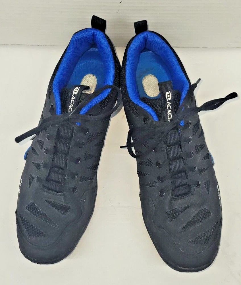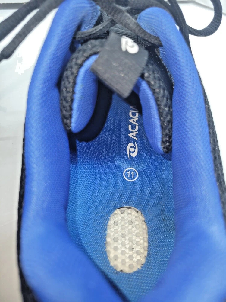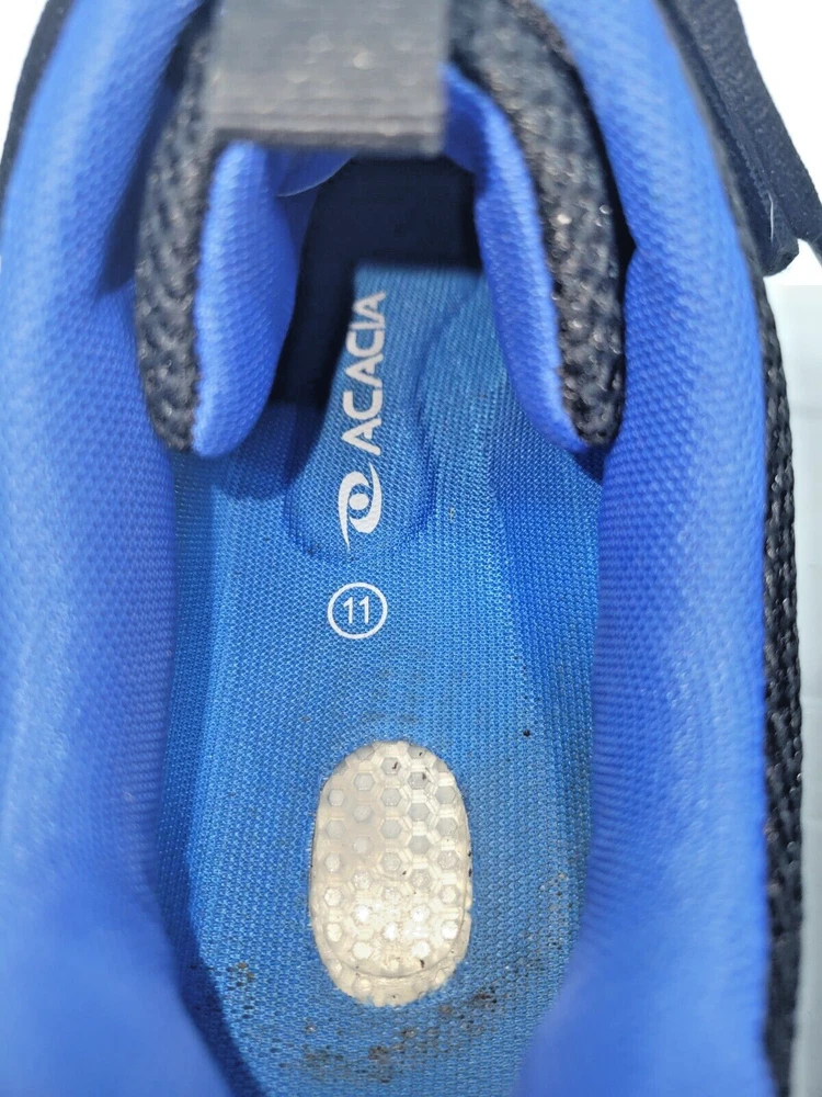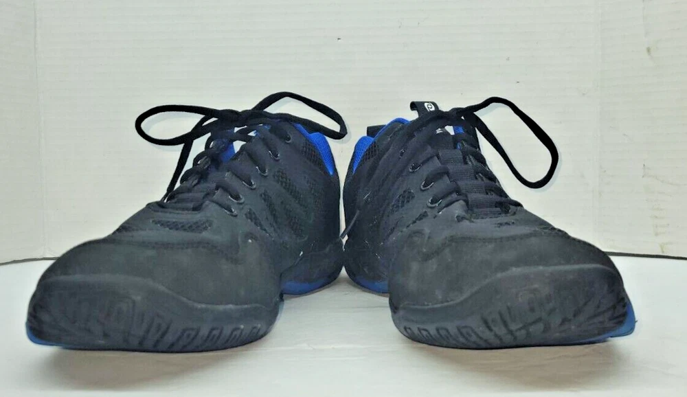 Elevate your performance with these Acacia Proshot athletic shoes. Designed for agility, the sneakers feature a precision fit and motion control, ensuring peak performance on the court or in the gym. The durable ballistic upper is water-resistant and breathable, while the rubber outsole provides non-slip traction. The shoes come in a stylish black and noir colorway and are suitable for all seasons. They are perfect for pickleball, tennis, cross-training, and other sports, providing comfort, cushioning, and arch support. The shoes are available in US size 11 and UK size 10.5, with a standard shoe width. Made in China, the shoes are tournament-grade and court-ready, making them a must-have for all sports enthusiasts. Shoes are in great condition, plastic piece on the outer midsole of both shoes have slightly come apart from shoe. Light wear A.A.