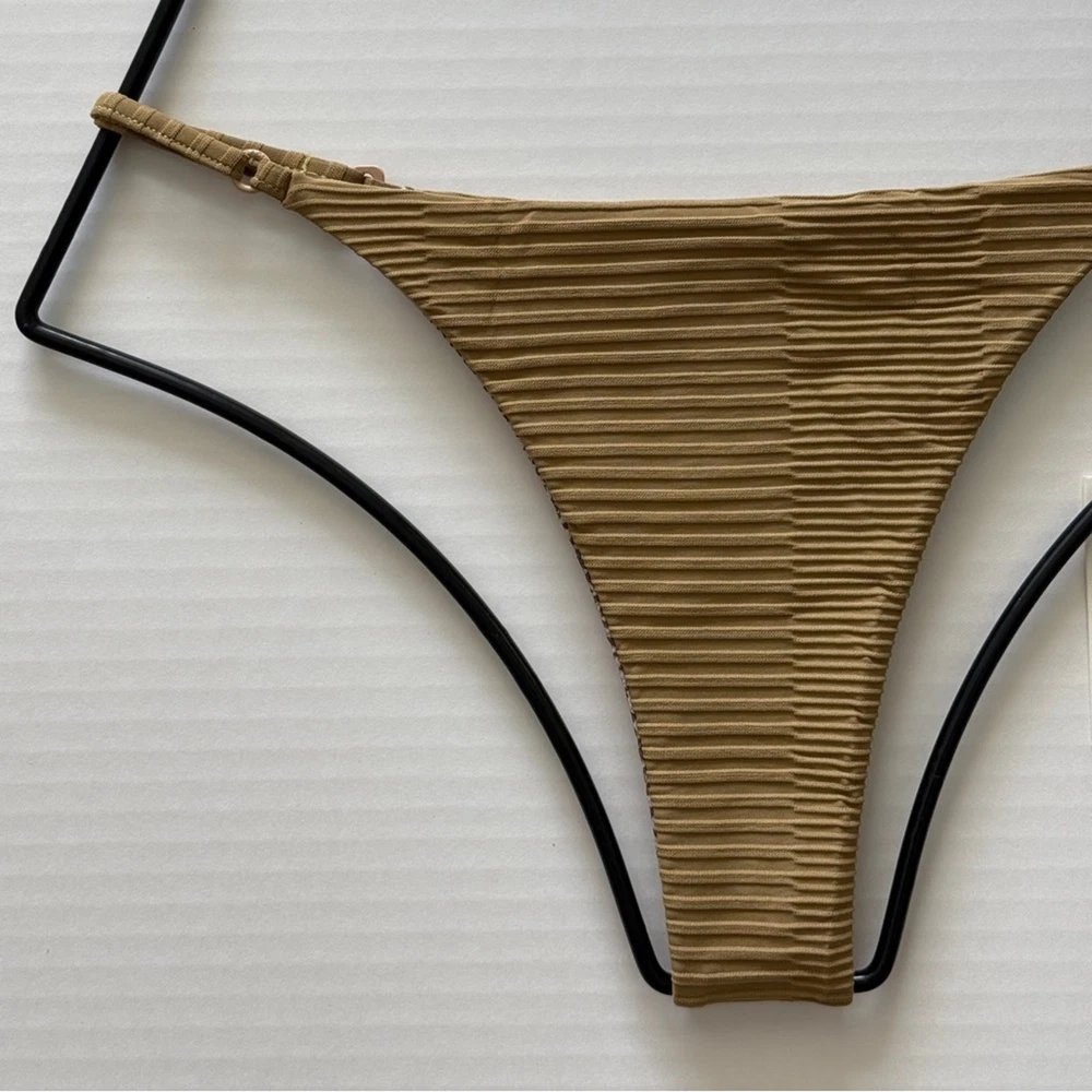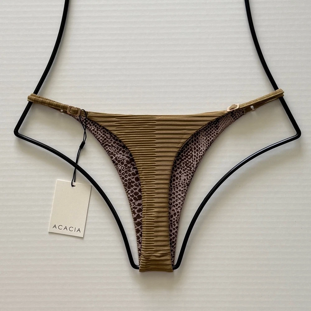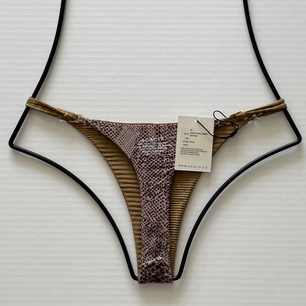 Acacia Ralphy Bikini Bottom - Palm Dual Ribbed - High Cut, Minimal Coverage Size: Large Color: Palm Dual Ribbed Retail $119 Condition: Brand New with Tags Feel the island breeze in the Acacia Swim Ralphy Dual Ribbed Bikini Bottom in the captivating Palm design. The unique dual ribbed texture adds a touch of tactile interest and sophistication, while the high-cut hip and minimal coverage provide a flattering and confident fit. The earthy, neutral Palm print, features a unique, horizontal ribbed texture in a sophisticated, medium green shade. This subtly textured fabric adds a touch of understated elegance to your swimwear collection. And will instantly transport you to a tropical paradise. Crafted from a sustainable blend of recycled nylon and spandex, this bottom is as good for the planet as it is for your beach style. The soft lining ensures maximum comfort, allowing you to move freely and enjoy your time in the sun. Minimal coverage High cut hip Adjustable hardware on side straps Matte finish custom logo hardware. 85% Nylon / 15% Spandex, Lining 85% Nylon / 15% Spandex Hand wash cold, dry in shade only Avoid rough surfaces, lotions, sunscreens, and overly chlorinated pools Suits should be worn with care Made in Indonesia Shop the Acacia Swim Ralphy Bikini Bottom in Palm Dual Ribbed today and bring a touch of paradise to your beachwear collection!