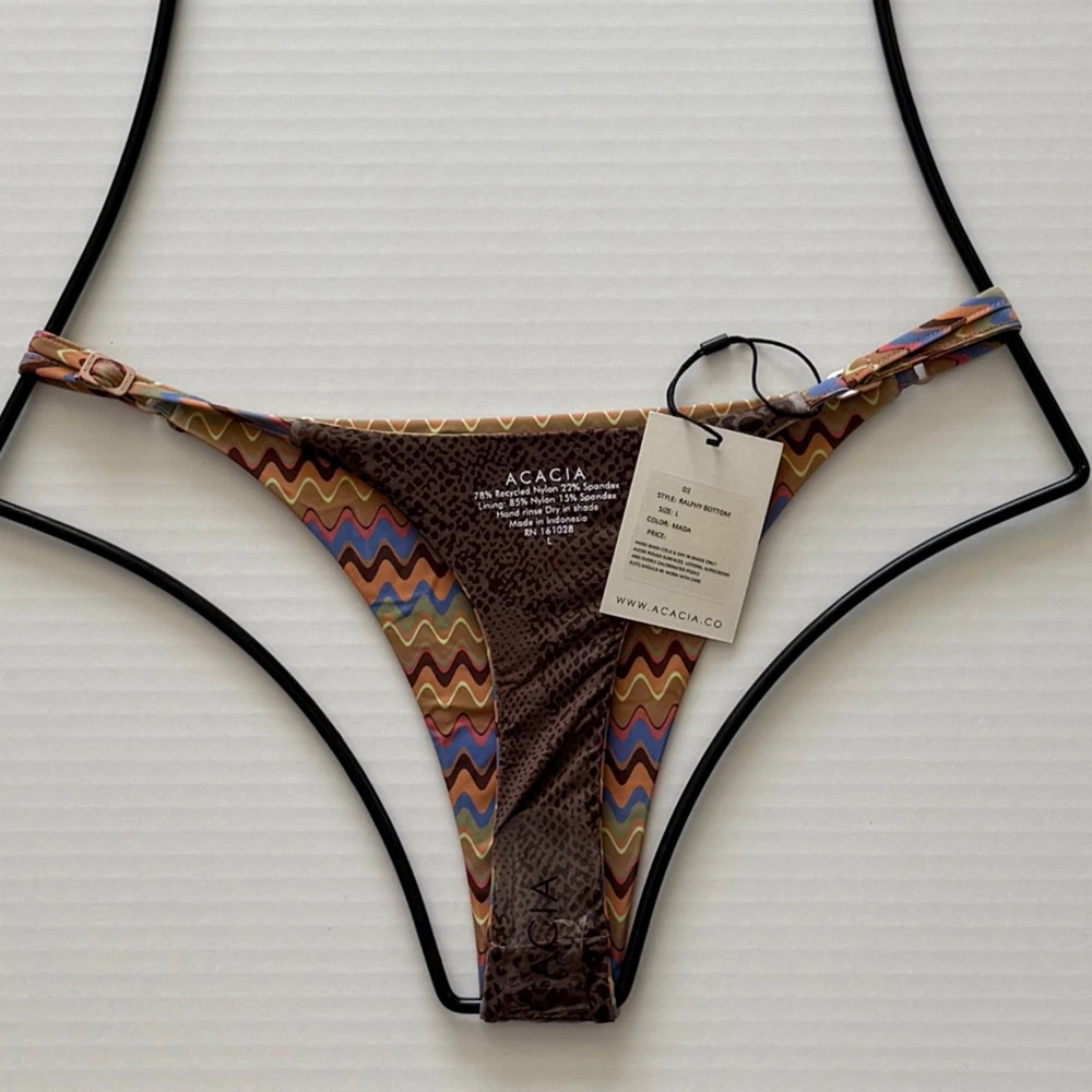 Acacia Swim Ralphy Bikini Bottom - Mada - High Cut, Minimal Coverage Size: Large Color: Mada Retail $119 Condition: Brand New with Tags Feel confident and radiant in the Acacia Swim Ralphy Bikini Bottom in the stunning Mada design. The high-cut hip and minimal coverage create a flattering silhouette that accentuates your best features. The eye-catching Mada print adds a touch of personality, while the premium recycled nylon blend provides a luxurious feel and a sustainable choice. The soft lining ensures maximum comfort, allowing you to move freely and enjoy your time in the sun. Minimal coverage bottom with a high cut hip Adjustable hardware on side straps Matte finish custom logo hardware 80% Recycled Nylon / 20% Spandex, Lining 85% Nylon / 15% Spandex Shop the Acacia Ralphy Bottom in Mada and get ready for a stylish summer! BRAND NEW WITH TAGS! ~~Please be certain of your size and fit before bidding. If you do not know your size in a specific item then you should try it on at your local retailer.~~ I am not responsible for buyers who do not read the entire auction descriptions. *ALL SALES ARE FINAL* NO EXCHANGES/RETURNS All of my swimwear is kept in sealed baggies to insure they are without defect. Come from a smoke & pet free home! ~~CHECK OUT MY OTHER AUCTIONS~~ I SELL LOTS OF ACACIA, BOND-EYE, BOYS + ARROWS, FRANKIE'S, L*SPACE, LULI FAMA, MINIMALE ANIMALE, MIKOH, VITAMIN A, VIX AND MANY MORE BRAND NAMES!!!! ABOUT PERFECT KINI: Perfect Kini strives for the best possible customer service. While we do not accept exchanges/returns, if you have any problems with or questions about your purchase, please let me know before you open any kind of case with or leave negative/neutral feedback. I will do my very best to make it right. 100% AUTHENTIC clothing manufacturer direct and or department stores. Most items are brand new with tags unless otherwise noted, some of these items don't have tags, or the inside tags have been cut or have a black line going through them (to prevent returns), but you'll get it at a fraction of the retail price. Most of our items are from CURRENT lines. Some are SOLD OUT in department stores or limited edition items. Other pieces are returns, store displays, or runway merchandise. Any flaws are disclosed and all items are described as accurately as possible, so please bid with confidence see my feedback! If you have any questions or concerns about any item, please feel free to contact us at any time. We value our many repeat customers and strive to provide a professional and pleasant experience for allers. PAYMENT INFO: • Please pay promptly. If you need more time please contact me, otherwise will automatically open an unpaid assistance case against you! • Ask all questions prior to bidding. • I do not accept returns for any reason other then if you received the wrong item than was listed. SHIPPING INFO: • Shipping will be by U.S. Postal Service First Class or Priority Mail. • Item(s) ship out same day if payment is received before 2pm • I ship fast! **I will only ship to YOU, to your name and your address that is 's Transaction Details page, no where else, no exceptions. Please ensure your correct name and address are CURRENT with both and Paypal prior to purchase because it can't be changed afterwards by me.** It is the BUYERS responsibility BEFORE PURCHASING to ensure that this shipping information is correct and up-to-date, it is not mine as the SELLER to do so afterwards. Sending me messages AFTER the sale to do manual address changes voids Buyer Protection &'s Money Back Guarantee provisions. INTERNATIONAL SHIPPING: • I offer 2 shipping methods- Global OR USPS International Flat Rate Please select the method you would like at check out. • You will be liable for all import duties, customs and taxes. These will be due at the point of, or after delivery. • Please be aware that I do not have any control for any duties, customs and taxes levied by the country your order is being shipped to. I cannot advise you what the cost will be as these charges can vary according to country. • Please contact your local customs office to find out more information if you are unsure of the charges.