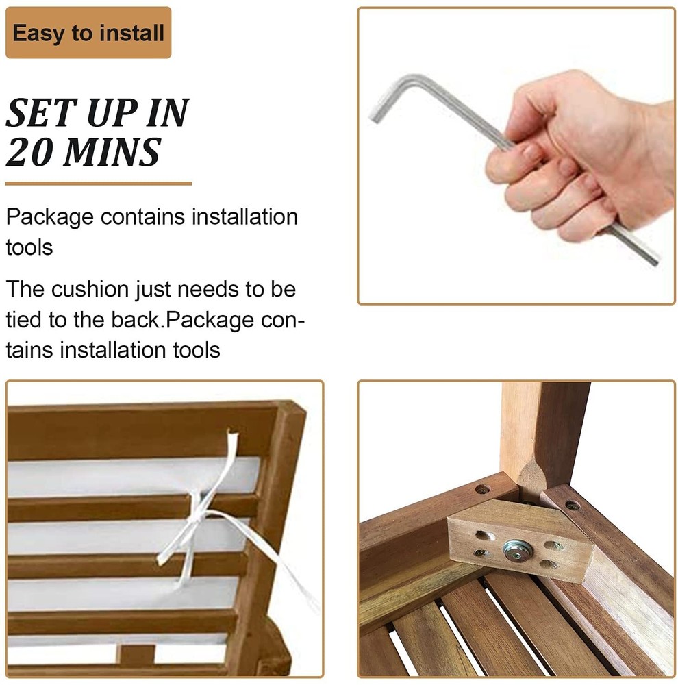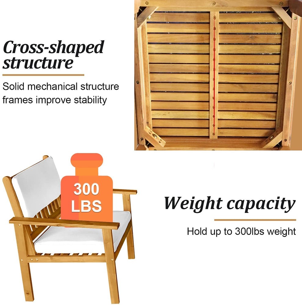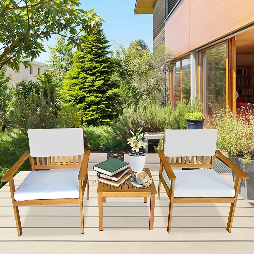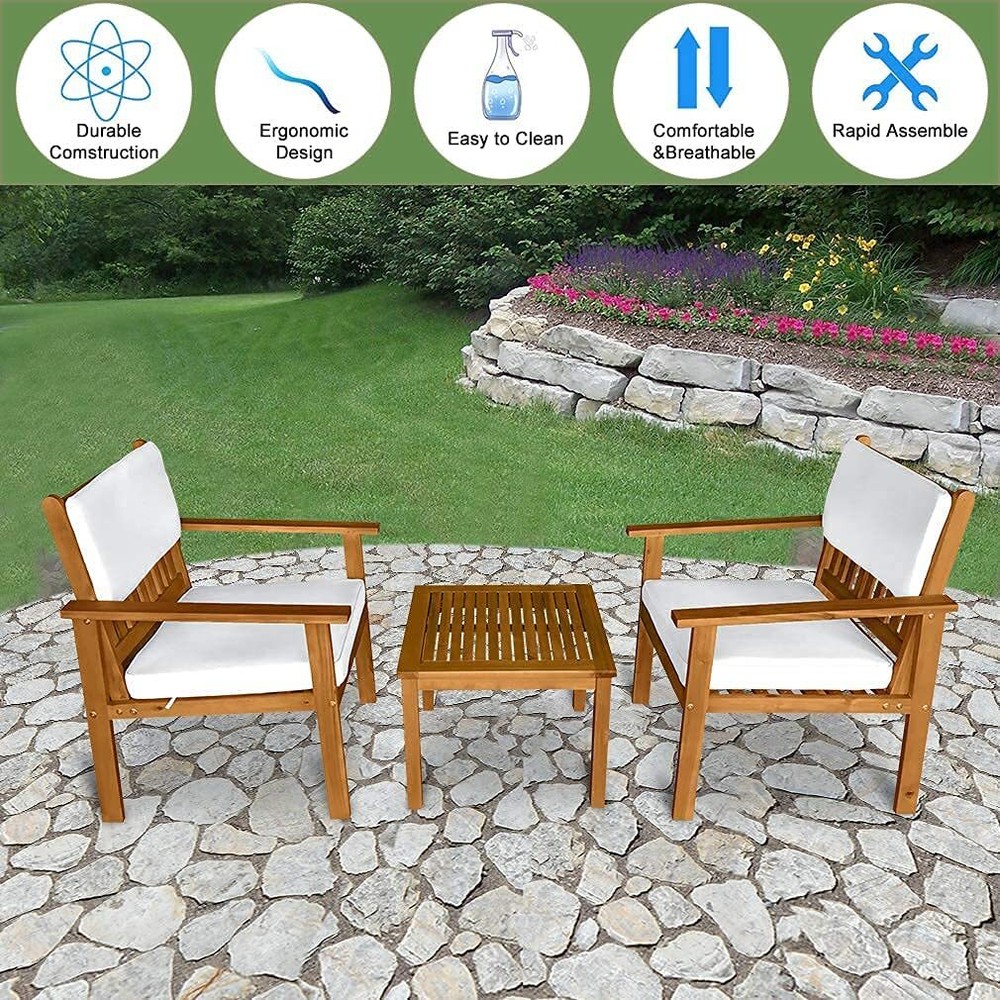 Acacia Wood Patio Porch Furniture Bistro Table Patio Chairs 3 Pieces Patio Set Dkeli created this rocking bistro set, which provides an ideal environment for sharing cocktails, watching the sunset or chatting with friends. 🚚Delivery time: Shipping from US warehouse, the delivery time is about 3-6 days. Feature: - The cushion of the chair set is made of high-density rebound sponge, giving you a comfortable sitting feeling. It has a zipper to take off the outwear for easy removal and cleaning. - The table in the patio furniture set is made of Acacia wood for drinks, food and any beautiful decorations. - Unique design is a nice touch of contemporary appeal, ideal for patio, poolside, porch and garden. - This patio rattan chair is made of real Acacia wood with a natural finish, very strong, stable and durable. - Acacia wood is strong and durable.Resistant to rain and corrosion. No splinter, rust, crack, chip or peel. - The classic openwork design and smooth surfaces create a patio chat set that's easy to clean. Not only provide you good support, but also sufficient airflow for a quick dry. - Easy assembly required. What’s included? 2× Patio Chairs 1× Coffee Table 2× Back Cushions 2× Seat Cushions 1x Instruction Specification: - Color: Natural - Cushion color: White - Material: Acacia Wood - Chair Dimensions: 24" W x 24" D x 31" H - Table Dimensions:20" W x 20" D x 15" H - Seat area: 24" W x 24" D - Seat cushion: 18" D x 20" W - Head cushion: 9” H x 20” W - Weight Capacity: 300lbs Payment Delivery details Return and Replacement: Feedback Contact us Payment We accept payment by Paypal only We only ship item to your PayPal verified address. Payment must be made within 7 Days from the date of purchase. Delivery details Fast shipping from Duluth, United States. It will take about 3-7 business days for delivery . Usually , US warehouse will ship the package within 1-3 business days after we receive your payment.(Sat. & Sun. & Public holiday excluded.) Orders placed on Friday night and weekend will be shipped on next Monday. Return and Replacement: If the package return to us because of address wrong ,Buyers are responsible for re-shipping cost. 1. If you are not satisfied when you receive your item, please return it within 14 days for money back. if the item have problems ,we Accept Return in 30 days for refund or replacement, goods in resalable condition.and we Offer 3 months for repair warranty. Buyers are responsible for return shipping cost with proper packaging and we pay the cost for reshipping.Please add a piece of paper written your eBay ID with the returned item that will help us process the replacement/refund accordingly. 2. Contact for address and reference number before return(note: unannounced parcel may be returned to wrong address, seller will not be responsible for this. 3. No factory warranty for the man-made damage. Feedback Please leave five stars positive feedback positive comment and Five-Stars. Contact us if you have any question, Give us a chance to serve you, negative feedback could not solve anything, communication Please! (NO) Three stars is LOW star, NO 1,2,3 stars PLEASE! (YES) Please give us Five-star! Have Question or Problem?? Step 1: Contact seller Step 2: Select the 1st topic: I have a question about using my item or I want to send the seller a message. NO others please! Select a topic: I have a question about using my item or I want to send the seller a message(0) (YES) YES, THIS ONE!!! We will try our best to solve online if possible, if not, will give correct return address. I did not receive my item(2)(NO) I need to return my item(1)(NO) I receive an item that was not as described(1)(NO) Request to cancel this order(1)(NO) Step 3: Describe your question clearly; we will give you the best solution Contact us If you have any problem, please feel free to contact us through eaby message. All emails will be answered within 24 hours. If you do not receive our reply, please kindly re-sent your email and we will reply to you as soon as possible. We believe we can produce a positive outcome to any situation and will work hard to solve your any problem.We greatly appreciate your POSITIVE feedback. Please do NOT leave negative feedback without contact us for help.