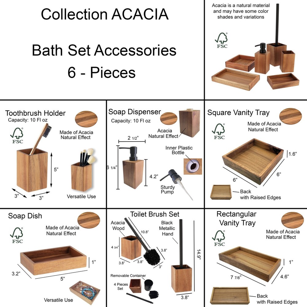 Add a touch of farmhouse charm to your bathroom with this Acacia Wood Bathroom Accessory Set Collection. The living and hygroscopic Acacia material makes this set durable and moisture-resistant, perfect for high-humidity environments. Choose from a selection of pieces including a tumbler, soap dispenser, soap dish, tray, waste basket and toilet bowl brush to complete your bathroom decor. This versatile set is suitable for use in master, guest, or kids' bathrooms, as well as kitchens and vanities. It also makes for an ideal gift for ladies and girls on special occasions.Features: Natural design with unique style Living and hygroscopic Acacia material Versatile set suitable for multiple spaces Convenient selection of pieces to choose from Ideal gift for ladies and girls Free Shipping Over $49.99* Details Acacia Wood Bathroom Accessory Set Collection Product Description: Add a touch of farmhouse charm to your bathroom with this Acacia Wood Bathroom Accessory Set Collection. The living and hygroscopic Acacia material makes this set durable and moisture-resistant, perfect for high-humidity environments. Choose from a selection of pieces including a tumbler, soap dispenser, soap dish, tray, waste basket and toilet bowl brush to complete your bathroom decor. This versatile set is suitable for use in master, guest, or kids' bathrooms, as well as kitchens and vanities. It also makes for an ideal gift for ladies and girls on special occasions. Features: Natural design with unique style Living and hygroscopic Acacia material Versatile set suitable for multiple spaces Convenient selection of pieces to choose from Ideal gift for ladies and girls