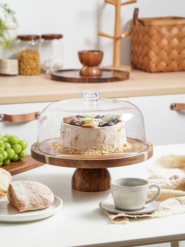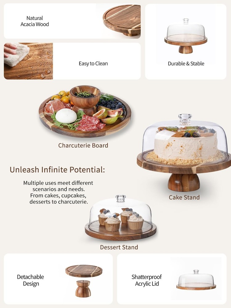 This multipurpose cake stand with lid is a unique cake stand with many functions and uses. Use it as a Cake tray, serving dish, punch bowl, chips and salsa plate, salad bowl, and baking goods stand. Simply invert the dome or plate to create any type of serving dish. Wedding registry must haves. ELEVATE YOUR DESSERT TABLE: Elevate your baking creations into stunning centerpieces with the Acacia Wood Cake Stand with Acrylic Lid. This large cake stand with dome is designed to showcase cakes up to 4 inches tall and less than 10.5 inches in diameter. It will make an eye-catching centerpiece for buffet-style dinners or holiday parties. A MULTI-USE DISPLAY STAND - The versatility of the wooden cake stand with a lid doesn't stop there. Flip the cake stand upside down, and it turns into a charcuterie board, a stylish platform for chips and dips, or a vibrant fruit bowl with flair. Additionally, this cake display stand features a detachable base design. You can keep the base for direct use or disassemble it as needed to create a flat cake plate. ACACIA WOOD CAKE STAND- Unlike other cake stands for party, this one is made from 100% premium Acacia wood, resistant to bending and cracking. Sourced from nature, each piece is unique in color and grain. Note: Wood material is not dishwasher safe. Daily care can be done using gentle methods like wiping with a damp cloth. SHATTERPROOF ACRYLIC DOME LID - Say goodbye to fragile and heavy glass domes. This dome lid is made of highly transparent and unbreakable acrylic, lightweight yet sturdy, and easy to carry and clean. It locks in freshness, offering great airtight storage for pastries! Plus, with a nice fit, the lid and stand can easily be stored together. GREAT FOR DECORATING AND ENTERTAINMENT - Crafted from beautiful Acacia wood, this 2 in 1 serving platter with lid exudes warm, natural sophistication. It is ideal for birthday parties, baby showers, weddings, anniversaries,Halloween, Thanksgiving, Christmas, or other events. When not in use for hosting a party, it can serve as an everyday centerpiece with candles and seasonal decor, making it an ideal addition to home decor. This versatile cake stand with cover also serves as a thoughtful and practical present for friends and family.
