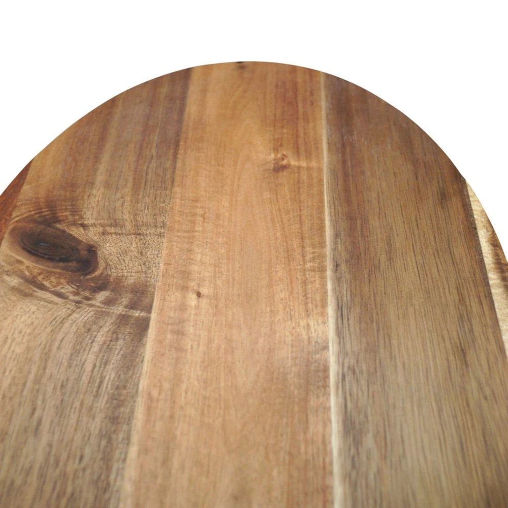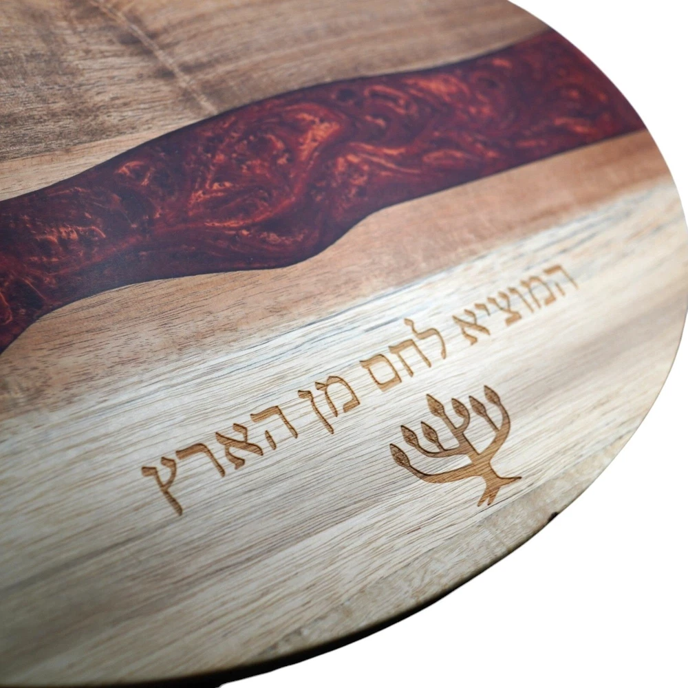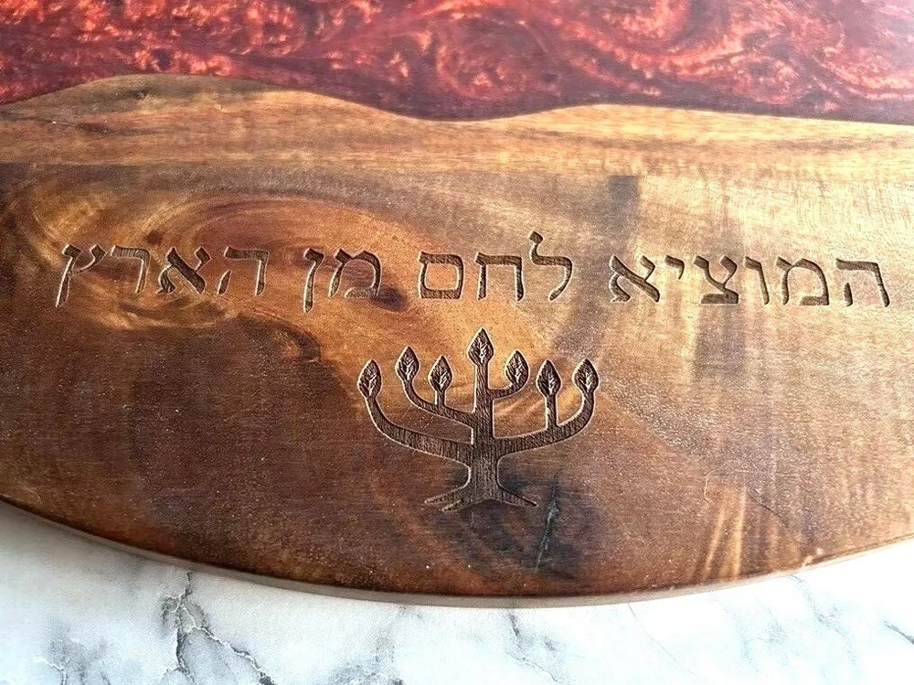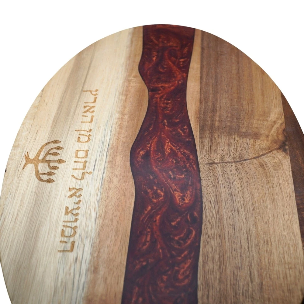 Beautiful challah cutting board made from acacia wood with burgundy resin stream. Oval at approximately 9" x 13". Engraved with hamotzi lehem min ha'aretz and a stylized menorah tree. A unique treasure for your shabbat and holiday table. Perfect for Shabbat, Yom Tov, or any festive gathering, enhancing your mealtime experience with style and functionality.