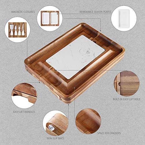 Return Policy Fast Delivery Trusted seller Acacia Wood Cheese Board Set, Square Cheese Platter with 2 Slide-Out Drawers& Cutlery Set& Snack Plates& Marble Cheese Slate, Perfect Charcuterie Board for Serving Appetizers and Fruits (White) Product Description PREMIUM ACACIA WOOD: Our cheese board is made from premium acacia wood, which is famous for its rich, contrasting colour and natural lustre. By rubbing a little mineral oil into the natural wood surface on a regular basis, your product will look like new for years to come. CHEESE BOARD FEATURES: With a perfect size of 14.9 x 10.8inches, you can place cheeses, biscuits, sandwiches, breads, grapes and chutneys on it together. Moreover, every cheese board set comes with a removable marble cheese slate, which means you will get an extra serving area of 9.3X5.6inches to fill up with your favorites snacks or appetizers. Please note all dimensions are measured manually, the deviation within 1-2 mm. SPACE-SAVING PULL-OUT DRAWERS: Our cheese serving board has two concealed beautiful drawers to hold its cheese knives and removable snack plates. Magnets keep the drawers from sliding out when closed, which is place-saving and will keep all things in order. 4 plastic non-slip mats are attached on the bottom of our cheese board, which is a good idea to avoid it from sliding away accidentally. EUROPEAN-GRADE SILICONE PLATES & 2 HIDDEN PLATES: The snack plate is stronger, more flexible and durable to maintain its original shape and non-stick quality after hundreds of uses. Plus, Take out the removable silicon plates from the drawer, then two more space you will get to serve your guests. So as to clean easily, we suggest to use the silicon plates to serve wet appetizer while the built-in plates for dry appetizer. IDEAL CHRISTMAS GIFT: With so many fantastic features, beautiful aesthetics and luxurious gift-ready package, this 2-pieces professional knives with mini sharpener will be a perfect gift ever. Make someone’s Wedding Day, Anniversary, Housewarming Parties, Birthday, Christmas or any other events extra-happy and give them this gift of . Shipping Returns Payment Shipping Shipping is FREE to all addresses other than APO/PO boxes in the lower 48 states. All our stock ships from US-based warehouses. Shipped via USPS or UPS (depending on location and package weight) Unless stated otherwise, all orders will ship within 24-72 hours of your payment being processed. Check our feedback to see the great reviews of FAST shipping we offer. Returns Seller does not accept returns Payment We currently accept payment via eBay managed payments only. Once payment is cleared, we will dispatch your shipment within 1-3 business days. Please refer to the "Shipping" tab for more information regarding shipping speed to your destination.