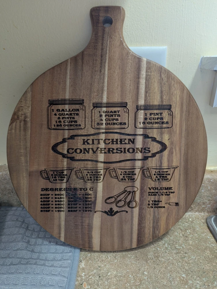 The Acaia Acacia Wood Cutting Board is a round board measuring 14" x 11.6" with a thickness of 0.8". Made of sturdy wood, it features convenient handles for easy carrying. The board is engraved with useful kitchen conversion measurements, adding a practical touch to its elegant design. Perfect for slicing and dicing ingredients, this cutting board is a versatile addition to any kitchen. I also have these boards that are blank and ready to be engraved with your favorite handwritten recipe of your grandmother, mother, father, aunt, all you have to do is send me a clear picture of the recipe or any other personalization you would like to have engraved on the board. These would make cherished memories that you can enjoy for a long time.