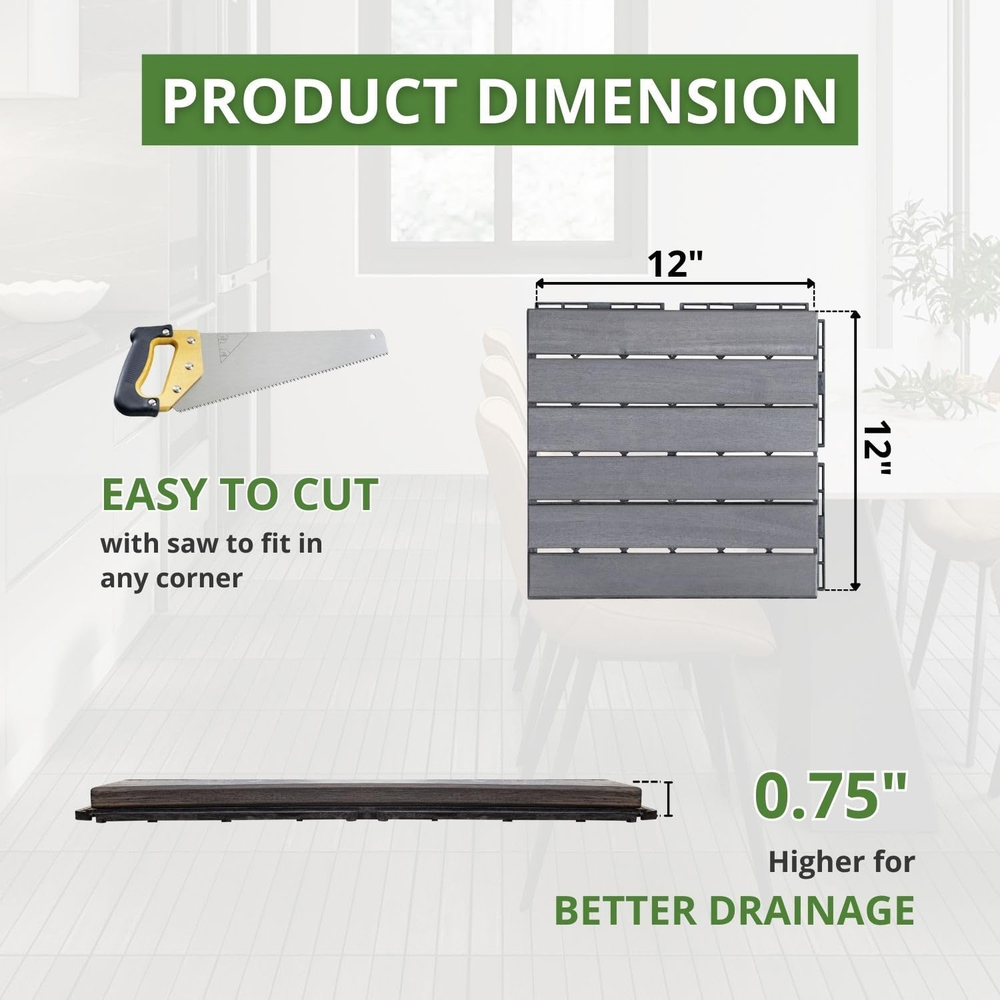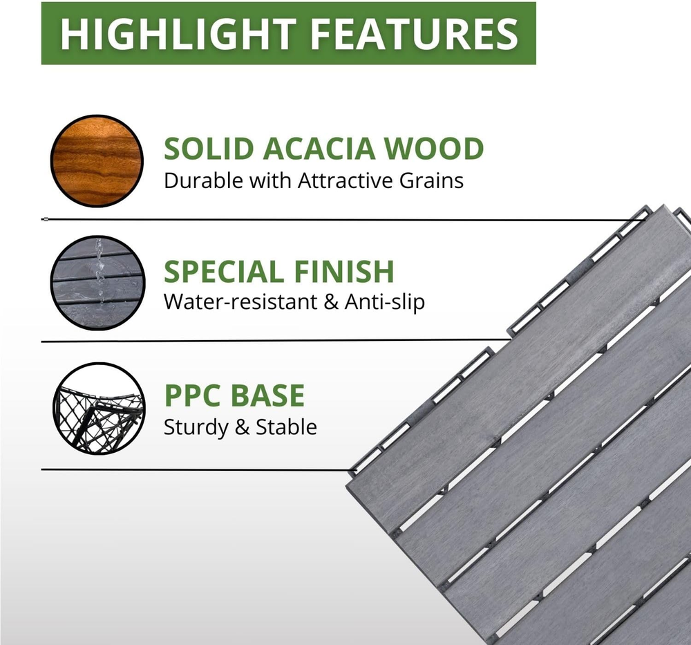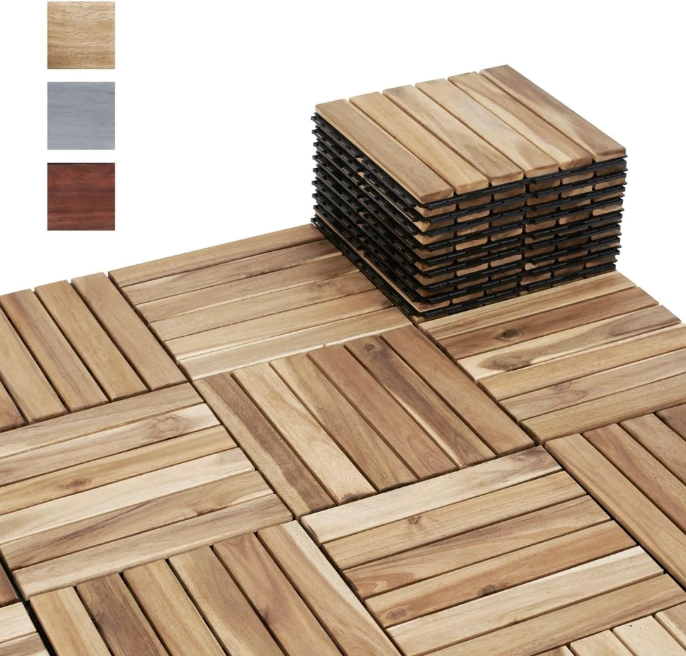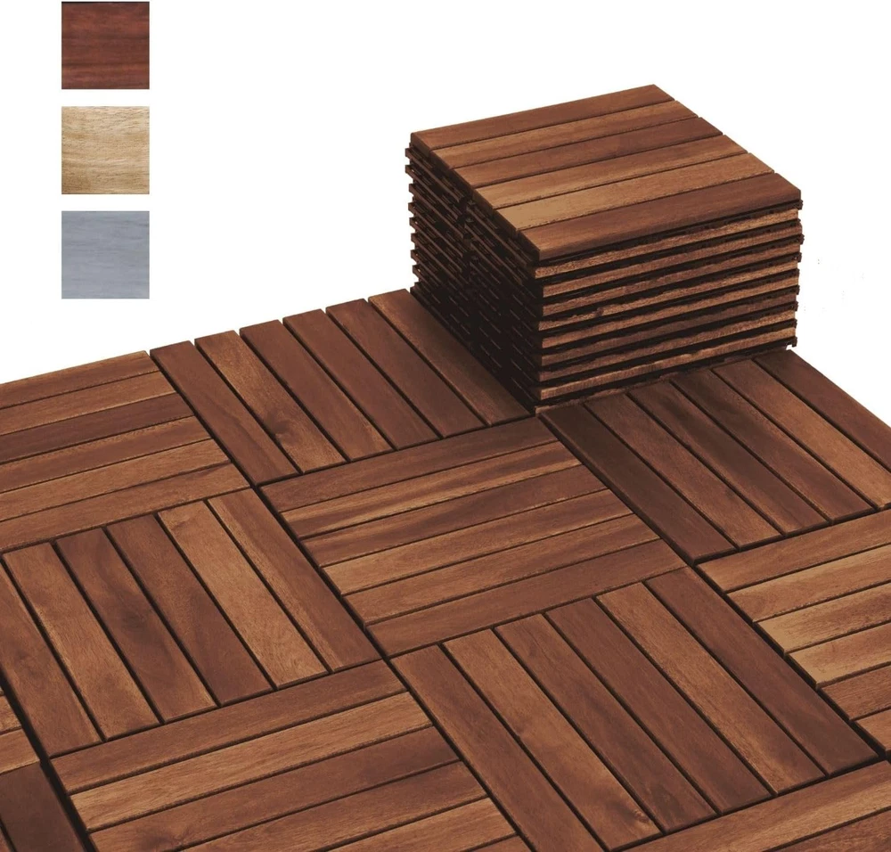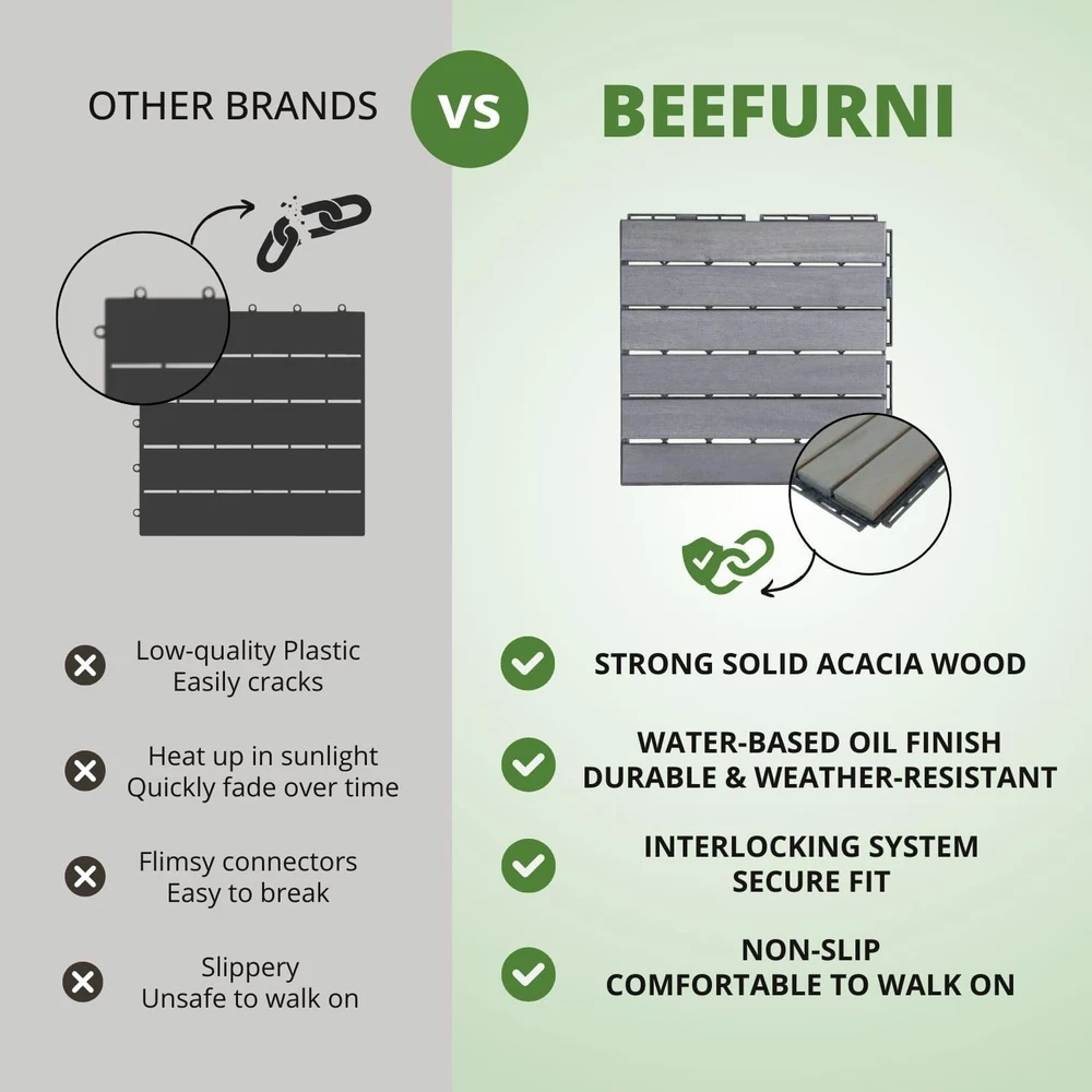 Store New Arrivals Add to Favorite View Feedback Contact Acacia Wood Deck Flooring Tiles Interlocking 12" X 12" All Weather Outdoor NEW Description Part Number BF03002_1 Finish Premium Item Package Quantity 1 Color Striped Pattern Light Grey Material Acacia wood Country of Origin Vietnam Item Weight 14 pounds Shape Square Item Form Sheet Size Pack of 10 πππππππππ πππ: Give your outdoor patio, balcony, outdoor shower enclosure a makeover with our versatile wood interlocking deck tiles. A perfect choice with durability for both indoor and outdoor spaces. ππππ ππππππππ: Assemble effortlessly with our wood patio tiles interlocking system. Easy to customize to fit any space with saw. Detailed installation instructions included. πππππππ ππππππππ: Made from solid Acacia wood and finished with water-based oil, our interlocking wood tiles feature a sturdy PPC plastic base. Weather and water-resistant, they promise years of durability. ππ π ππππππ πππππππππ: With a thickness of 0.75 inches and a slat design, our wood deck tiles ensure rapid water drainage. Walk with comfort on a consistently dry surface of this wood deck. πππππ πππππππ'π ππππππππ: Within 1 year after the purchase date, if there is a manufacturing defect, your patio wooden tiles will be replaced for you free of charge. ππππ: Our interlocking wood deck should be installed on solid level surfaces. During snow season, kindly disassemble these wooden patio tiles for storage. Maintain them with wood oil every six month to preserve their beauty. Product Description FRESHEN UP YOUR OUTDOOR SPACE NOTE: Due to Acacia wood's natural distinction and varying environments, the color of our wood deck tiles may slightly differ from the images shown. PERFECT FOR OUTDOOR & INDOOR SPACES HIGHLIGHT FEATURES SOLID ACACIA WOOD Made of solid Acacia wood, these deck tiles has attractive wood grains and offer superior durability compared to plastic interlocking deck tiles. STRONG PPC PLASTIC BASE The interlocking system supported by sturdy PPC plastic base ensures quick assembly and a durable structure for the patio tiles. SPECIAL COATING Coated with water-based oil, Beefurni tiles are durable & water-resistant. They provide versatile flooring solutions, both indoors and outdoors. 0.75 INCH THICKNESS Our patio wood tiles' thickness of 0.75 and slat design allows better water drainage, providing a comfortable and dry surface to walk on. ASSEMBLY INSTRUCTIONS Please help us watch and follow this video to assemble our wood deck tiles. Find A Tile and B Tile with sides as described in the picture. Place B tile under the floor, align the sides of these tiles together, then tilt A tile at an angle of 30 degrees with one hand. Always hold Tile A at 30 degrees angle during snapping. Use the other hand or a rubber hammer to firmly press A tile down to connect correctly to the holes of B tile. When you hear a βclicking soundβ, the tiles are snapped. HOW MUCH DECK TILES WILL YOU NEED? Inspired by the hard working bees MANUFACTURER FROM VIETNAM Unlike other brands, BEEFURNI is the manufacturer of our own products , which gives us full control of the production process. We constantly improve our products based on our customer's demands and reviews so that the items arrived at your hands are of the FINEST quality. ABOUT US "Discover unbeatable prices on top-notch products in our E-store. Explore a wide range including books, movies, music, games, electronics, toys, sporting apparel, clothing, tools, home essentials, garden items, and much more." SHIPPING "We strive to expedite your package delivery, but factors like weather and postal traffic are beyond our control. Free shipping to the lower 48 states within 5 business days of payment (usually sooner). No P.O. Boxes; provide a physical address. For non-continental USA shipping, we exclusively use eBay's Global Shipping Program. The item is shipped to KY and then globally. International customers handle duties and taxes. Check out to calculate shipping costs. Direct all eBay Global Shipping Program inquiries to eBay ONLY." RETURNS "We offer a 30-Day Return Policy for items not meeting your satisfaction. Please contact us before purchasing a return label from eBay. If the item is not as described or damaged, we provide a free return label. Upon receiving the item, you can choose a full refund or exchange. For returns due to personal preference or ordering mistakes, a $5 return fee applies. If you initiate a return with eBay without contacting us first, the return cost will be deducted from the refund. Your satisfaction is our priority. Please reach out, and we'll collaborate to resolve any issues. Customer satisfaction guaranteed." PAYMENT We accept PayPal. CONTACT US This page content is yet to come Please ad us to your favorite seller and visit again later Thank You CUSTOMER SATISFACTION "We strive to ensure every customer's complete satisfaction. If any issues arise, please feel free to message us β we are here to assist you with a smile!" WE ACCEPT Copyright Β© 2021 AutoDS. | All Rights Reserved