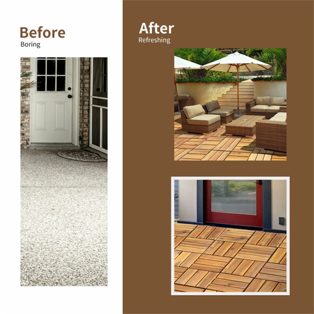 ● Versatile Flooring Tiles: These patio deck tiles are designed for you to easily renovate the boring floors of your living spaces. And it is also a great choice to take some tiles to form a floor mat or pave a track on your lawn. These flooring tiles are the ideal building material to make a refurbishment for the sun terrace, living room, deck, and more. ● Fast Install with Interlocking: There are premium plastic mats under those logs with hooks and hoops for no-tool paving. And if you encounter some wall projections, easily cut these interlocking tiles with a small handsaw to ensure they perfectly fit any space you need. In addition, it is easy to remove and will not ruin your old floor. ● Solid Acacia Log: Made of natural hardwood material, the tile is built to last for years. It is already pre-wax oiled, which can withstand daily rubbing and stepping. And the natural elements also bring your living spaces a real hardwood floor with a fresh pastoral. ● Easy Maintain: With proper maintenance, you can successfully extend the life span of those decking tiles. Those tiles can stay brand new for at least one year under your roof. It is recommended to oil the flooring every 2 or 3 months if placed outside. ● 27 Packs for Covering Area of 27 Sq. Ft: Each tile is measured 12" x 12" x 1" (L x W x H) with several slats to enhancing ventilation. And 27 pcs flooring tiles make a whole paving area of 27 sq. Ft. Please carefully measure the floor you are about to modify before making any order. Specifications Color:Natural Material:Acacia wood, plastic Product dimension:12" x 12" x 1" (L x W x L) Covering area:27 sq.ft Net weight:42 lbs