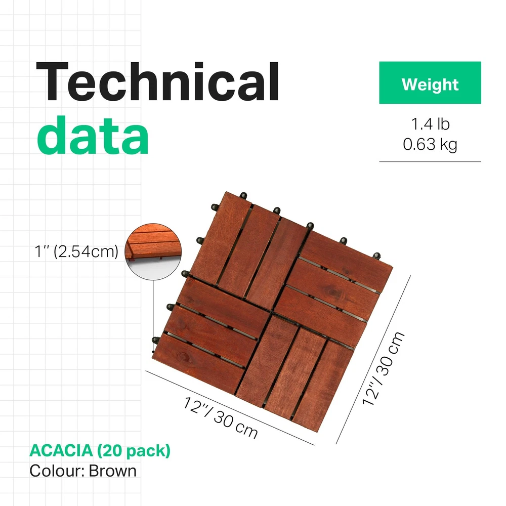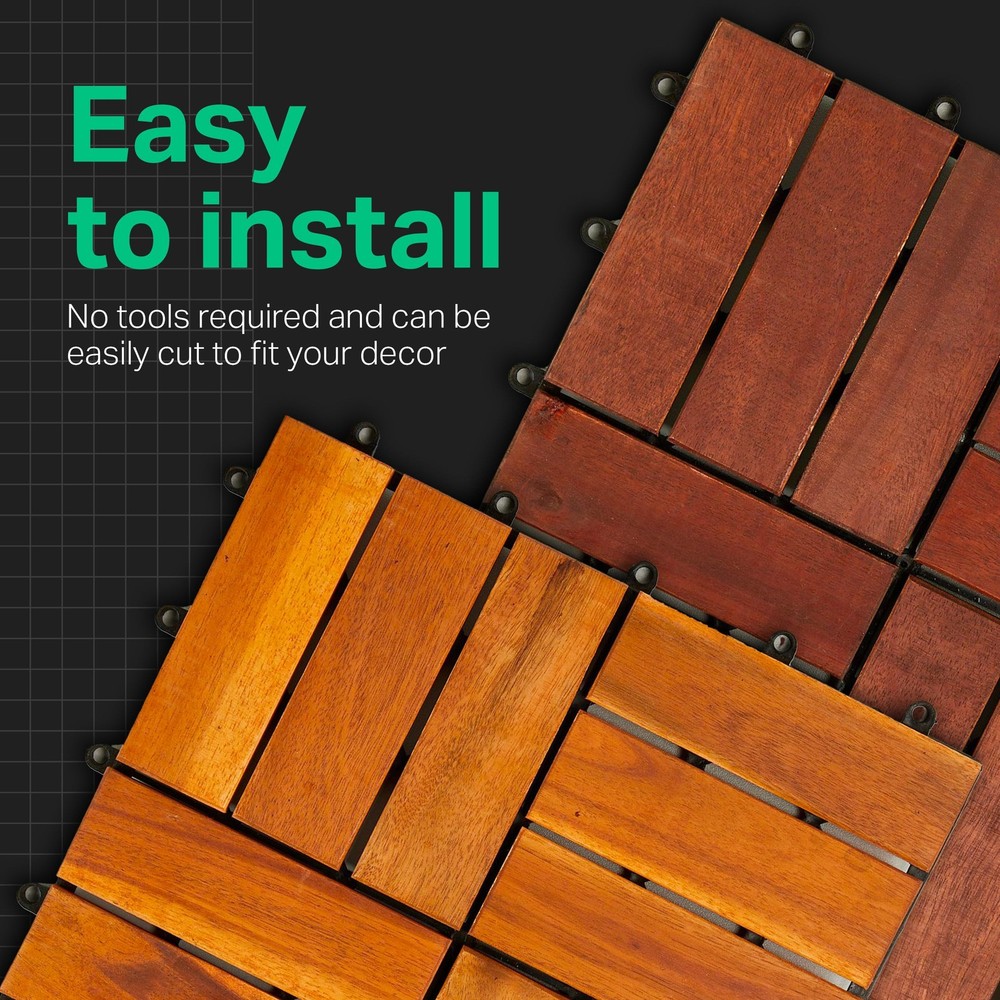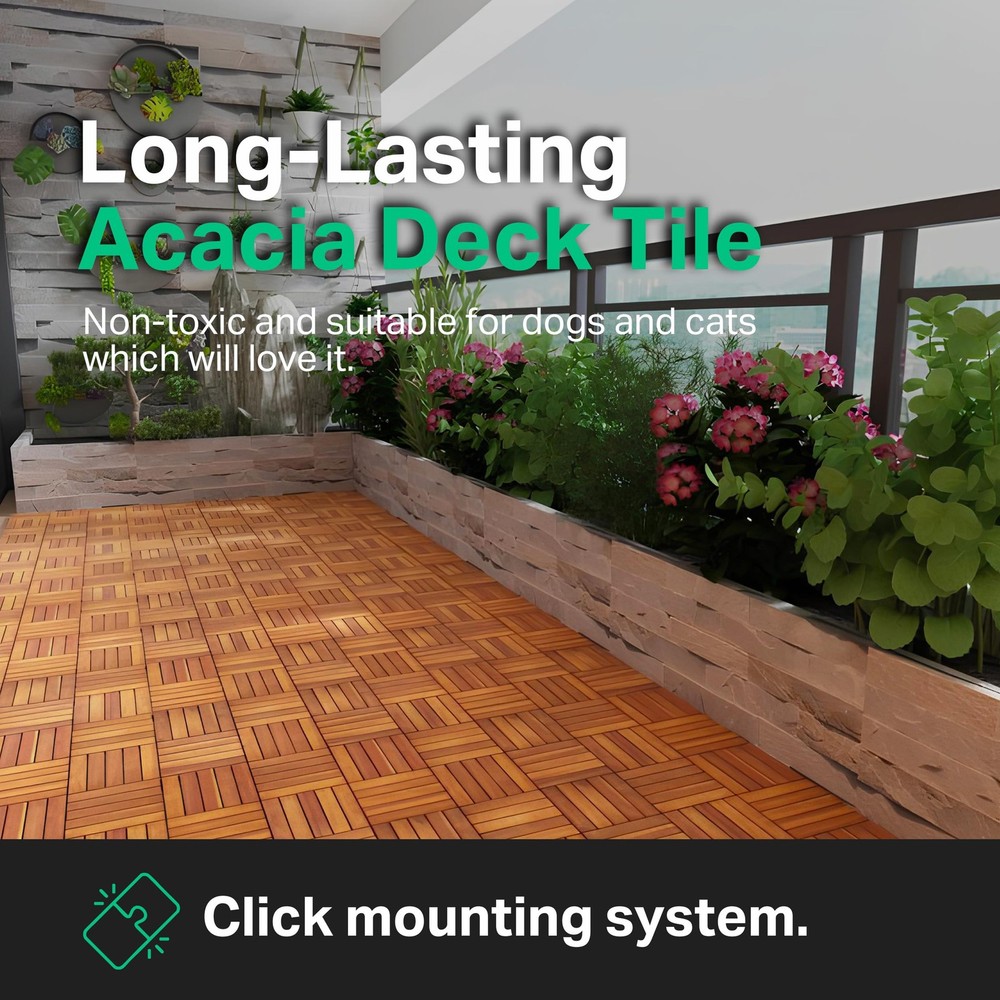 Acacia Deck Tile – Ground Covering Interlocking System HIGH-QUALITY LOCKING SYSTEM: A DIY product perfect to change the look of your backyard, patio or balcony. Weatherproof, so no need to remove them for Winter. ADD CHIC TO INDOOR OR OUTDOOR: Ideal for decks, patios, playgrounds, or even balconies, enjoy a beautiful look all year round. They are non-toxic so they are suitable for pets which will love it. GREAT WATER DRAINAGE: The backing is porous and provides excellent drainage. The tiles are made of 100% Acacia wood; therefore, they will last for many years with minimal maintenance. EASY TO INSTALL: It is strongly recommended that you ensure that your flooring is compatible with receiving a carpet with plastic backing. HIGH-QUALITY MATERIALS: The base is made of 100% recycled plastic. The top is made of 100% FSC Acacia wood.