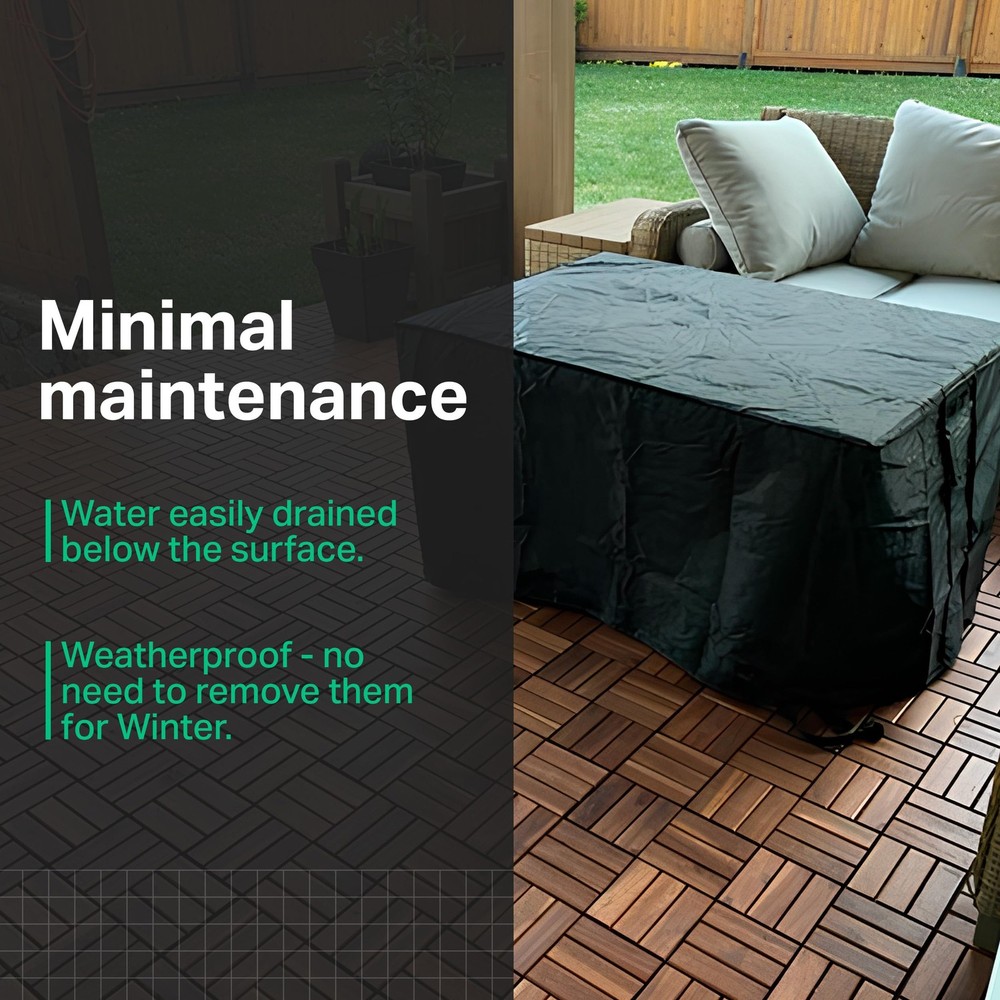 Acacia Deck Tile – Ground Covering Interlocking System HIGH-QUALITY LOCKING SYSTEM: A DIY product perfect to change the look of your backyard, patio or balcony. Weatherproof, so no need to remove them for Winter. ADD CHIC TO INDOOR OR OUTDOOR: Ideal for decks, patios, playgrounds, or even balconies, enjoy a beautiful look all year round. They are non-toxic so they are suitable for pets which will love it. GREAT WATER DRAINAGE: The backing is porous and provides excellent drainage. The tiles are made of 100% Acacia wood; therefore, they will last for many years with minimal maintenance. EASY TO INSTALL: It is strongly recommended that you ensure that your flooring is compatible with receiving a carpet with plastic backing. HIGH-QUALITY MATERIALS: The base is made of 100% recycled plastic. The top is made of 100% FSC Acacia wood.