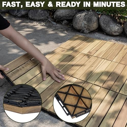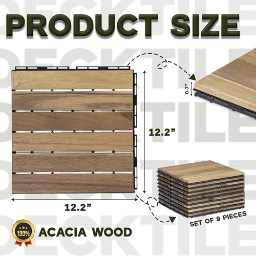 Return Policy Fast Delivery Trusted seller Acacia Wood Flooring Interlocking Deck Tiles for Patio Decor 9 Pcs 6 Slats VR White Oak - Waterproof Indoor & Outdoor Decor - Balcony Garden Decking Tile (12.24 * 12.24 * 0.75 inches) Product Description PREMIUM ACACIA WOOD: Made from high-quality acacia wood, these patio deck tiles are durable, weather-resistant and built to last. They withstand daily use while maintaining their beauty, providing a stylish and reliable solution for outdoor flooring. VERSATILE USAGE: These acacia wood patio deck tiles are perfect for both indoor and outdoor spaces, including patios,balconies and gardens. Their adaptable design effortlessly enhances any environment, adding both style and functionality to any area. ANTI-SLIP DESIGN: Engineered for maximum traction and stability, these patio deck tiles reduce slips and falls. Ideal for swimming pools, balconies, and high-traffic outdoor areas, they provide a secure and reliable surface in various conditions. EFFORTLESS ASSEMBLY: These patio deck tiles feature a simple interlocking system, allowing quick and secure installation without tools or expertise. The hook fitting design s together like puzzle pieces, making assembly easy and fun for anyone. SMART DRAINAGE SYSTEM: Our patio deck tiles feature a specially designed base with drainage channels to efficiently direct water away, preventing pooling and moisture damage. These durable tiles support up to 440 pounds, ensuring a sturdy and reliable solution for your outdoor space. Shipping Returns Payment Shipping Shipping is FREE to all addresses other than APO/PO boxes in the lower 48 states. All our stock ships from US-based warehouses. Shipped via USPS or UPS (depending on location and package weight) Unless stated otherwise, all orders will ship within 24-72 hours of your payment being processed. Check our feedback to see the great reviews of FAST shipping we offer. Returns Seller does not accept returns Payment We currently accept payment via eBay managed payments only. Once payment is cleared, we will dispatch your shipment within 1-3 business days. Please refer to the "Shipping" tab for more information regarding shipping speed to your destination.