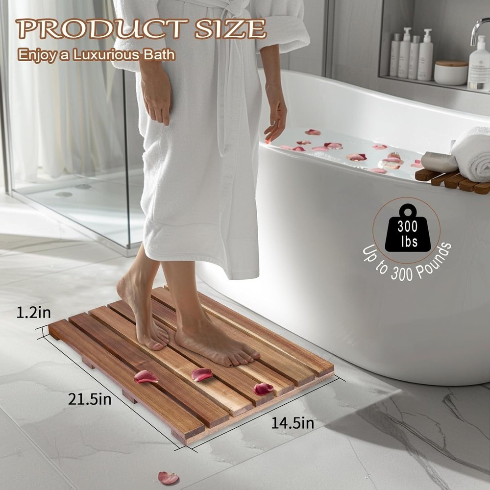 Acacia Wood Luxury Bath Mat, Non Slip Bathtub & Shower Mat for Bathroom, Easy to Clean Waterproof Heavy Duty Shower Floor Mat for Spa Garden Pool RV Indoor & Outdoor Use (21.5" L x 14.5" W x 1.2" H) 【Sturdy & Durable】This wood bathtub mat comes fully assembled upon receipt. It measures 21.5 x 14.5 x 1.2 inches, crafted with excellent workmanship and a stable structure, capable of withstanding up to 300lbs. It is durable and resistant to deformation and cracking during long-term use. 【Non-Slip Design】The shower mat is equipped with 16 rubber non-slip mats to protect the floor from scratches, provide support, and prevent slipping when used in the bathroom or other wet areas, ensuring your safety. 【Premium Materials】This bath mat is crafted from 100% soild Acacia wood, featuring beautiful wood grain and tones that offer a unique aesthetic appeal matching various decor styles. Compared to bamboo mats, it boasts superior waterproof performance, hardness, and easier cleaning. 【Smooth Waterproof Surface】The shower mat undergoes a three-layer waterproof treatment for enhanced waterproof performance. Chamfered edges and narrower gaps between the wood strips ensure comfortable standing and faster surface drying, preventing water from pooling around your feet. 【Versatile Use】The luxurious bath mat is perfect for both indoor and outdoor use, keeping your feet off the cold ground. Ideal for use in bathrooms, poolside, bathtubs, saunas, RVs, and more, making it a thoughtful gift for friends and family. Shipping We offer FREE shipping on all orders! We ship within Three business days of payment, usually sooner. We use a selection of shipping services such as UPS, FedEx, USPS etc. We only ship to the lower 48 states, no APO/FPO addresses or PO Boxes allowed. Local pickups and combined shipping options are not provided at this time. Return You can return a product for up to 30 days from the date you purchased it. Any product you return must be in the same condition you received it and in the original packaging. Please keep the receipt. Payment We accept payment by any of the following methods: PayPal Please pay as soon as possible after winning an auction, as that will allow us to post your item to you sooner! Feedback Customer satisfaction is very important to us. If you have any problem with your order, please contact us and we will do our best to make you satisfied. Contact Us If you have any queries, please contact us via ebay. We usually respond within 24 hours on weekdays. Please visit our eBay store to check out other items for sale! Thank you for shopping at our store.