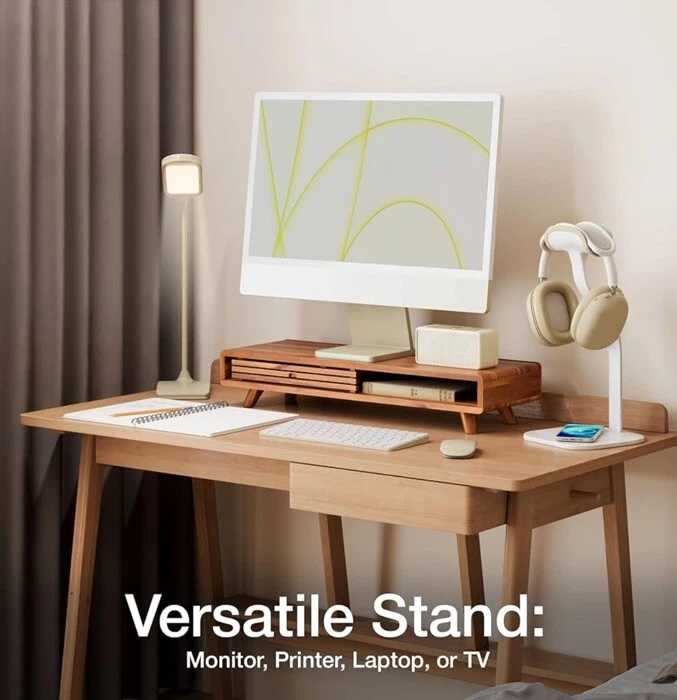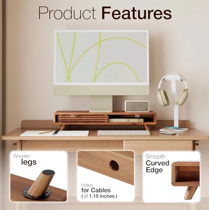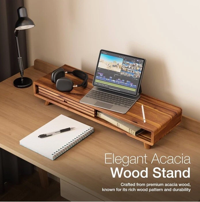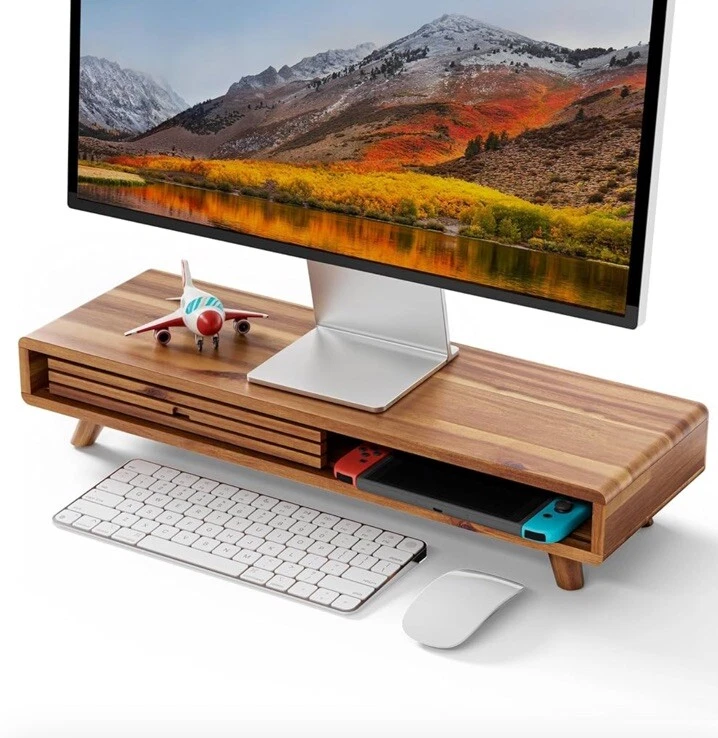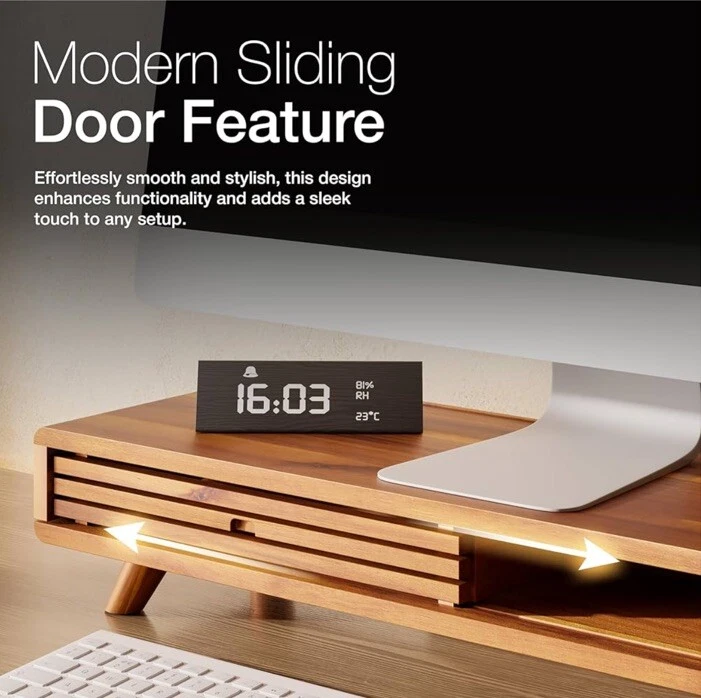 Premium Material: Constructed from high-quality Acacia wood, this Monitor Stand Riser complemented by a metal plate for added durability and non-skid pads to keep the stand securely in place, offering a sleek and sophisticated look for any desktop or computer setup. Sliding Door Design: The stand features a sliding door that provides convenient access to a spacious compartment, perfect for storing office supplies, keyboards, or other essentials, keeping your workspace tidy. Ergonomic Comfort: Elevates your monitor to create a comfortable and ergonomic viewing position, promoting better posture and reducing eye strain. Multi-Use Functionality: Ideal for a variety of devices including monitors, printers, laptops, and even TVs, making it a versatile addition to any workspace. Ideal for both home and office environments, accommodating high and long risers Easy Installation: The stand comes with all necessary hardware, making the assembly process hassle-free and straightforward.