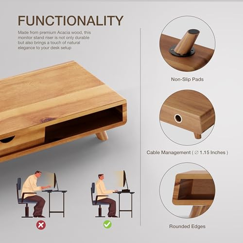 Return Policy Fast Delivery Trusted seller Acacia Wood Monitor Stand with Drawer - Wooden Monitor Riser for Desk - Computer Monitor Stand for Desk - Multi-Purpose Desktop Storage Stand for Computer; Laptop; Printer; TV(24.4 " x 8" x 5") Product Description Natural Material: Crafted from premium Acacia wood, this monitor stand is both durable and visually appealing. Acacia wood is known for its rich color and fine pattern, making it a stylish addition to any workspace. The natural wood finish ensures longevity and adds a touch of sophistication. Ample Storage: Includes 1 drawer for hidden storage, perfect for keeping your desk clutter-free. The drawer is spacious enough to store small office supplies, documents, or personal items. Additionally, the 2 shelf organizers offer convenient access to frequently used items, such as notepads, pens, or external drives. Efficient Cable Management: Designed with a built-in hole at the back for efficient cable management. This feature allows you to neatly route cables, keeping your workspace tidy and organized. It helps reduce clutter and prevents cables from tangling, which can be both unsightly and inconvenient. Ergonomic Benefits: Elevates your monitor to a comfortable viewing height, reducing neck and eye strain. By positioning your monitor at eye level, this stand promotes better posture and helps alleviate discomfort during long hours of computer use. This ergonomic benefit can enhance productivity and overall well Meticulous Design: The design features meticulous rounded edges for a sleek and safe finish. This careful detailing not only enhances the aesthetic appeal but also prevents any accidental bumps or scratches. The smooth, rounded corners provide a polished look that complements any desk setup. Shipping Returns Payment Shipping Shipping is FREE to all addresses other than APO/PO boxes in the lower 48 states. All our stock ships from US-based warehouses. Shipped via USPS or UPS (depending on location and package weight) Unless stated otherwise, all orders will ship within 24-72 hours of your payment being processed. Check our feedback to see the great reviews of FAST shipping we offer. Returns Seller does not accept returns Payment We currently accept payment via eBay managed payments only. Once payment is cleared, we will dispatch your shipment within 1-3 business days. Please refer to the "Shipping" tab for more information regarding shipping speed to your destination.