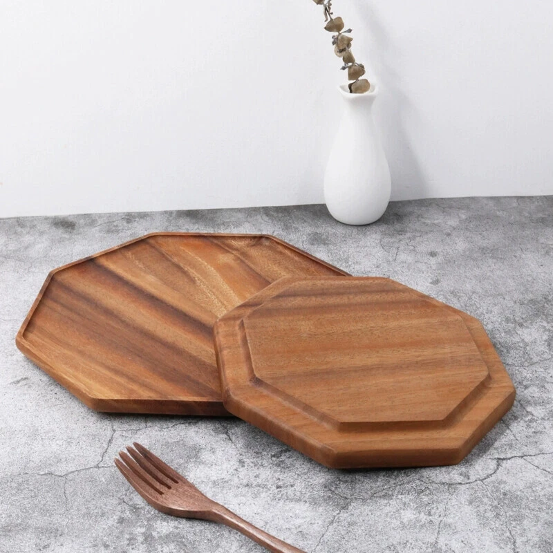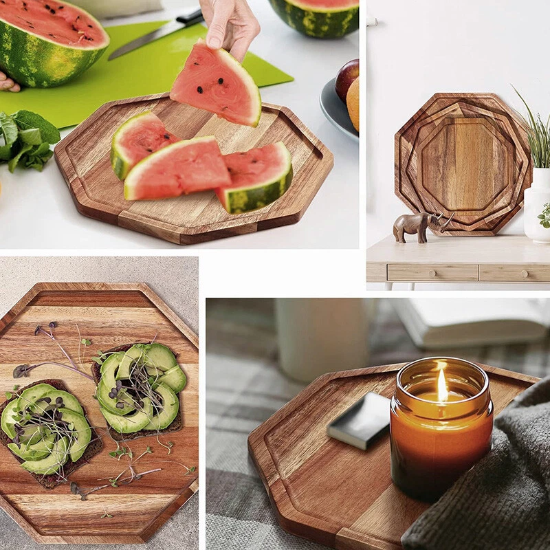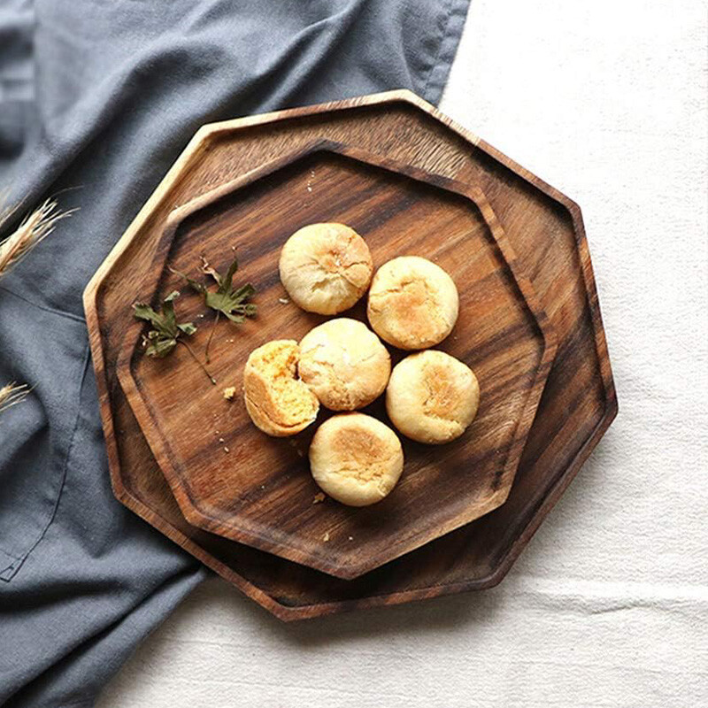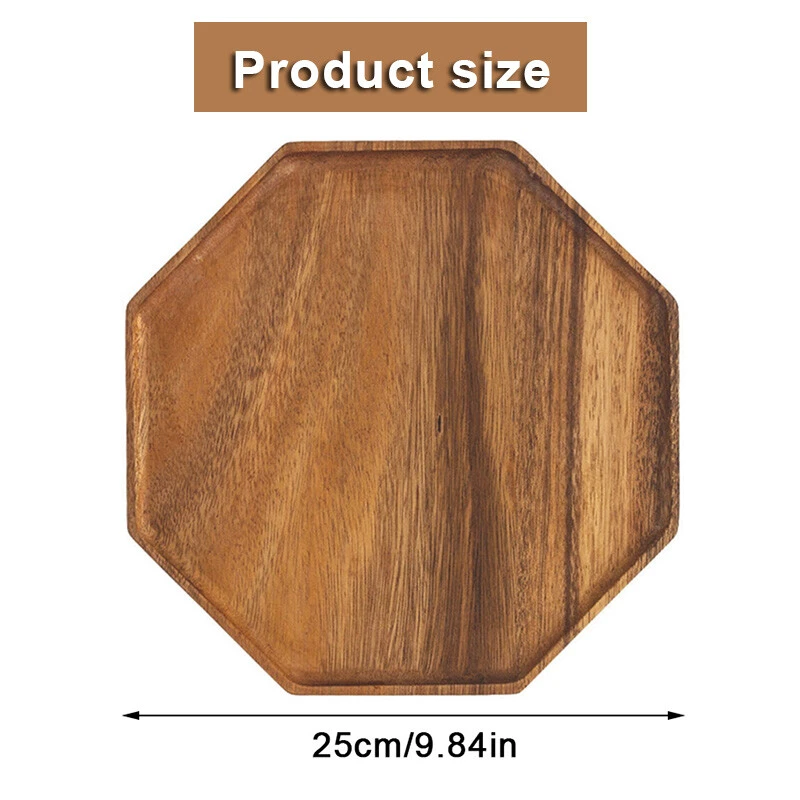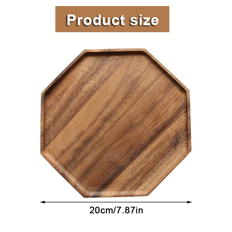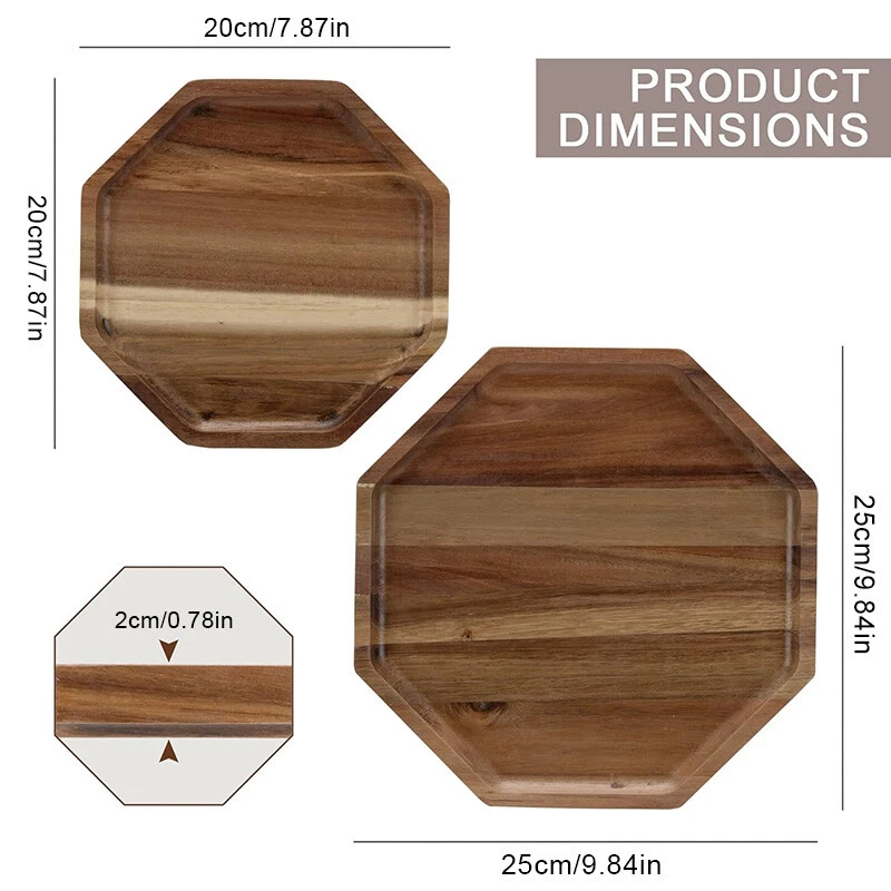 Specifications: Product Name: Wooden Dinner Plate Material: Acacia Style: Octagonal Color: Wood Color (Because It Is Natural Wood, The Colour Will Be Dark or Light) Size: 20cm/7.87inch, 25cm/9.84inch Thickness: 2cm/0.78inch Features: HEALTH & FOOD SAFE: This is pure Acacia wood, very sturdy and food safe. HIGH QUALITY: Hand carved from a Single Piece of Acacia wood by our craftsmen. Only use best wood to make our serving plates strong and long lasting. MULTI USE: It could be used as charcuterie boards, fruit platter, dessert plates, food dish, salad plate, serving tray or cookie platter, perfect for Christmas, Thanksgiving, weddings, parties, birthday or any other events. GREAT GIFT IDEA: Cute design, color and style. Ideal for various occasions including family gatherings, outdoor parties, wedding anniversary gifts,bridal shower gifts. Package include: 1 Pcs Wooden Tray Notes: Due to display differences and lighting effects, the actual color of the product may be slightly different from the color shown on the picture. Thanks! Due to manual measurement, please allow a measurement tolerance of 1-2cm.