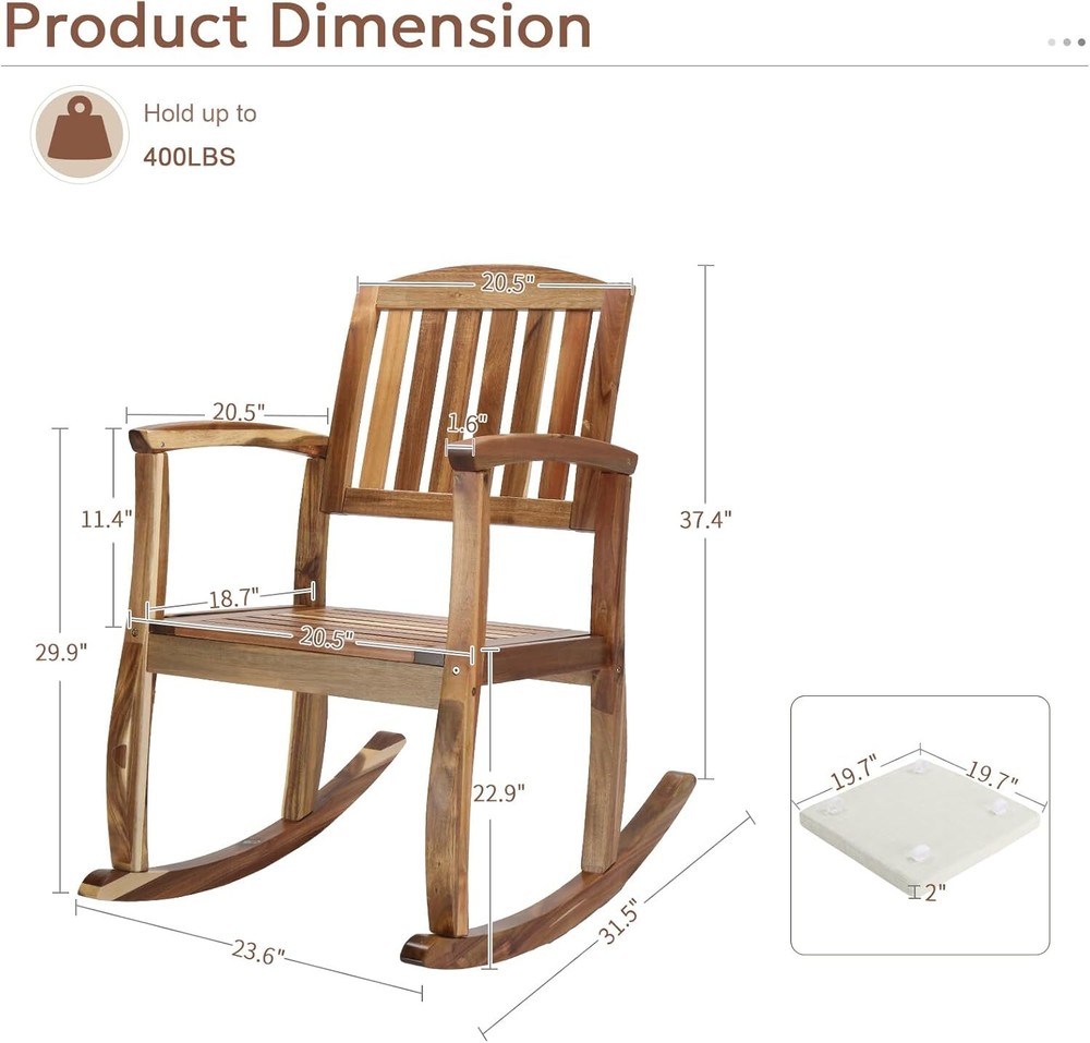 Enhanced Safety Rocking - Engineered with a secure rocking structure and anti-rollover support for optimal balance and safety. The carefully designed swing curve ensures your comfort at the chair's center Versatile Outdoor Elegance - This stylish rocker seamlessly complements any setting, from your living room to the great outdoors. Its simple elegance enhances patios, gardens, and balconies alike, inviting you to unwind wherever you please Comfort by Design - Featuring a slat construction for superior ventilation and paired with two plush, highly elastic cushions for peak comfort. The high backrest and precise swaying arc offer unrivaled relaxation Super Sport Your wonderful store Acacia Patio Rocking Chair with Cushions, Outdoor Wooden Rocker Support 400 LBS Enhanced Safety Rocking - Engineered with a secure rocking structure and anti-rollover support for optimal balance and safety. The carefully designed swing curve ensures your comfort at the chair's center Versatile Outdoor Elegance - This stylish rocker seamlessly complements any setting, from your living room to the great outdoors. Its simple elegance enhances patios, gardens, and balconies alike, inviting you to unwind wherever you please Comfort by Design - Featuring a slat construction for superior ventilation and paired with two plush, highly elastic cushions for peak comfort. The high backrest and precise swaying arc offer unrivaled relaxation Premium Acacia Craftsmanship - Crafted from select acacia wood, this rocker is coated in Polyurethane paint for unmatched protection against wear and corrosion. Its robust frame supports up to 401 pounds for durable, year-round use Simplicity in Assembly - Comes with straightforward, illustrated instructions for quick assembly. Maintenance is a breeze thanks to its smooth surface and washable cushion covers, saving you time and effort Item Specifics Brand Unbranded Type Rocking Chairs Color Oak Product Dimensions 31.5"D x 23.6"W x 37.4"H|Size:2 Size 2 PCS Back Style Slat Back Special Feature Ergonomic, Arm, Cushion Availabili Recommended Uses For Product Relaxing Maximum Weight Recommendation 400 Pounds Style Traditional Pattern Solid Finish Type Painted Included Components Rocking Chair x 2, Instruction Shape Rectangular Model Name Patio Rocking Chair Surface Recommendation Hard Floor Furniture Finish Acacia Seat Height 22.9 Inches Seat Depth 18.7 inches Seat Length 20.5 Inches Tilting Yes Is Customizable No Is Electric No Is Foldable No Item Weight 46.6 pounds Country of Origin China Item model number VL-G56000717x2 Date First Available April 7, 2024 Payment [ Policy: The above tab label style can be modified in left Basic - Footer Policy section. And this area is the details contents of your policies. You can add a banner for this policy as header and add text descriptions here. The text descriptions can be different Font Size, Font Color, Style and even graphics and icons are also accepted. ] Shipping [ Shipping: This is the contents of your Shipping. You can add a banner for this Shipping as header and add text descriptions here. The text descriptions can be different Font Size, Font Color, Style and even graphics and icons are also accepted. ] Returns [ Return: This is the contents of your Return. You can add a banner for this Return as header and add text descriptions here. The text descriptions can be different Font Size, Font Color, Style and even graphics and icons are also accepted. ] Contact Us [ Contact Us: This is the contents of your Contact Us. You can add a banner for this Contact Us as header and add text descriptions here. The text descriptions can be different Font Size, Font Color, Style and even graphics and icons are also accepted. ] Super Sport Your wonderful store DESCRIPTION PAYMENT SHIPPING RETURN POLICY CONTACT US Shop Category Store Home Other Hot Item Professional - Grade Cleaning: ZEISS 220 - Pack Pre - Moistened Lens Wipes USD 16.29 Left Right Handed Tactical Thigh Pistol Pouches Universal Drop Leg Gun Holster USD 5.99 2pcs Double-sided Grip Tape Adhesive Tape Nano Invisible Gel Traceless Washable USD 5.99 6pack FROG @ease Floating Sanitizing System Replacement SmartChlor Cartridge USD 74.99 Crystal Clear Water Made Easy! FROG @ease SmartChlor Cartridges - 3 Pack USD 39.98 Delivery New List Item Daylite 26L Pack - Versatile Everyday Backpack for Active Adventures USD 65.00 Nebula 32L Pack - Stylish, Multi-Compartment Backpack for Work & Play USD 140.00 Commuter Daypack – Streamlined, Practical Pack for Busy Urban Days USD 180.00 Blitz 30L Pack - Ready-for-Anything Backpack for Outdoor Enthusiasts USD 289.00 Blitz 35L Pack - Large and Robust Backpack for Weekend Getaways USD 329.00 Help & Info Payment Policy Shipping Policy Return Policy FAQ About Us Acacia Patio Rocking Chair with Cushions, Outdoor Wooden Rocker Support 400 LBS Enhanced Safety Rocking - Engineered with a secure rocking structure and anti-rollover support for optimal balance and safety. The carefully designed swing curve ensures your comfort at the chair's center Versatile Outdoor Elegance - This stylish rocker seamlessly complements any setting, from your living room to the great outdoors. Its simple elegance enhances patios, gardens, and balconies alike, inviting you to unwind wherever you please Comfort by Design - Featuring a slat construction for superior ventilation and paired with two plush, highly elastic cushions for peak comfort. The high backrest and precise swaying arc offer unrivaled relaxation Premium Acacia Craftsmanship - Crafted from select acacia wood, this rocker is coated in Polyurethane paint for unmatched protection against wear and corrosion. Its robust frame supports up to 401 pounds for durable, year-round use Simplicity in Assembly - Comes with straightforward, illustrated instructions for quick assembly. Maintenance is a breeze thanks to its smooth surface and washable cushion covers, saving you time and effort Item Specifics Brand : Unbranded Type : Rocking Ch