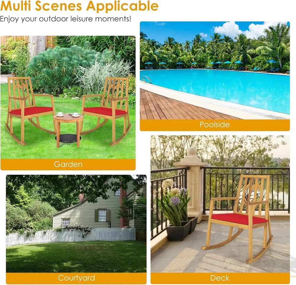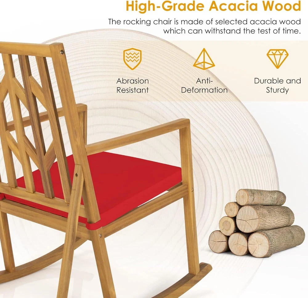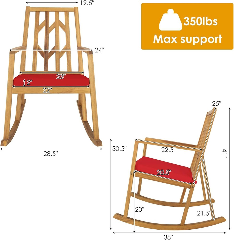 Comfortable Rocking Experience: This patio rocking chair enables you to enjoy the gentle rocking during outdoor relaxation. And the high backrest gives you reliable support during rocking backwards and forwards. Moreover, the wide sitting area and comfortable armrests fully relieve your fatigue and stress. Sturdy Acacia Wood Structure: Crafted from selected acacia wood, the patio rocker features high resistance to abrasion and deformation, ensuring the long-lasting using time. And the bottom rocking base with triangular structure makes the chair rock in a smooth and balanced way, and able to withstand the weight of 350 lbs. Super Sport Your wonderful store Acacia Wood Patio Rocking Chair, Outdoor Porch Rocker W/Removable High-Density C Comfortable Rocking Experience: This patio rocking chair enables you to enjoy the gentle rocking during outdoor relaxation. And the high backrest gives you reliable support during rocking backwards and forwards. Moreover, the wide sitting area and comfortable armrests fully relieve your fatigue and stress. Sturdy Acacia Wood Structure: Crafted from selected acacia wood, the patio rocker features high resistance to abrasion and deformation, ensuring the long-lasting using time. And the bottom rocking base with triangular structure makes the chair rock in a smooth and balanced way, and able to withstand the weight of 350 lbs. Removable & Cozy Cushion: The rocking chair also comes with a 2” thick and soft cushion, which consists of high-density sponge and high-grade fabric. Moreover, the fabric cover is designed with a zipper, so the daily maintenance is much easier. And the two straps can firmly fix the cushion in place with hook and loop fastener. Elegant Appearance: The appealing patterns on the backrest add a piece of elegance to the rocking chair and surroundings, making it a perfect addition to multiple occasions, such as poolside, balcony, garden, courtyard and so on. And the patio rocker is also perfect for indoor relaxation. Fast & Simple Installation: Delivered with complete hardware kits and a detailed user manual, the patio rocking chair is super easy to put together, which won’t cost too much time or efforts. The overall dimension of the product is 28.5” x 38” x 41” (L x W x H). And the seat height is 20”. Item Specifics Brand Unbranded Type Rocking Chairs Color Red Product Dimensions 38"D x 28.5"W x 41"H|Special Fe Special Feature Removable,Sturdy Unit Count 1 Count Recommended Uses For Product Outdoor Maximum Weight Recommendation 350 Pounds Pattern Solid Room Type Patio Garden Age Range (Description) Adult Included Components User Manual, Cushion Arm Style With arms Surface Recommendation Hard Floor Furniture Finish Acacia Seat Depth 28.5 inches Item Weight 26.5 pounds Date First Available January 10, 2022 Payment [ Policy: The above tab label style can be modified in left Basic - Footer Policy section. And this area is the details contents of your policies. You can add a banner for this policy as header and add text descriptions here. The text descriptions can be different Font Size, Font Color, Style and even graphics and icons are also accepted. ] Shipping [ Shipping: This is the contents of your Shipping. You can add a banner for this Shipping as header and add text descriptions here. The text descriptions can be different Font Size, Font Color, Style and even graphics and icons are also accepted. ] Returns [ Return: This is the contents of your Return. You can add a banner for this Return as header and add text descriptions here. The text descriptions can be different Font Size, Font Color, Style and even graphics and icons are also accepted. ] Contact Us [ Contact Us: This is the contents of your Contact Us. You can add a banner for this Contact Us as header and add text descriptions here. The text descriptions can be different Font Size, Font Color, Style and even graphics and icons are also accepted. ] Super Sport Your wonderful store DESCRIPTION PAYMENT SHIPPING RETURN POLICY CONTACT US Shop Category Store Home Other Hot Item Left Right Handed Tactical Thigh Pistol Pouches Universal Drop Leg Gun Holster USD 5.99 2pcs Double-sided Grip Tape Adhesive Tape Nano Invisible Gel Traceless Washable USD 5.99 Crystal Clear Water Made Easy! FROG @ease SmartChlor Cartridges - 3 Pack USD 39.98 Professional - Grade Cleaning: ZEISS 220 - Pack Pre - Moistened Lens Wipes USD 16.29 6pack FROG @ease Floating Sanitizing System Replacement SmartChlor Cartridge USD 74.99 Delivery New List Item Blitz 30L Pack - Ready-for-Anything Backpack for Outdoor Enthusiasts USD 289.00 Blitz 35L Pack - Large and Robust Backpack for Weekend Getaways USD 329.00 Commuter Daypack – Streamlined, Practical Pack for Busy Urban Days USD 180.00 Nebula 32L Pack - Stylish, Multi-Compartment Backpack for Work & Play USD 140.00 Daylite 26L Pack - Versatile Everyday Backpack for Active Adventures USD 65.00 Help & Info Payment Policy Shipping Policy Return Policy FAQ About Us Acacia Wood Patio Rocking Chair, Outdoor Porch Rocker W/Removable High-Density C Comfortable Rocking Experience: This patio rocking chair enables you to enjoy the gentle rocking during outdoor relaxation. And the high backrest gives you reliable support during rocking backwards and forwards. Moreover, the wide sitting area and comfortable armrests fully relieve your fatigue and stress. Sturdy Acacia Wood Structure: Crafted from selected acacia wood, the patio rocker features high resistance to abrasion and deformation, ensuring the long-lasting using time. And the bottom rocking base with triangular structure makes the chair rock in a smooth and balanced way, and able to withstand the weight of 350 lbs. Removable & Cozy Cushion: The rocking chair also comes with a 2” thick and soft cushion, which consists of high-density sponge and high-grade fabric. Moreover, the fabric cover is designed with a zipper, so the daily maintenance is much easier. And the two straps can firmly fix the cushion in place