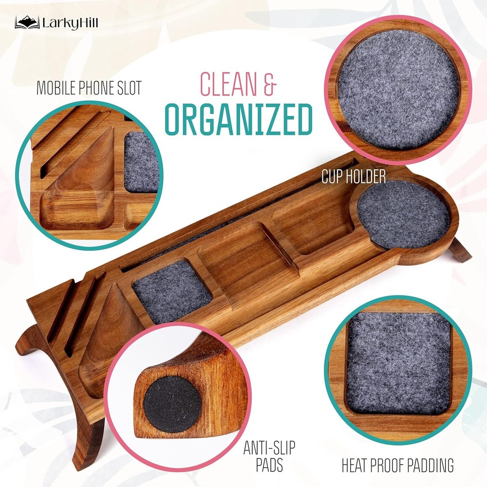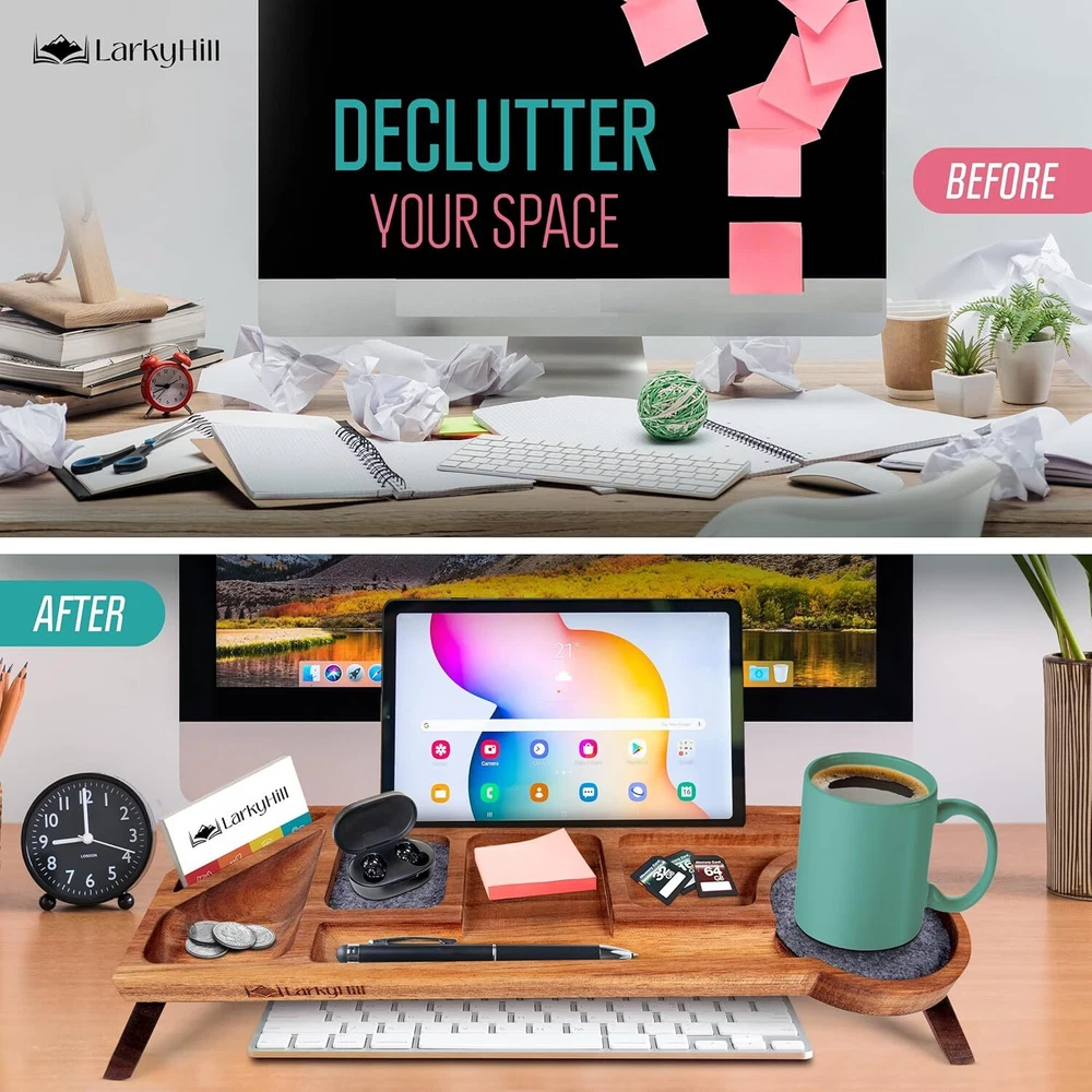 Acacia Wood Desk Organizer - Multi-Compartment Over the Keyboard Brown Product Details Specific Uses For Product: Stationery Material: Acacia Special Feature: Adjustable Color: Brown Brand: LarkyHill Finish Type: Wood Product Dimensions: 6"D x 18"W x 2.99"H Shape: Rectangular Number of Items: 1 Mounting TypeNumber of Compartments: Tabletop Mount9 WOOD DESKTOP ORGANIZER - Take your office space to the next level with this 100% Acacia wood desk organizer. The attractive, yet functional over the keyboard desk organizer easily fits into any style of home or work space that you desire to create for yourself. MADE OF 100% ACACIA WOOD - Our wooden desk organizers are the perfect way to keep your office looking sleek and organized. They have a modern splinter-free design with an oil finish that brings out natural colors in Acacia wood that complements all décor types. 9 USEFUL COMPARTMENTS - This modern office desk organizer is perfect for storing all your small items. The 9 individual compartments can be used to neatly organize anything from a mug, plant or keys while still leaving room in the middle sections of this compact organizer for more important things like pens, paper clips, memory cards and more! IDEAL SIZE FOR ANY DESK - The foldable wooden desk top organizer is the ideal size for any office or work space. It's 3" tall, 18 inches wide with a 6.3 inch depth when standing and becomes 1.6 inches tall when folded for easy organization and storage. SPACE SAVING SOLUTION - The 9 compartments in this modern desk organizer provide a space for all the important accessories and items you need throughout your day from phone to post-its, ensuring that everything is at hand where it can easily get accessed when needed.