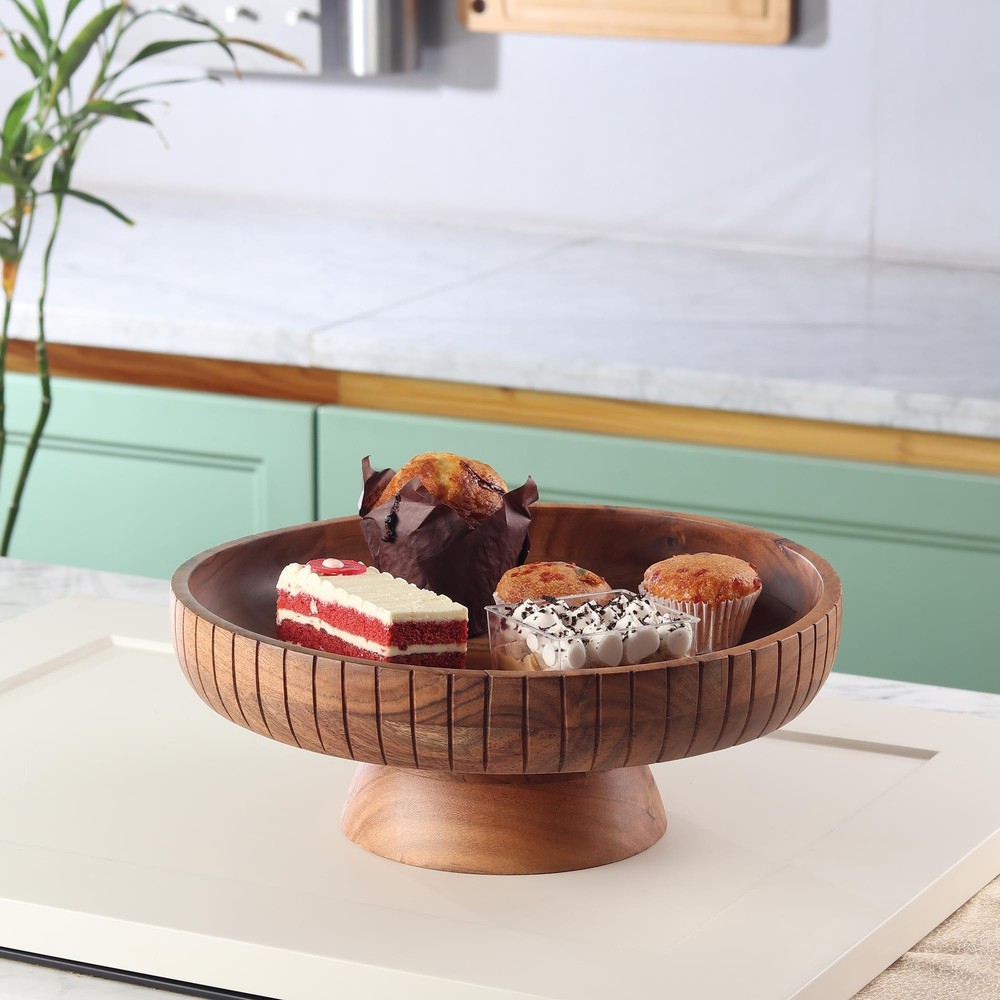 12" Acacia Wood Fruit Bowl with Pedestal, Handmade Decorative Centerpiece, Natural Finish Wooden Bowl for Kitchen or Dining Table ๐ฟ Natural Elegance Meets Everyday Function โ Handmade Acacia Wood Fruit Bowl with Pedestal Make a stylish statement in your kitchen or dining space with this beautifully crafted 12-inch Acacia wood bowl. With its natural finish, handmade uniqueness, and sturdy pedestal design, it blends classic charm with modern minimalism โ perfect as a functional fruit bowl or an eye-catching centerpiece. ๐ฟ Crafted for Beauty & Function: Generous Size: 12" diameter, 3.5" deep, perfect for holding fruits for a family of four to five. Raised Pedestal Design: Adds height and elegance to your countertops or tablescape. Weight: 3.45 lbs โ solid and stable on any surface. ๐ฟ 100% Natural & Handmade: Made from genuine Acacia wood with a matte, natural finish. Each bowl is hand-carved by skilled artisans, making every piece one-of-a-kind. Unique grain patterns and textures add to its organic charm. ๐ฟ Versatile & Stylish: Ideal as a fruit bowl, candy holder, or entryway key tray. A beautiful centerpiece for your kitchen island, dining table, or living room console. Complements both modern and rustic home decor themes. ๐ฟ Food Safe & Eco-Friendly: Enjoy your fruits and snacks worry-free โ no harmful plastics or glazes. Acacia wood is naturally non-toxic and wonโt interfere with food taste. ๐ฟ A Thoughtful Gift: Perfect for housewarming, weddings, birthdays, Thanksgiving, or Christmas. A gift that combines style, sustainability, and everyday utility.