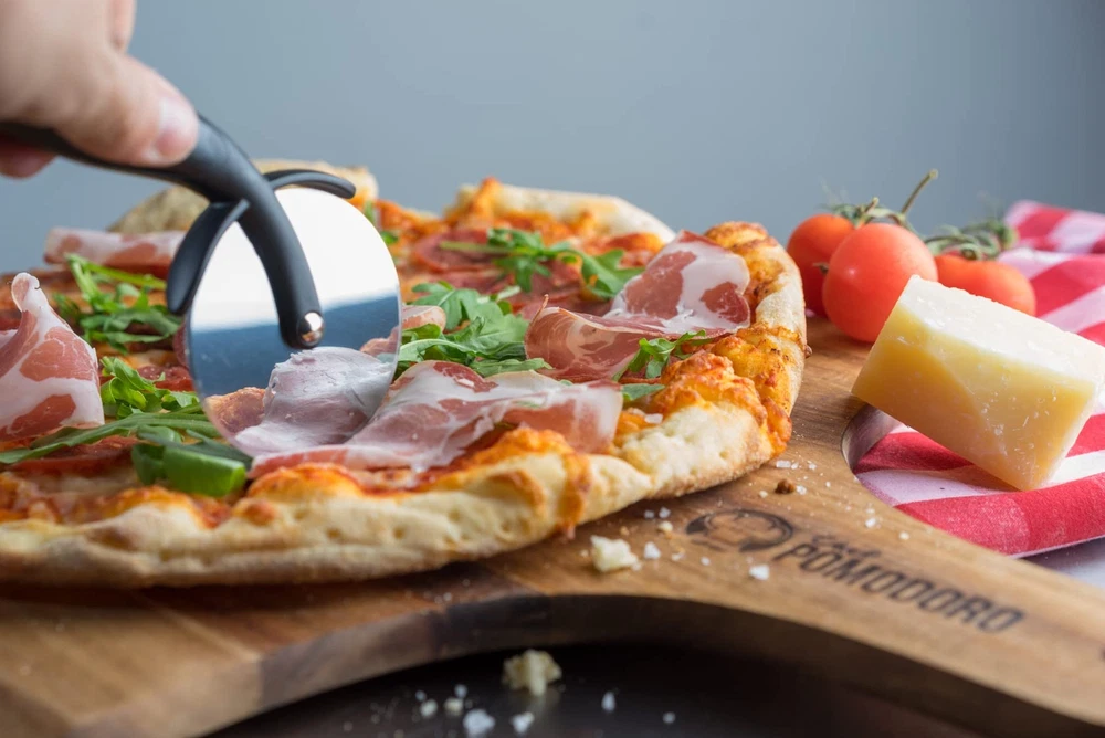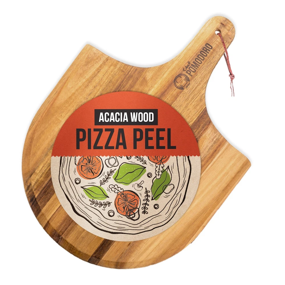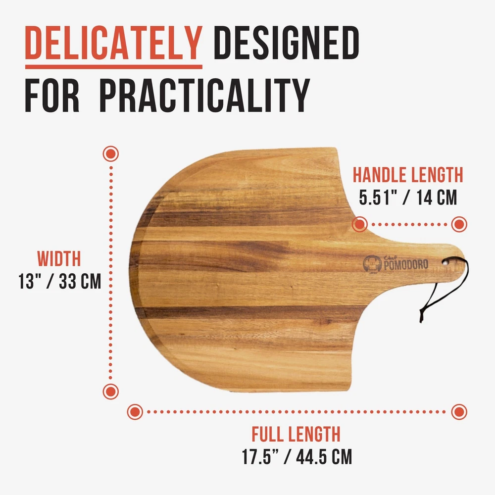 Summary POMODORO's All Natural Acacia Wood Pizza Peel was crafted specifically for the pizza maker, home chef and artisan baker. Luxuriously designed using acacia wood, its wooden properties is the perfect match for any kitchen décor, pizza parlor and bakery. In addition to its natural rich pattern, it's incredible strength prevents warping and subdues heat from transferring pizza and baked goods to and from an oven/grill. The pizza peel is finished with -free food oil for an elegant shine and to smooth out the edges. Use Use POMODORO's Pizza Peel to transfer pizzas, bread and other baked goods to and from the oven, outdoor grill and wood fired ovens. Immaculate to be used as a serving tray! Sprinkle with flour, cornmeal or milled wheat bran to allow the pizza, bread and baked goods to slide easily onto the peel. Carefully place onto a pizza stone, baking sheet or tray with the peel Once finished cooking, slide out the pizza, bread or baked goods from the oven using the peel Mmmm, enjoy and serve! Care Instructions Wash the pizza peel in warm, soapy water. Scrap off any excess food or crumbs from the peel using a soft sponge. Thoroughly rinse with clean water. Do not soak the peel to prevent cracking or warping Air dry on a dish rack or hang up on a cupboard or wall. We recommend re-oiling your peel every 6 months with a food safe wood oil. After wash and thoroughly drying the peel, use a soft cloth to apply the oil in an even layer over the wood. Leave the oil to soak into the wood overnight or a few hours at a minimum. Remove any excess oil with a dry cloth after letting the peel sit overnight Never put the pizza peel in a dishwasher. Materials: 100% All Natural Acacia Wood Measurement: 13"x17.5"x0.5" 100% ALL NATURAL: Pure Acacia Wood Pizza Peel is designed to look great with its natural wooden spatula paddle pattern look in the kitchen, on the wall, or slid into the cupboard TAPERED EDGE: Our luxury wooden pizza paddle's sleek design allows you to use in all baking and cooking situations – transfer uncooked pizza dough, cooked pizza and homemade breads, pastries in and out of the oven, pan or outdoor grill with ease. PERFECTLY SIZED: The pizza spatula handle was made to fit snug into your hand to give a secure grip and reduce slips. The peel provides enough thickness to guard against burning hot temperatures! Also a perfect size as a charcuterie board! SAFETY: Protects the artisan baker's hands out of the hottest part of a wood fired oven or grill and to prevent burning their hands on hot baked goods MUST HAVE: The perfect gift accessory for any artisan baker or pizza lover, combine POMODORO's Pizza Peel with a pizza cutter and ceramic baking stone to make the best crispy crust!