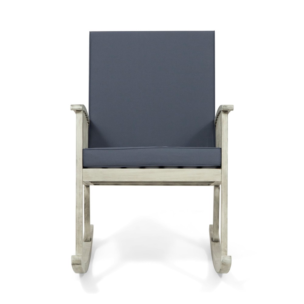 Specifications Place of Origin #originPlace# Main Color Grey Main Material Acacia Wood Dangerous Goods #dangerFlag# Dimensions & Weights Assembled Length (in.) 24.75 Assembled Width (in.) 38.25 Assembled Height (in.) 37.25 Weight (lbs) 24.25 Product Features Soak in the summer sun with a cozy rocking chair that brings ultimate relaxation to a corner of your porch or backyard space. Featuring a gorgeous acacia wood frame with back and seat cushions, this chair brings both incredible comfort and a homey vibe to your outdoor space. This set is finished with a gentle rocking design that creates a soothing motion for you to enjoy, making this chair set your new favorite place to sit back and enjoy the outdoors. ACACIA WOOD: Made with acacia wood that brings a sleek and exotic look to your space, this durable hardwood naturally withstands outdoor elements and will not darken over time. Acacia wood is perfect as a solid, heavy frame that resists wear and tear. ROCKING FEATURE: This rocking chair features long rockers, ideal for deep, soothing rocking motions, perfect for relaxing out in the summer sun. WATER-RESISTANT CUSHIONS: Our cushions are covered with a non-porous material that makes cleaning any spills a breeze so you can spend all summer lounging outdoors in comfort. RUSTIC STYLE: The wood design brings a truly rustic feel. The cushion adds the perfect amount of comfort to compliment the wood frame, ensuring that each rock of the chair is filled with leisure. ASSEMBLY REQUIRED: Some assembly is required for this rocking chair. All of the instructions and tools needed for assembly are included. Frame Material Details : Acacia Wood Leg Material Details : Acacia Wood Care Instructions : Spot Clean Description