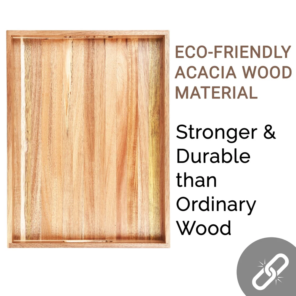 A Hosting Essential & Perfect For Everything From Breakfasts In Bed To Dinner On Couch! The 16-inch tray with a natural finish adds character to your home and kitchen. The interior space of the acacia wood serving tray is spacious enough to hold food items along with decorative candles or magazines. Give your next event a tasteful upgrade, have an Instagram-worthy breakfast in bed or decorate your living room with this style and elegant tray. The sturdy construction and metal finish of the wooden serving tray make carrying meals or drinks from kitchen to patio, bedroom or living room a breeze. The perfect blend of form and function, this rectangular serving tray is a must-have for every kitchen. Ottoman serving tray also makes a useful gift for a proud house owner. All About Quality: Heavy-duty and durable acacia wood construction No rusting or corroding Won't rot even after multiple washes No cracks or crevices where bacteria can form Natural finish. No harmful paint, dyes or chemicals Food safe for worry-free use Functional & Convenient Design: Handles for easy and stable carrying experience High walls surrounding the tray will prevent any accidental falls; carry the tray more confidently Beautiful and natural appearance of the tray complements every décor and kitchen The tray is thick yet lightweight which allows for a fatigue free usage More Uses Than You Think: Serve breakfast in bed, lunch, dinner, snacks Bring along to picnics and camping Store media remotes, toiletries and other bath essentials Display candles and other decorative items Merchandise products in retail setups Organize jewelry and accessories Holding books, magazines, documents and newspapers Product Specifications: Material: Acacia wood Dimensions: 16 x 12 x 1.6 inches Package Includes: 1 x Serving Tray Serve With Style: Serve delicious food on dining tables, bring snacks on a coffee table, relish a lazy breakfast on a Sunday morning or unwind after a hard day at work in the bathtub, acacia woodserving tray has many uses. Acacia Wood Construction: Crafted from premium quality and durable acacia wood, our kitchen serving tray is stronger, sturdier and suitable for everyday heavy-duty use in the kitchen and commercial environments. Probably the last serving tray you will ever buy! Ergonomic Grip Handles: The sleek and low profile side handles allow for easy carrying of food from the kitchen to living room, patio, bedroom or bathroom. Even if the rustic serving tray is jam-packed with items, you will have a firm grip; never worry about accidents. Durable Yet Lightweight: Measuring 17.5 inches x 12 inches, this elegant serving tray has the perfect size to fit your favorite foods and yet is lightweight enough for easy carrying when the bed serving tray is full. It has a high wall surrounding the tray, which keeps all the things in place. Multifunctional Serving Tray: This patio serving tray is ideal for serving breakfast, lunch, dinner, snacks and any meal. Apart from everyday use, this serving tray can also be used during family activities, parties and get to gathers. It is equally useful in commercial setups and restaurants.