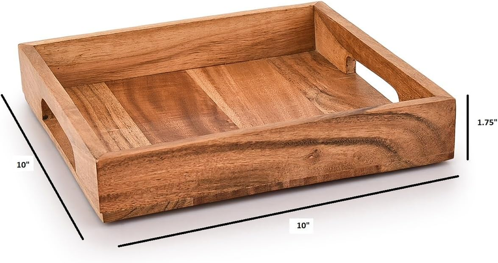 Wooden serving tray are often used as a finished product as a multipurpose wood breakfast serving tray or accessory organizer. Wooden tray decorative rectangular features an antique style and match any tableware Breakfast trays by Sufandly for coffee and cake ,fresh fruit and enough to hold many kinds of foods. The carefully-designed cutout handles on both sides offer firm and comfortable grips, allowing you to carry meals and drinks from one place to another in one go Size(Inch): 10" x 10" x 1.75". We recommend not to wash this product with water. To clean, wipe with damp fabric and towel dry, To preserve the beauty of the Acacia wood, periodically apply oil with a fabric or towel and let dry long. Product Description Product Description These Serving Trays are made from Natural Acacia Wood, No Glue made in environment faraway from City Pollution. Choosing these Plates will make your and Your Family's Life Healthier. Samhita Acacia Wood Serving Tray with Handles Wooden serving tray are often used as a finished product as a multipurpose wood breakfast serving tray or accessory organizer. Wooden tray decorative rectangular features an antique style and match any tableware Size & Care Size(Inch): 10" x 10" x 1.75". We recommend not to wash this product with water. To clean, wipe with damp fabric and towel dry, To preserve the beauty of the Acacia wood, periodically apply oil with a fabric or towel and let dry long. Features Breakfast trays by Subfamily for coffee and cake ,fresh fruit and enough to hold many kinds of foods. The carefully-designed cutout handles on both sides offer firm and comfortable grips, allowing you to carry meals and drinks from one place to another in one go