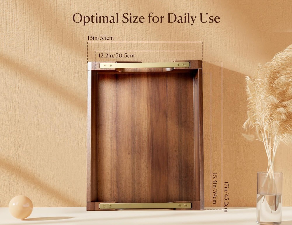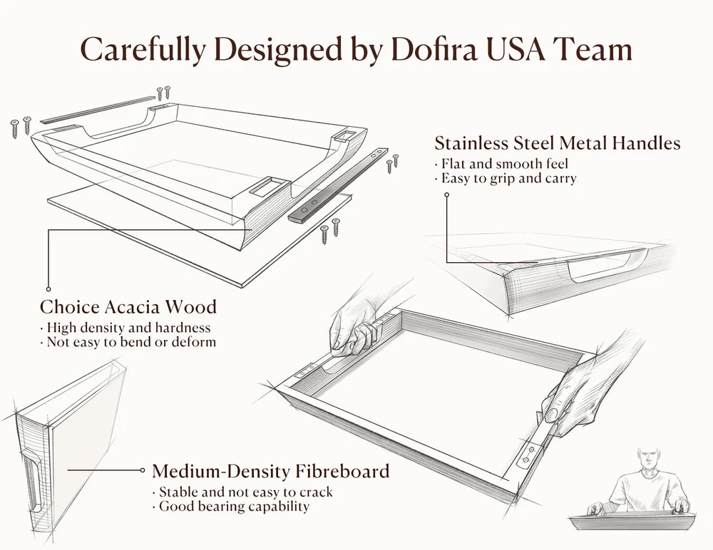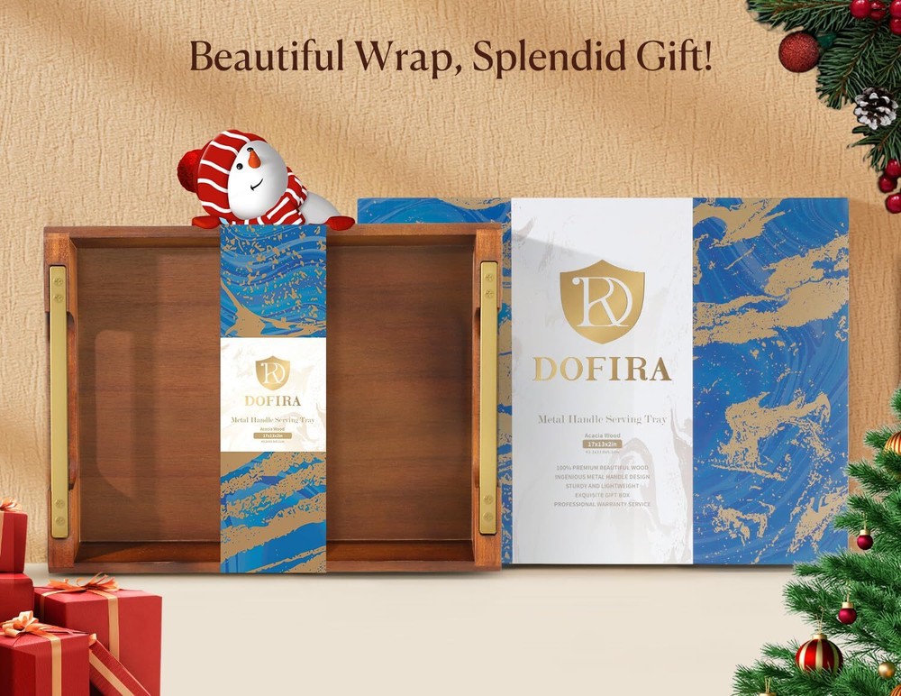 Dofira Acacia Wood Serving Tray with Metal Handles, 17x13in Large Ottoman Tray, Food Drinks Tray for Coffee Table, Breakfast, Dinner & Bar, Rustic Decorative Tray for Kitchen, Bedroom (Gift Box) [ 1×Dofira=10×Others ] - acacia wood edges articulate tightly to a sturdy MDF bottom, reducing the risk of cracking by 70% compared to solid wood ones. Our strict manufacturing standards ensure a well-made, durable wood serving tray that can last for years without chips, you can throw 10 inferior ones in the trash at ease for the period! [ Stunning and Practical ] - Serve your meals in ! With a bold collision of warm vintage wood and dark grey metallic glossy, both modern and rustic, cool yet classy, its unique charm makes it fit various home styles like country themes. The wide handles are comfortable to hold and prevent finger pinching, while the high sides prevent spills making serving a breeze. [ Unexpected Gift Idea ] - What could be more meaningful than sending a tray full of blessings to your loved ones? Surprise them with our acacia wood tray with metal handles! With an exquisite gift box, it's the perfect surprise gift for birthdays, housewarmings, weddings, anniversaries, or any other special event. [ Meet All Your Needs ] - Dofira 17"x12" all-in-one tray is large and versatile to handle any task. As a serving tray serves food and drinks at dinner parties, bring snacks on a coffee table, and relish a lazy breakfast in bed! As an ottoman tray for daily essentials and plants or a display storage tray for perfume and jewelry, keep everything organized at a glance while adding a touch of charm to your space! [ Order with Confidence ] - Our decorative tray has sanded over 10,000 times, resulting in a flat, velvety smooth finish that won't scratch you or your furniture. The wrap-rounded sides and bottom are carefully crafted to prevent leaks and avoid food particles from getting stuck, and it's easy to clean with just a damp cloth! We adhere to a "One Year Warranty, Lifetime Service", welcome to contact us anytime! Dofira Acacia Wood Serving Tray Metal Handles Wooden Food Drinks Coffee Table Breakfast Tea Couch Dinner Bar Rustic Decorative Display Storage Kitchen Bedroom Gift Birthdays Housewarming Weddings Anniversaries Mother's Day Father's Day SHIPPING Domestic Buyers - We have confidence in our products, but if you are not fully satisfied please contact us within 30 days of purchase and you will get full refund. - We ship within 3 business days of payment, usually sooner - We offer FREE shipping on all orders! - We only ship to the lower 48 states, no APO/FPO addresses or PO Boxes allowed International buyers – please note: Import duties, taxes, and charges aren't included in the item price or postage cost. These charges are the buyer's responsibility. - Please check with your country's customs office to determine what these additional costs will be prior to bidding or buying. * Order Cancellation Policy ** You can return a product for up to 30 days from the date you purchased it. 1. The seller reserves the right to cancel the special case only due to eBay cancellation fee. 2. The decision of seller is the final. 3. The seller will respond to the cancellation request within 2 business days. Please wait for the result of cancellation. 4. In case the cancellation is not completed by some reasons, the buyer can follow the options below to get the refund. 4.1 The buyer can reject the item when it arrives. 4.2 The buyer can send the item back to the seller within 30 days If the buyer receives item (USA Shipment ONLY). The seller will provide the FREE return label to the buyer when the buyer opens " Return Item" case on eBay by using the reason as "Change my mind" ONLY. 5. When buyer has placed the order. The order will be processed and completed by automatic warehouse system within 5 minutes. In case that buyer sends the cancellation request after 5 minutes of placing the order, the request will be rejected. **Sending direct message to cancel the order is not allowed for every case.* Return Policy For the return case - If buyer would like to return the items for refund or replacement, please CONTACT SELLER to receive the free return label from seller. The refund or replacement will be processed with the tracking number of return label which is provided by seller only. The other ways of return which are not approved by seller will not be processed for the refund or replacement.