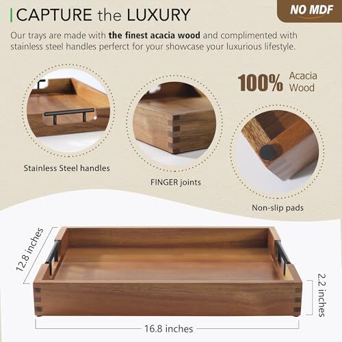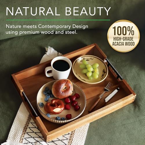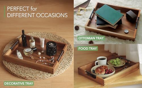 Menu 1. We require immediate payment. 2. We currently accept payment via eBay managed payments only. 3. Once payment is cleared, we will dispatch your shipment within 1-3 business days. Please refer to the "Shipping" tab for more information regarding shipping speed to your destination. Acacia Wooden Serving Tray with Metal Handles 17"x13" Ottoman Coffee Table Tray for Living Room Large Wood Decorative Tray for Kitchen Dinner Food Bar Tray Breakfast in Bed(Gift Box,Natural) Product description Crafted from Nature's Best: Made from premium-grade acacia wood, this serving tray highlights its natural texture without any MDF or synthetic materials, offering an sustainable and sustainble choice for your home Handmade Excellence: Meticulously polished and varnished for a smooth surface and comfortable grip; The mortise and tenon joint ensure both durability and aesthetics, complemented by protective bottom paddings for scratchless furniture surfaces Modern Style & Ideal Gift: This 16.8 x 12.8 inches serving tray is equipped with sleek metal handles for a comfortable grip and ease of carrying; Creates a harmonious aesthetic with its natural wood grain texture; It's an ideal gift for special occasions Versatile Tray for Every Need: From home decor and organizing various spaces in your living room, bedroom, or kitchen, to serving as a coffee table, food, ottoman, or dinner tray, even for surprising a loved one with breakfast in bed Joyful and Elegant: With rich wood tones and impeccable craftsmanship, this serving tray adds warmth and sophistication to your table, ottoman, or coffee table settings PLEASE MESSAGE US IF YOU HAVE ANY OTHER QUESTIONS, AND MANY THANKS FOR READING ALL OF THIS. Copyright ©#. All Rights Reserved.