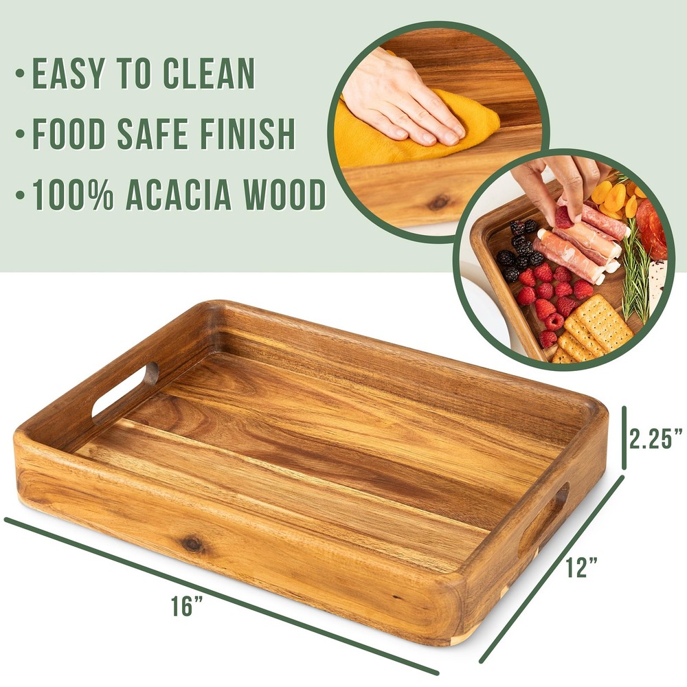Add Rustic, Farmhouse Charm to Your Living Room or Space with Serving Trays from Whether you love hosting guests or you’re simply trying to create a more rustically charming living room the right serving trays can support both your decorative and functional needs. Especially when they’re Trays with built-in carry handles. These charming wood serving trays are designed so you can create tons of different layouts, serve great appetizers and foods, and decorate your space in exciting new ways. And all with a beautiful finish and natural wood construction that’s perfect for modern, boho, and farmhouse-style homes. Not cheap and breakable like bamboo Product Details: Serving Tray (1 Pc. Set) All-Natural 100% Acacia Wood Strong, Built-In Carry Handles Lightweight and Portable Decorative and Functional Design Large Tray: 16” x 12” Farmhouse Wood Serving Tray Set – This beautiful, rectangular serving tray comes with one individual that is 16x12 inches large. Great for Dinner or as a living room ottoman tray or kitchen display. Great Lap Tray Modern Rounded Edge Tray Design - Impress your party guests with these versatile trays for serving food and entertaining. Can be used as TV dinner trays, fruit tray, bed table tray, bathroom tray, vanity tray and many other uses Natural Acacia Wood Craftsmanship - food serving trays are crafted with 100% all-natural acacia wood and have a beautiful rustic finish that really sets the tone and style of each piece. Great for farmhouse, modern, or vintage homes. Convenient Carry Handles Built In - We made our appetizer serving trays portable so you can carry them from the kitchen to the grill to the dining room, which is why each one features strong, built-in carry handles. Great for eating or a drink tray Functional and Stylish Home Decor - Our large serving trays can be used to create a warm, relaxing ambiance in the kitchen, living room, dining, bedroom and more. They look great on ottomans, couch, and other furniture! Breakfast in Bed!