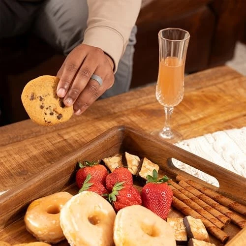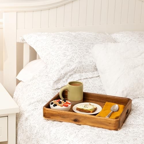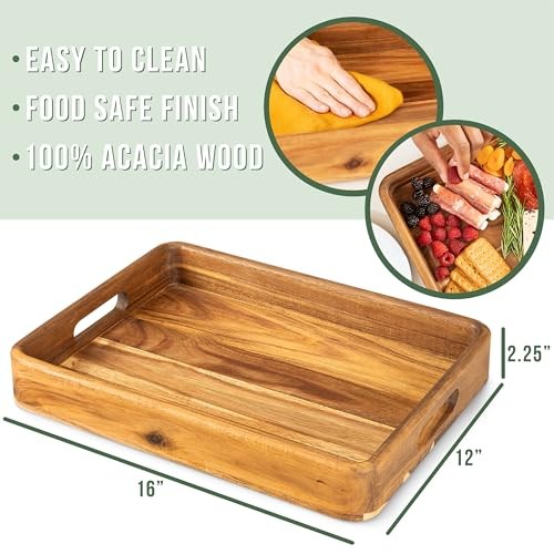 Return Policy Fast Delivery Trusted seller Acacia Wooden Serving Trays with Handles for Eating, Appetizers, Food, Snacks, or Home Decor, Large Wood Bed Tray or TV Tray, Decorative Ottoman or Coffee Table Accessory, 16x12 inch, Set of 1 Product Description Farmhouse Wood Serving Tray Set – This beautiful, rectangular serving tray comes with one individual that is 16x12 inches large. Great for Dinner or as a living room ottoman tray or kitchen display. Great Lap Tray Modern Rounded Edge Tray Design - Impress your party guests with these versatile trays for serving food and entertaining. Can be used as TV dinner trays, fruit tray, bed table tray, bathroom tray, vanity tray and many other uses Natural Acacia Wood Craftsmanship - food serving trays are crafted with 100% all-natural acacia wood and have a beautiful rustic finish that really sets the tone and style of each piece. Great for farmhouse, modern, or vintage homes. Convenient Carry Handles Built In - We made our appetizer serving trays portable so you can carry them from the kitchen to the grill to the dining room, which is why each one features strong, built-in carry handles. Great for eating or a drink tray Functional and Stylish Home Decor - Our large serving trays can be used to create a warm, relaxing ambiance in the kitchen, living room, dining, bedroom and more. They look great on ottomans, couch, and other furniture! Breakfast in Bed! Shipping Returns Payment Shipping Shipping is FREE to all addresses other than APO/PO boxes in the lower 48 states. All our stock ships from US-based warehouses. Shipped via USPS or UPS (depending on location and package weight) Unless stated otherwise, all orders will ship within 24-72 hours of your payment being processed. Check our feedback to see the great reviews of FAST shipping we offer. Returns Seller does not accept returns Payment We currently accept payment via eBay managed payments only. Once payment is cleared, we will dispatch your shipment within 1-3 business days. Please refer to the "Shipping" tab for more information regarding shipping speed to your destination.