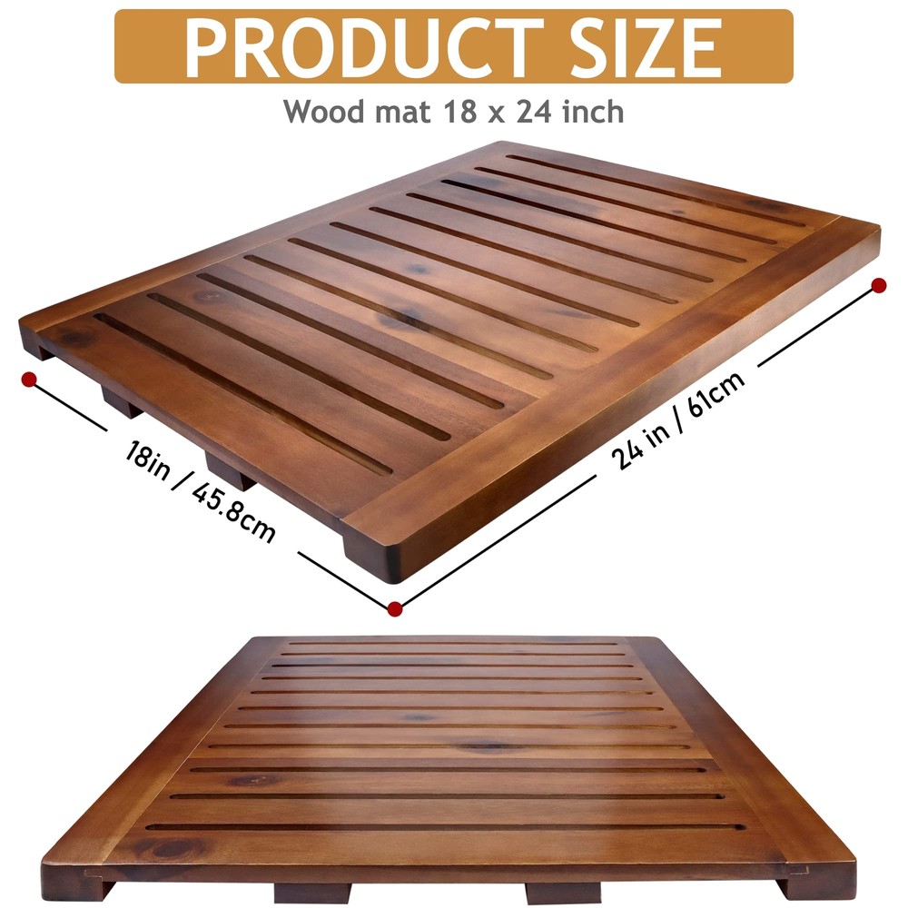 Sturdy Acacia Wood Bath Mat: Acacia wood can be resistant to termite damage, waterproof, and durable in long-term use without being warped. While the bamboo mat is vulnerable to termites and fusty, easy to change shape, and cracked in a humid or warm sunny environment. Non-Porous And Waterproof Surface: the wood shower mat is completely finished with three times coats of varnish which make it smooth and not easy to scratch or abrasions, protect your shower mat by always staying shiny from the little knocks and frequently water uses that are inevitable in a busy family. Smart Design: with non-slip rubber feet on the bottom of the wood mat, do not scratch your floor, ensure your safety when using in a watery place, and keep from sliding on wet floors. A long ditch thoroughly drains water to leave a dry surface, not absorbing the full amount of water like a fiber bath mat. Multi - Purposes: with our wooden bath mat you can use them for bathroom, outdoor shower, by the pool, hot tub, gym shower, kitchen or sauna room….And it will definitely a thoughtful gift for your friends, relatives… Low Maintenance: Our acacia shower mat for inside shower comes fully assembled and can be used right out of the box. Also no extra maintenance required as acacia wood will keep in good condition. Note: The color representation of our wood products in photographs may slightly vary from the actual product due to lighting conditions.