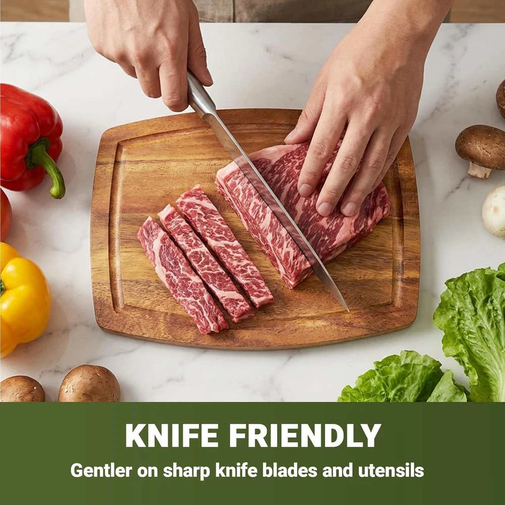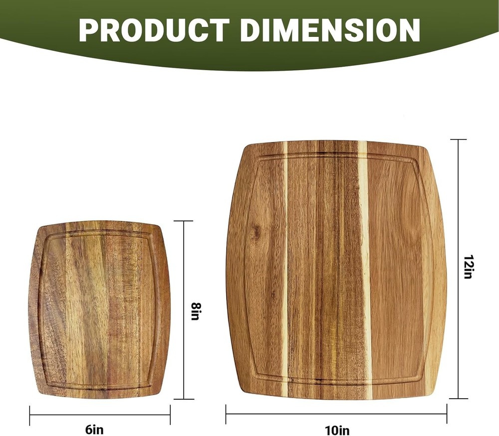 Acacia Wood Small Cutting Board for Kitchen, 8 x 6 Inch Thick Wooden Chopping Board Serving Boards with Deep Juice Grooves for Meat, Cheese, Vegetables, Bread, and Charcuterie Acacia Wood Cutting Board: Crafted from natural acacia wood, the wooden cutting board is eco-friendly and built to last, not easy to crack or rot. Vivid wood color with contrasting pattern can match any style of kitchen Smooth Finish: The surface of the kitchen wooden cutting boards have been burnished three times by the hand of our carpenters, so it touch smoothly without any splinter. Much more durable than bamboo and healthier than plastic Juice Groove Design: The small cutting board features a juice groove that saves you from messy spillages. It ensures your kitchen counters remain tidy during your food prep routine and a cleaner working area and lesser cleaning time. Care Tips: Quick wash and them wipe with a damp cloth or just wipe with a damp cloth, then place it in ventilated place to dry, DO NOT soak in water or expose in the sun. The Small cutting board sizes 8 x 6 x inch Versatile Use: The wooden cutting boards for kitchen can be used not only for cutting meat, chicken,bread, fruits, cheese and veggies, but also used as serving boards at home, hotels, bars or coffee shops .