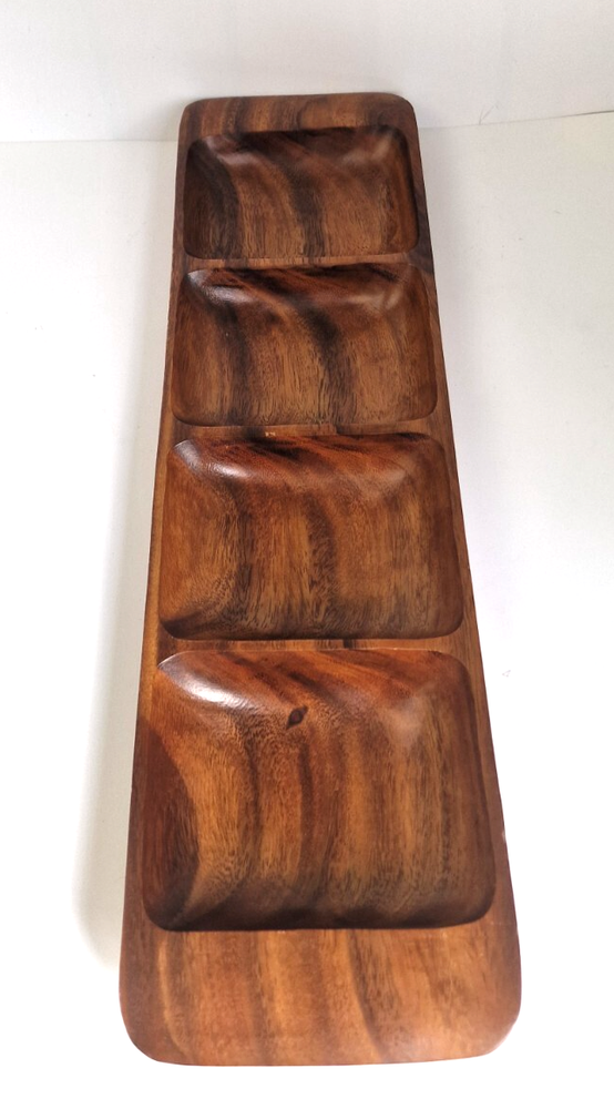 Stunning Acacia Wood 4 compartment snack tray. The piece measures 52 cm long and 15 cm from front to back, 3.5 cm tall. A Beautiful piece of Treen, the colour may vary slightly from the photographs. Please refer to the photographs as they do form part of the description. All items are professionally packed using lots of Fragile Tape where applicable. I use the courier Evri and they estimate 2/3 working days to get your item to your location. You may like to look at my husbands E Bay Shop, Quality Antiques and Vintage. Thank You for Looking and good luck with your bidding.