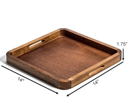 Return Policy Fast Delivery Trusted seller Acacia Wood Square Serving Tray, 14" x 14" x 2" Product Description Handcrafted from high-quality acacia wood, renowned for its durability and stunning grain patterns, it is also naturally resistant to stains, odors, and moisture. Measuring 14" x 14" x 2", this tray offers ample space to showcase culinary creations, serve hors d'oeuvres, or display decorative items in an elegant manner. The sides are almost 2" deep to ensure that nothing falls off and the convenient handles on each side are designed to provide convenient mobility. The warm, earthy tones blend seamlessly with various decor styles, whether it's a rustic farmhouse, a modern minimalist, or a classic traditional theme We recommend hand-washing with mild soap and warm water to maintain its beauty and integrity for years to come. To preserve the wood's natural luster, occasional oiling with food-grade mineral oil is recommended. Shipping Returns Payment Shipping Shipping is FREE to all addresses other than APO/PO boxes in the lower 48 states. All our stock ships from US-based warehouses. Shipped via USPS or UPS (depending on location and package weight) Unless stated otherwise, all orders will ship within 24-72 hours of your payment being processed. Check our feedback to see the great reviews of FAST shipping we offer. Returns Seller does not accept returns Payment We currently accept payment via eBay managed payments only. Once payment is cleared, we will dispatch your shipment within 1-3 business days. Please refer to the "Shipping" tab for more information regarding shipping speed to your destination.