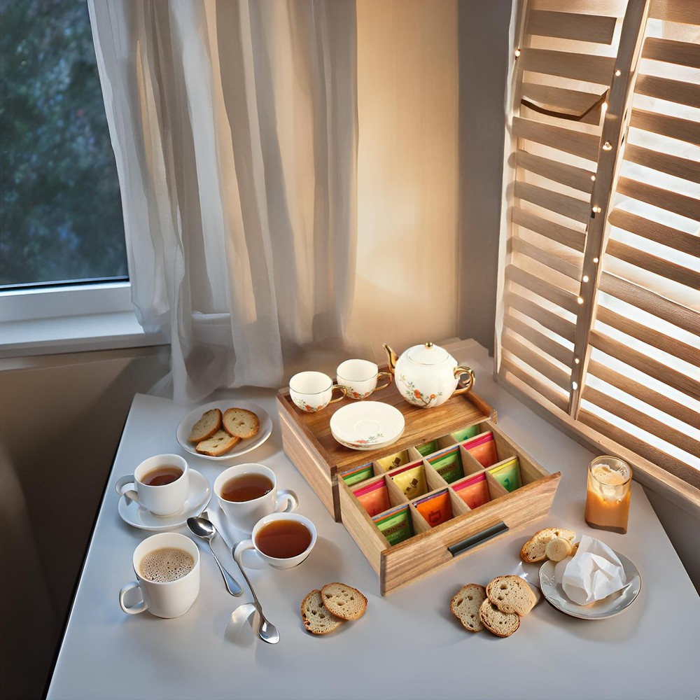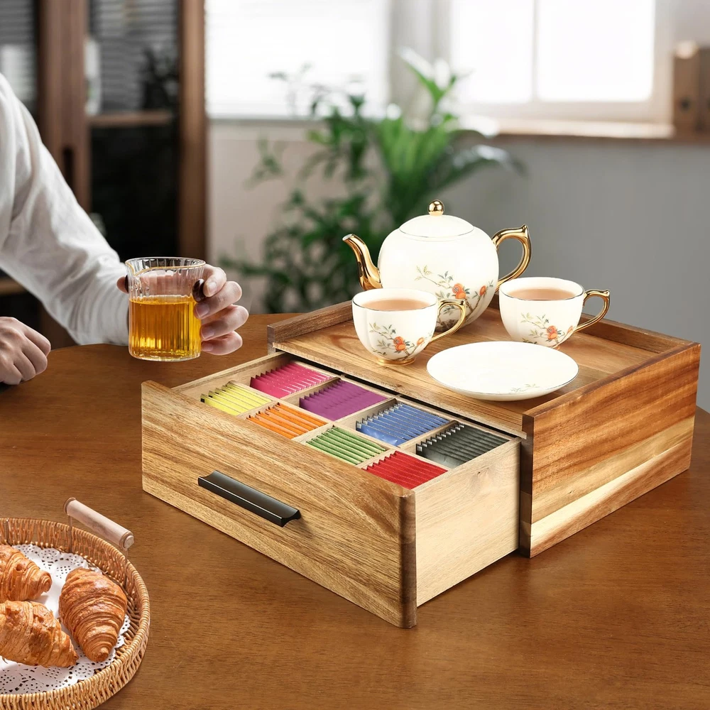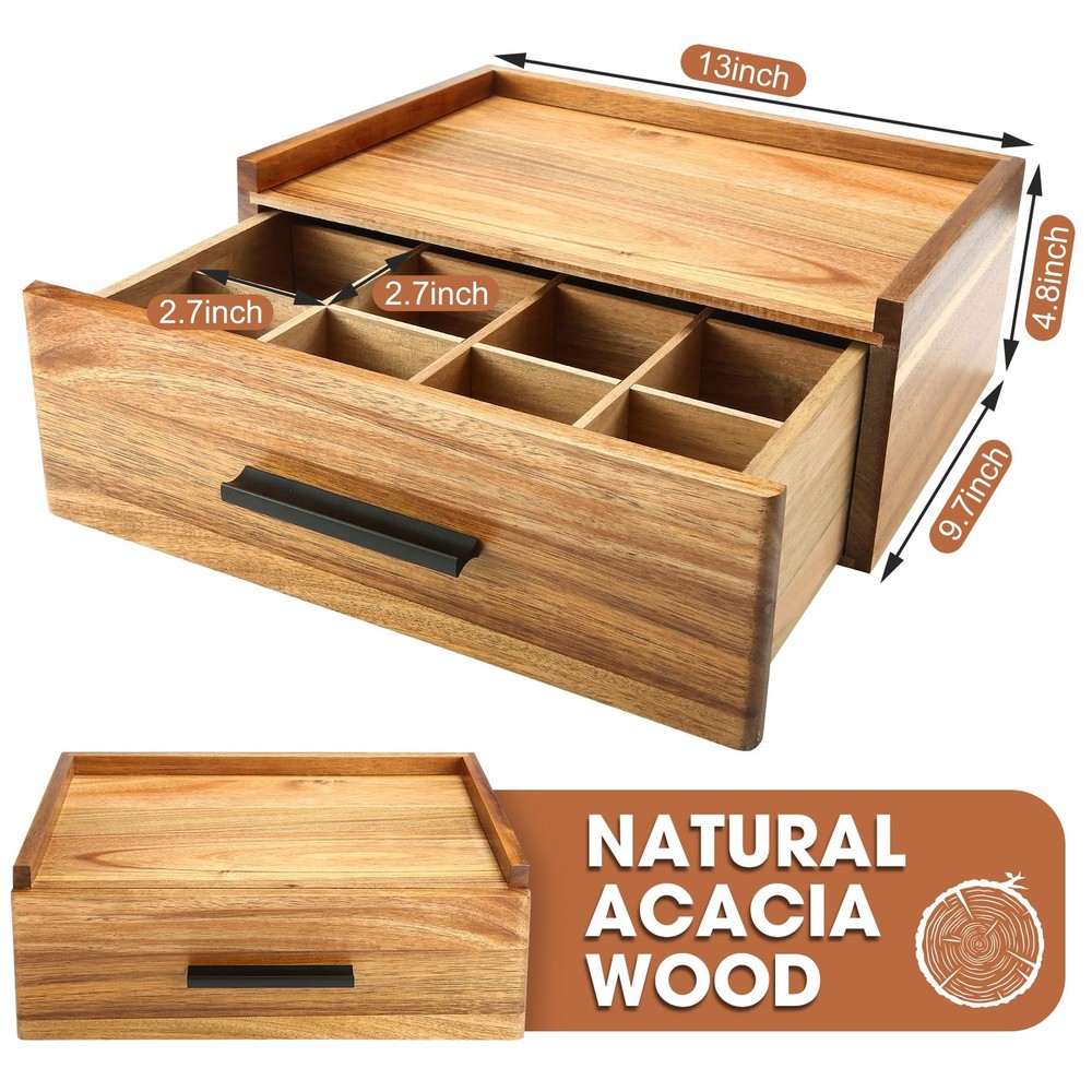 Acacia Wood Tea Bag Organizer - Tea Box Organizer Storage Box with 12 Compartments Why to choose our products: Acacia Wood Tea Bag Organizer 1. Extra large capacity design Features: 12 individual dividers compartments, 3 more storage spaces than ordinary products on the market. Advantage: provide more storage space, not only for tea bags, but also for other tea or coffee supplies. Drawer design, the top can be placed other items, make full use of space. 2. No assembly required, ready to use out of the box Features: The product does not require any installation steps, ready to use out of the box. Advantage: Save time and energy, avoid complicated installation process, let you immediately enjoy a neat and organized tea set storage experience. 3. High Quality Acacia Wood Features: Made of high-grade Acacia wood, with natural and beautiful surface texture and advanced texture. Advantage: strong durability and elegant appearance, suitable for various home styles. The drawers are equipped with black pull handles and have a sophisticated design, perfect for blending into the kitchen or tea room environment. 4. Flexible and Adjustable Dividers Features: Removable compartments, free adjustment of storage space. Advantage: Not only suitable for storing tea bags, but also can be used for storing other small items, such as spices, stationery, etc. The top platform design is convenient for placing tea utensils or other items, and it is stable and not easy to slip off. 5. Ideal for holiday gifts Features: Exquisite craftsmanship, practical and beautiful at the same time. Advantage: Suitable for birthday, anniversary, Christmas and other festivals as a gift for family, friends or tea lovers, to convey warmth and heartfelt feelings. 6. Enhance home taste Features: simple and generous design, high-grade materials. Advantage: Not only a practical storage tool, but also a decorative item to enhance the taste of your kitchen or tea room, making your home environment more elegant. 7. Multi-functional use scenarios Features: Suitable for home, office, tea room and other scenes. Advantage: whether for daily use or special occasions, this tea bag organizer can meet your needs and make life more organized. 【Practical Capacity Tea Bag Organizer】The storage unit has 12 compartments, it's a drawer box and not a lift up the top box so you can other things on top.We have 3 more storage compartments than the market, the unique holding space provides you with a large enough space to tea bags or other tea utensils, coffee supplies 【No Assembly Required】This tea storage box is ready to use without the need for manual installation. You can avoid spending a lot of time thinking about and installing it 【High Quality Acacia Wood Material】The wood we have chosen is the expensive Acacia wood. The surface texture of the wood looks very high class and comfortable. This Tea Holder has a beautiful black pull on the drawer. It’s so cute and fits perfectly on your counter 【Easy to Use & Removable Dividers 】The dividers do come out so if you want the box for something else, you don't have to have the tea dividers. This wood teabag storage features a small Platform for Placing Items. Place some tea sets or whatever you want to place on the top of the Teabag Container Boxe without it falling off easily 【A Good Choice for Holiday Gift】This Acacia Wood Tea Chest can be used in everyone home. Delight your loved ones on special occasions such as birthdays or anniversaries,Christmas Day with this exquisitely-crafted, tea organizers and storage
