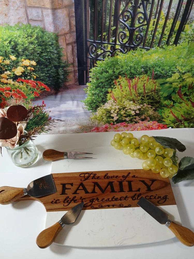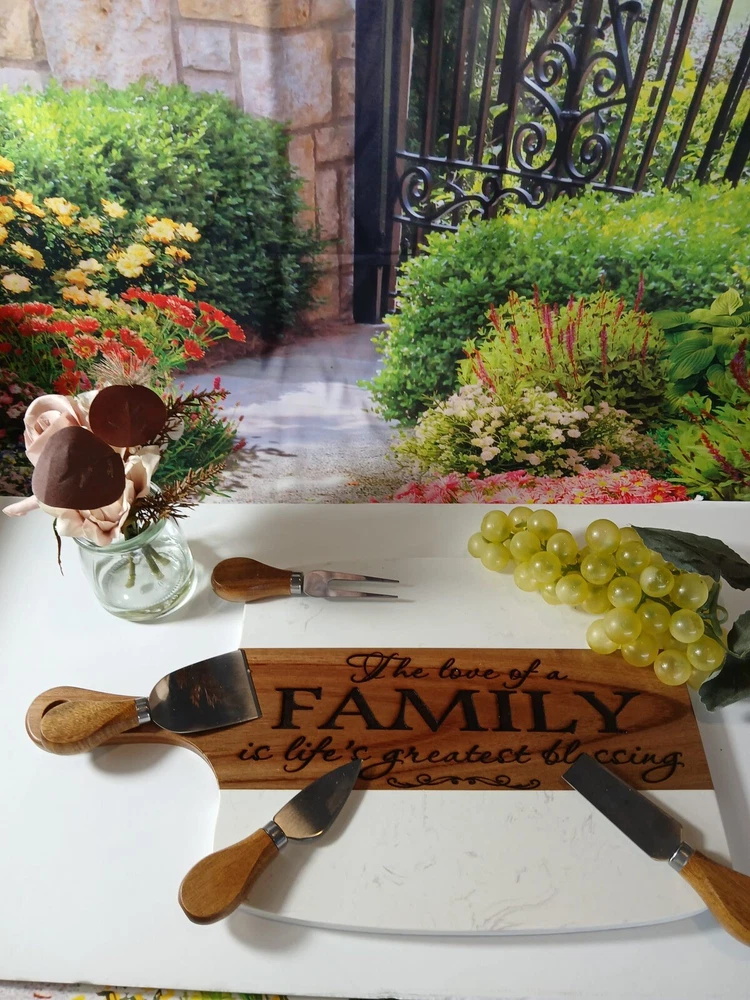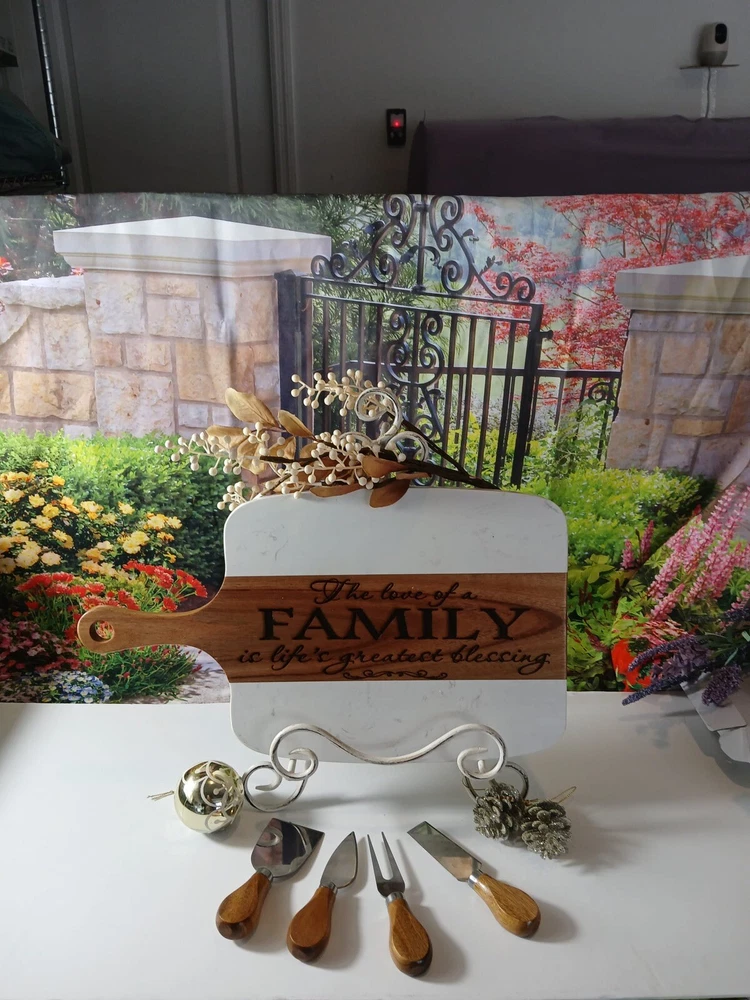 Introducing our Marble Charcuterie Serving Board and Coaster Set - the perfect ensemble for upscale home entertainment. This comprehensive 10-piece set includes an 5-piece marble charcuterie board set designed to elegantly display meats, cheeses, and other appetizers. Complementing this set is a 5-piece coaster set, ensuring you have everything needed to host in style and keep your surfaces pristine. Together, they create the ultimate serving and presentation solution for any occasion. Key Features: Made from heavy marble & quality acacia wood Acacia wood will have beautiful variances of wood pattern, character, colors and knots. Each piece will be unique and different. Dimensions: 15.5" x 9" x 0.5" (sizes may vary +/- by 1/16")The board also features a smooth, polished finish. In addition to the serving board, the set includes three matching ceramic bowls, perfect for serving dips, spreads, and other accompaniments. The set also comes with three wooden spoons and a four piece cheese knife set, all made from high-quality materials. Not only is our Personalized Charcuterie Board a beautiful addition to any kitchen, but it also serves as a versatile serving tray. It's perfect for showcasing your favorite cheeses and charcuterie, making it a wonderful gift for friends, family, or even yourself. To maintain the beauty of the marble and acacia wood, we recommend hand washing the board and periodically polishing the wood with mineral oil. With proper care, this stunning Charcuterie Board will last for years to come. we take pride in our sustainable practices and commitment to eco-friendly materials. Each board is meticulously crafted to reflect our dedication to quality and craftsmanship. We offer fast and pristine delivery, ensuring that your board arrives in perfect condition and ready to be the centerpiece of your next culinary creation. See it Note: Due to the nature of acacia wood, the wood grain color may vary, resulting in a one-of-a-kind piece with yellow, brown, and white streak