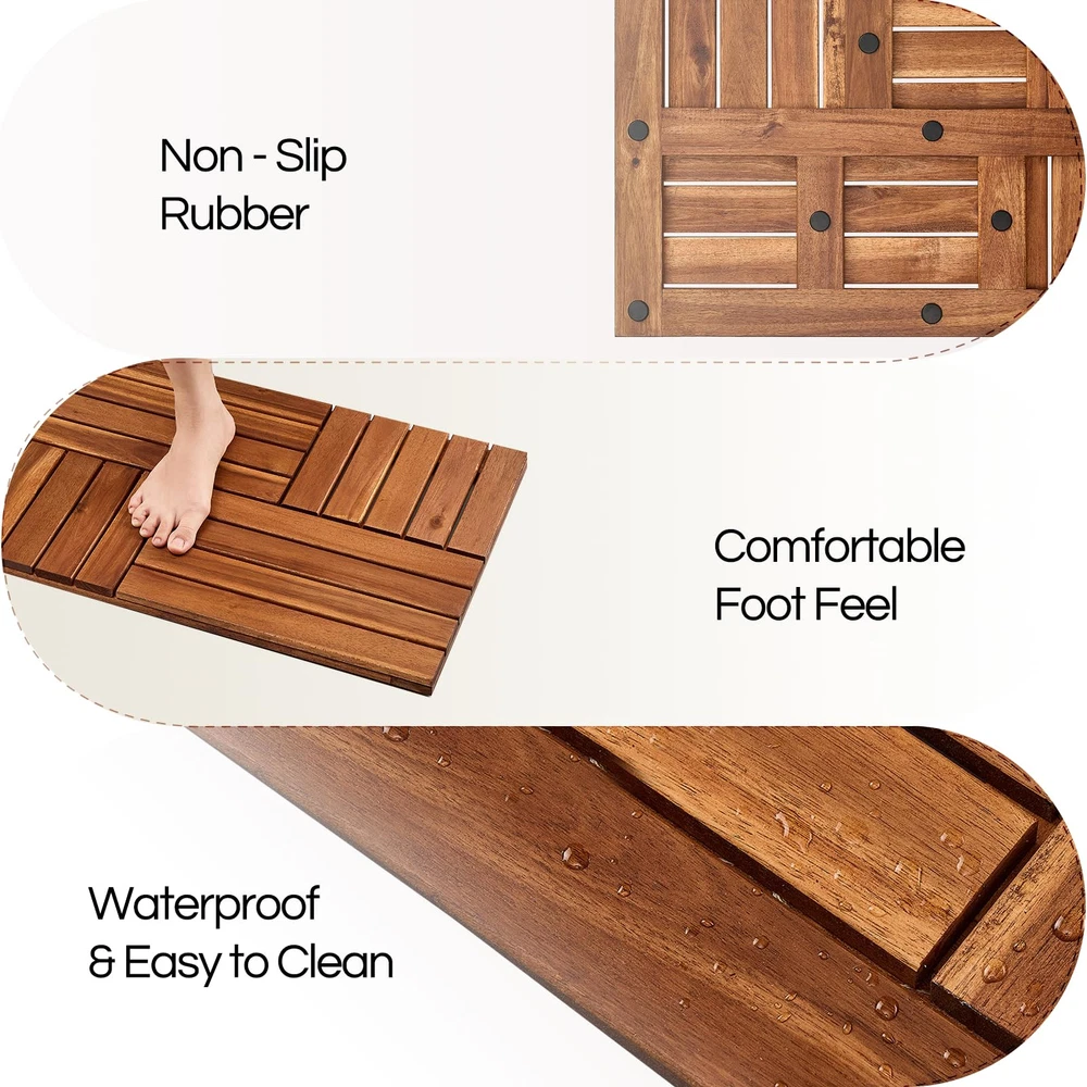 π£π₯ππ ππ¨π & ππ¨π₯ππππ: ππππππ ππ πππππππ ππππ ππππππππ - wood bathmats are made from 100% natural acacia wood, which is super sturdy and waterproof to endure outdoor conditions. With top-notch craftsmanship, the bathmat boasts an impressively smooth surface, firmness when stepped on, and a premium aesthetic look for your bathroom or other areas. There are 2 available colors: Walnut & Golden Teak, for you to choose the that best your preference. ππππππππ‘π§ πͺππ§ππ₯ ππ₯πππ‘πππ: The bathroom floor mat has a slatted design, which provides a super efficient drainage capability. Water can escape quickly, ensuring the mat dries in a short time. Moreover, the bathmat ensure a low risk of water pooling and dirtying your bathroom floor. π‘π’π‘-π¦πππ£ πππ¦πππ‘: Wood Bathmats have 13 rubber feet underneath that stick firmly to the floor. These extra non-slippery accessories prevent the risk of sliding in wet conditions, offering you and a secure feeling and stability when stepping out of the shower or bath. π‘π’ ππ¦π¦ππ πππ π‘πππππ & πππ¦π¬ π§π’ π πππ‘π§ππ‘ππ‘ππ: bathmat arrives in a stylish box, fully assembled and ready for immediate use in any area. It requires minimal effort to maintain. For outdoor dirt that accumulates over time, the acacia bathmat can be easily cleaned with a cloth or water spray. π©ππ₯π¦ππ§πππ π¨π¦πππ: Besides its primary use in the bathroom, wood mat, with its durability and aesthetics, can be used for many other purposes, such as a foot mat in the bathroom, a stand mat for multi-purpose, or can be put in entryways or any area prone to moisture. Whatever the usecase, our floormats will bring you a warm and comfortable feeling when stepped on.
