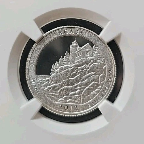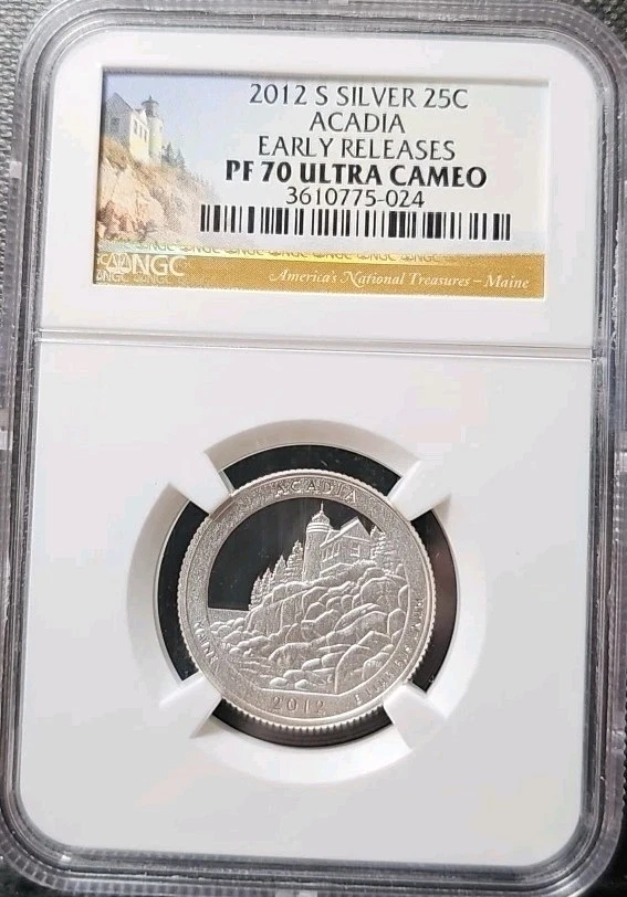 This is a 2012-S Acadia Quarter coin from the America the Beautiful series. It is made of silver, with a denomination of 25 cents. The coin is in uncirculated condition and has a proof strike type. Graded as PF 70 by NGC, it features an Ultra Cameo finish and is an Early Releases variety from the San Francisco Mint in the United States.
