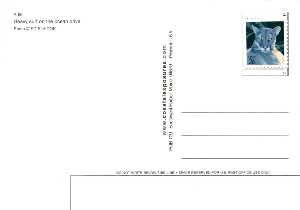 The postcard features a photograph of heavy surf at Acadia National Park on the Ocean Drive. The photo is credited to Ed Elvidge and is part of the collection by Coastal Exposures. Acadia National Park is located in Maine and covers over 49,000 acres of Atlantic coastlines, woodlands, and mountains.