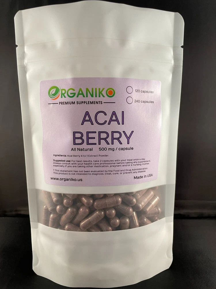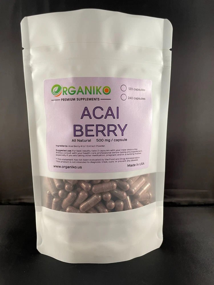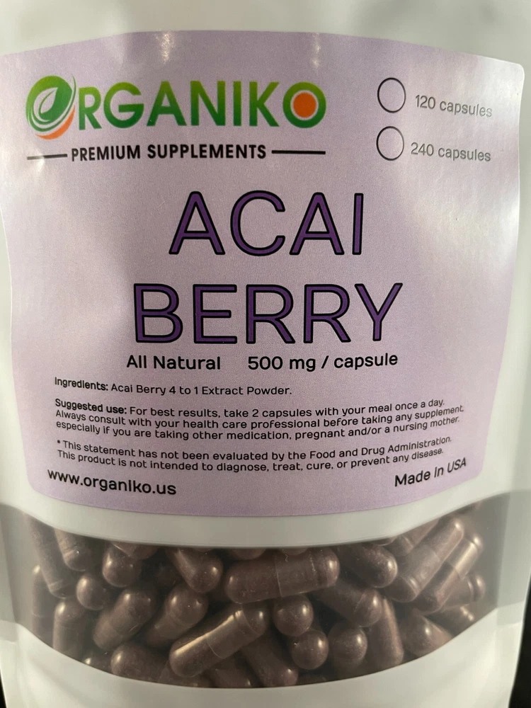 Acai Berry is best known to have the following health benefits: • Helps protect against cellular oxidation • Contains antioxidants • Promotes healthy heart and immune system Our Acai Berry capsules are filled with 100% Acai Berry 4 to 1 extract powder, giving you all the benefits in just one single capsule. Each capsule contains 500mg of 4 to 1 extract powder. We make our products with the highest standards and quality materials. Suggested use: Take 2 capsules with your meal or with warm water once a day. Your satisfaction is important to us. Please reach out at any time if you have any issues with our products and we'll be sure to assist you in the best way possible.