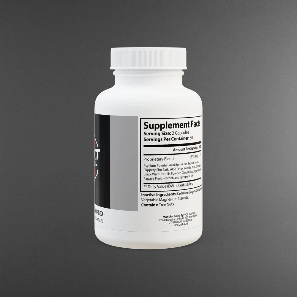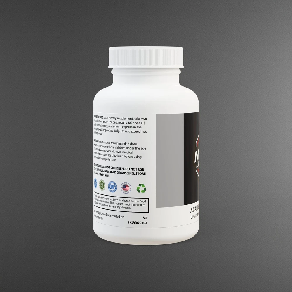 The Acai Berry Complex Supplement supports healthy bowel movements with a blend of key ingredients, including Psyllium Powder, Acai Berry Fruit Extract, Inulin, Slippery Elm Bark, Aloe Ferox Powder 18%, Chlorella, Black Walnut Hulls Powder, Ginger Root, Hyssop Leaf, Papaya Fruit Powder, and Lycopene 5% -- all masterfully balanced in a potent blend that you can easily incorporate in your regimen. Capsuled in the USA with globally sourced ingredients at FDA-registered and GMP-certified facilities, the supplement has undergone third-party laboratory testing. This non-GMO supplement is lactose-free, vegan-friendly, and vegetarian so that you can enjoy its perks with total peace of mind. Ingredients : Psyllium Powder, Acai Berry Fruit Extract, Inulin, Slippery Elm Bark, Aloe Ferox Powder 18%, Chlorella, Black Walnut Hulls Powder, Ginger Root, Hyssop Leaf, Papaya Fruit Powder, and Lycopene 5%. Inactive Ingredients : Cellulose (Vegetable Capsule), Vegetable Magnesium Stearate. Contains : Tree Nuts Please note : Relevant product and manufacturing certificates can be found in downloadable assets after you start designing Please note : This product is shipped only to the United States and their territories Please note: This product is not eligible for publishing on Etsy, Amazon, and TikTok Shop US. More info here . .: Capsuled in the USA with globally sourced ingredients .: Capsuled at FDA-Registered and GMP-Certified Facilities .: 3rd Party Laboratory Tested .: Non-GMO .: Vegan Friendly .: Vegetarian .: Lactose Free .: Design printed on a sticker label .: Please note: This product is shipped only to the United States and their territories .: Please note: This product is not eligible for publishing on Etsy, Amazon, and TikTok Shop US.