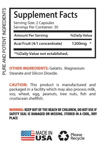 ACAI BERRY EXTRACT - Digestive Well-Being Support - 1B 60 Caps ACAI BERRY EXTRACT Made Only From Pure and Potent Ingredients Promotes Heart Health & Boosts Immune System Fat Burning Dietary Supplement Made in the USA 1 Bottle 60 Capsules Introducing our Acai Berry supplement – a robust health solution derived from the heart of the Amazon rainforest. Explore the evidence-based health benefits of this potent fruit, expertly extracted to deliver a concentrated dose of nutrients aimed at supporting your overall well-being. Sustainable Sourcing: Our commitment to your health extends to environmentally conscious practices. We employ ethical harvesting methods, ensuring minimal impact on the Amazon ecosystem while prioritizing sustainable and responsible sourcing. Health Benefits Unveiled: Antioxidant Support: Acai Berry is rich in antioxidants, including anthocyanins and polyphenols, known for their ability to counteract oxidative stress. This antioxidant support contributes to cellular health and may help mitigate the effects of free radicals. Acai Berry Origins: Indigenous to the Amazon, the Acai Berry has gained recognition for its nutrient density and potential health advantages. Our supplement brings you the nutritional richness of this fruit, responsibly sourced to meet rigorous quality standards. Cardiovascular Health: With notable amounts of anthocyanins and plant sterols, Acai Berry may play a role in supporting cardiovascular health by helping maintain optimal cholesterol levels and promoting healthy blood circulation. Immune System Enhancement: Packed with essential vitamins, minerals, and immune-supportive compounds, Acai Berry provides a boost to your body's defense mechanisms. This can aid in fortifying your immune system against external threats. Digestive Health: Boasting a high fiber content, Acai Berry promotes digestive well-being by facilitating regular bowel movements and fostering a balanced gut microbiome. Improved nutrient absorption contributes to comprehensive digestive health. Natural Energy Boost: Acai Berry serves as a natural energy source, offering sustained vitality for both physical and mental well-being. Whether you're looking to enhance your workout or combat daily fatigue, this supplement may provide the energy support you seek. Immerse yourself in the health benefits of the Amazon with our Acai Berry supplement. Meticulously crafted with a focus on quality, this product embodies a health-conscious approach, delivering the potent advantages of Acai Berry to support your journey toward optimal well-being. SUPPLEMENT FACTS Serving Size: 2 Capsules Servings Per Container: 30 Acai Fruit - 1200mg (4:1 Concentrate) Other Ingredients: Gelatin, Magnesium Stearate, and Silicon Dioxide.