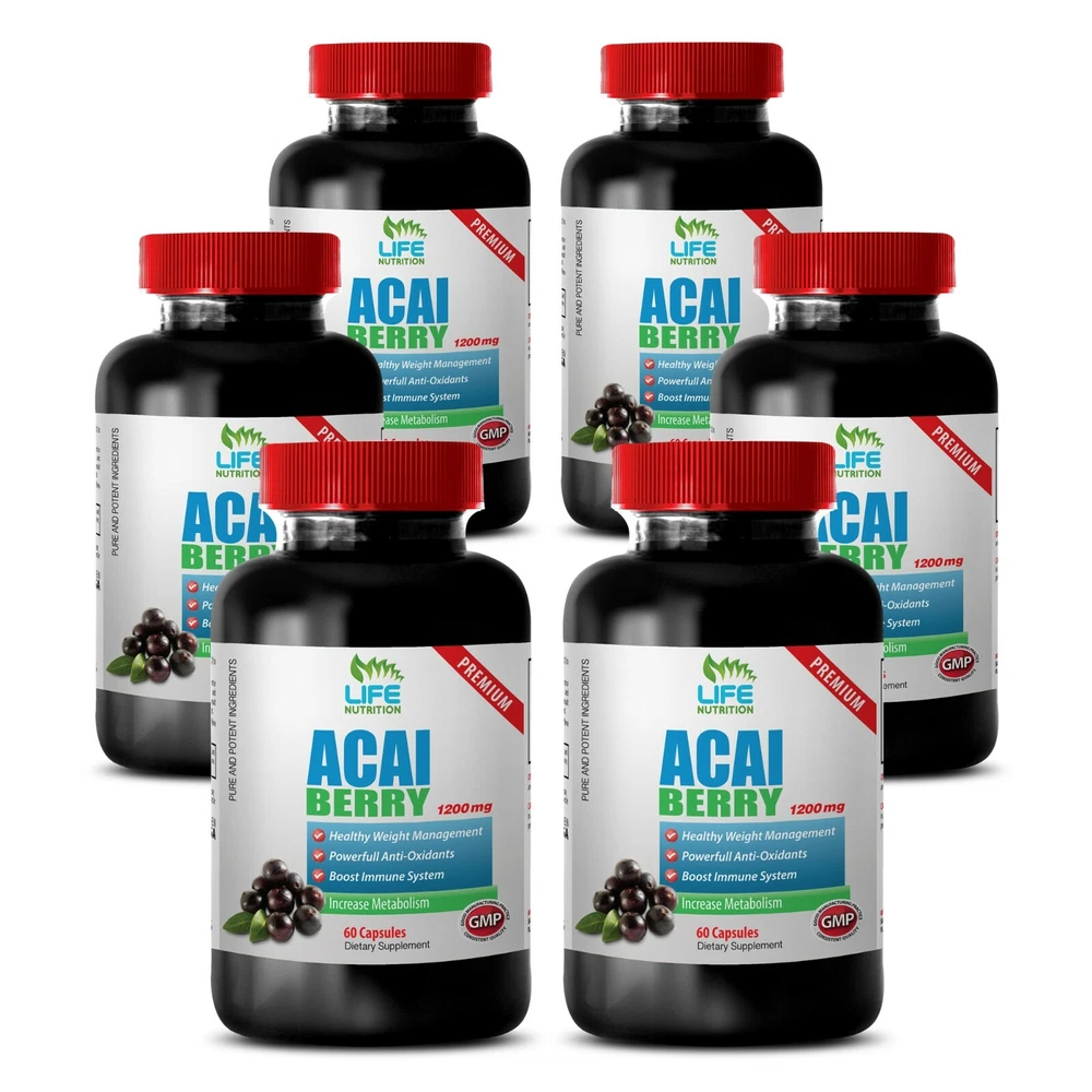 Acai Berry Extract 1200mg 100% Pure Acai Berry Extract 4:1 Boost Body Natural Defenses,Powerful Antioxidant. Helps Regulate Healthy Metabolism, Healthy Weight Loss. Boost Immune System, Detoxify The Body. Organic Natural Aphrodisiac, Fat Burner & Energy Booster. Beautifies The Skin.Promotes Heart Health. 6 Bottles, 360 Capsules Made In USA About Acai Berry Health Benefits: The Acai Berry originates from Acai palm trees found in Central and South American rainforests. They grow in swamps and floodplains. The genus Euterpe has 8 species of palm, with the Acai palm being one of them. Scientifically known as Euterpe Oleracea, the name Acai was derived from the Tupian word, wasa'i, which means 'fruit that expels water'. The genus Euterpe was named after the Euterpe of Greek mythology and all species of Euterpe can grow up to 30 meters high, with leaves up to 3 meters long.The acai berry grows in the wild and are harvested daily. This fruit is 10% pulp and 90% inedible nut. Special care must be taken in separating the pulp from the nut. The finished product yields a thick Acai pulp.Acai was unknown for its health benefits outside the Amazon rainforest for centuries. In a comparison with red wine acia berry has a higher concentration of anthocanins, the compound that give red wine its health benefits. Acai is also a source of protein, fiber, omega 6 and omega 9 fatty acids.It has been proven through scientific research that the Acai berries are amongst the most nutritious foods, rich in B Vitamins, minerals, fiber, protein and omega-3 fatty acids.The Acai Palm is fast growing and is renowned for the health properties of its berries and the superior hearts of palm. The berries, seeds and soft inner growing tip of the palms can be consumed. The berries have become popular in health product, which offers the berry in a supplements form. Benefits Of Acai Berries: Anti-Aging Aids In Weight Loss Heart Health Promotes Skin Health Helps With Digestive Upset Improved Cellular Health Energy Boost Better Sex Improves Mental Function Lowering bad cholesterol Maintaining levels of good cholesterol Restoring antioxidants in the body Strengthening visual acuity Digesting food Assisting bodily chemical reactions Strengthening immune system Helping sleeping Detoxifying the body Does Acai Berry Work For Weight Loss? The rich nutritional content of acai berries helps to body to function more efficiently, which may make it easier to maintain a healthy weight. However, the evidence supporting its efficacy as a fat burner is contradictory. Although there are no real clinical studies to draw from, it continues to be a popular slimming aid in many countries around the world. Some people claim that the berries reduce appetite and as a result they consume fewer calories. It may be that the energy-boosting benefits of acai help to replenish energy stores which are often low during weight loss diets. Others point to the berries gentle nature and consider them to offer a safer alternative to so called ‘diet pills’. Acai berry has ingredients that aid in weight loss, and has been scientifically proven. It provides a boost to the metabolism. When purchasing these products for weight loss, it would be wise to get the better grade of acai, as some of the companies are advertising a wide range, and some don’t measure up to what it can actual do. In the area of weight loss this has give acai a bad name, because of the quality of the acai berry used. This may or may not be true, with any weight loss product persons who has a desire to use a product for weight loss should incorproated a well balanced meal plan as well as daily exercise routine into their weight loss porgram. Additional Benefits Associated With Acai Berry: Acai berry protects your health and helps you lose weight, but the benefits don’t stop there. When consuming an acai berry supplement, users can also experience glowing skin and vibrant hair. Since the acai berry is packed with vitamins, they contribute to beauty benefits. Rich in vitamins A, C, and E, these support a healthy and glowing complexion. It also offers antioxidants which block free radicals that cause severe damage to your body and skin. Acai berry not only reduces the sign of aging but based on its anti-inflammatory properties, it also combats the effects of acne. Acai berries are becoming a popular ingredient in a wide range of beauty products due to its high antioxidant content. While it does provide skin benefits when applied topically, adding the berries to your diet has been shown to provide that radiant, healthy glow from the inside out. Acai Berry Immune System Booster: Acai Berry 1200 supplements help to build a strong immune system. These berries contain a tremendous amount more antioxidants than any other fruit. A strong immune system has a greater chance of fighting off illnesses. It is difficult losing weight, especially when your colon is congested and you have a low immune system. That is what makes this supplement so impressive compared to other supplements. Acai berries are high in antioxidants and vitamin C, which gives your immune system a boost. By fighting the free radicals in your system, the berry helps you fight off illnesses much easier. Better Sex With Acai Berry: Yup, we are kicking off the list with sex! Acai is a known aphrodisiac loaded with compounds that increase overall energy and well-being, and that includes sexual function. Acai also increase circulation in the body, which means increased libido.The extra energy you get from eating this berry also boosts your libido. The good fats found in the fruit help increase production of testosterone and estrogen.Increased Sexual Stamina. Acai pills are thought by many to have a positive effect on sexual stamina, and to enhance an individual’s sex life. Amazon tribes were the first to use acai for its benefits on the libido. For this reason, many individuals take acai pills for a positive health benefit to their sex 