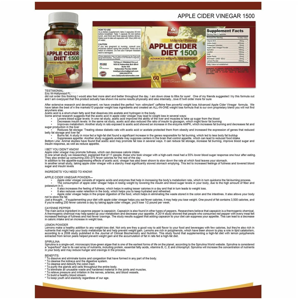 100% Natural Premium Quality Fast Shipping Acai Berry Slim Weight Loss Supplement Capsules Apple Cider Vinegar Pills 2pk Special Advanced Apple Cider Diet Fat Burner Weight Loss Capsules Supplement(60 Capsules) Help reset your metabolism, curb your appetite peel off stubborn pounds and cleanse your body of harmful toxins in no time. Its lemon, cayenne pepper and apple cider vinegar formula regulates blood sugar levels, makes you feel fuller and detoxes your entire body and bloodstream. Apple cider vinegar may promote fullness, which can decrease calorie intake. In one small study we researched, explained that of 11 people, those who took vinegar with a high-carb meal had a 55% lower blood sugar response one hour after eating. They also ended up consuming 200-275 fewer calories for the rest of the day In addition to the appetite-suppressing effects of acetic acid, vinegar has also been shown to slow down the rate at which food leaves your stomach. In another small study, taking apple cider vinegar with a starchy meal significantly slowed stomach emptying. This led to increased feelings of fullness and lowered blood sugar and insulin levels Benifits: To dissolve and eliminate toxins and congestion that have formed in any part of the body. To cleanse the kidneys and the digestive system. To cleanse and detoxify the colon tract. To purify the glands and cells throughout the entire body. To eliminate all unusable waste and hardened material in the joints and muscles. To relieve pressure and irritation in the nerves, arteries, and blood vessels. To build a healthy blood stream. To keep youth and elasticity regardless of our age. Product Features: ⭐ Maximum Potency Colon and Detox Cleanse ⭐ With cascara Sagrada Apple Cider. ⭐ Help Rid Intestinal Tract of Excess Waste. ⭐ Potent Blend Of Natural Herbs. ⭐ Supports Natural Digestion and Intestinal Health. Organic Acai Slim Berry Weight Loss Belly Fat Burn Dietary Supplement Product Description: Maintain a normal metabolism and energy production when you take these Acai Slim capsules, which contain acai berries from the Amazon forest. The acai berry will increase energy and stamina levels, and help support healthy cardiovascular and digestive health because of its amazing combination of healthy fats, phytosterols, dietary fiber, omegas and vitamins. What Are Acai Berries? Acai berries are round fruits that grow on acai palm trees in the rainforests of Central and South America. They have a dark purple skin and yellow flesh surrounding a large seed. In the Amazon rainforest, acai berries frequently accompany meals. Acai berries are also sometimes used to flavor food products, including jelly beans and ice cream, while some non-food items like body creams contain acai oil. HELPS DIGESTION Contains high amounts of fiber in its pulp which helps the digestive tract process and eliminate debris and stored fat. This improves absorption of nutrients and helps weight loss. Helps You Lose Weight: Acai-based products have been widely hyped as having significant Weight loss potential. The Antioxidants present in the acai berries lower cholesterol levels in the body, which in turn helps you lose Weight and bring the body back to its optimal state. Healthy cholesterol levels mean balanced body function, good Metabolism rate, and heart health benefits. Our herbal supplementation with acai berries may be useful in improving Weight management as well as helping you to burn more calories and suppressing appetite. APPETITE SUPPRESSANT - Keep your appetite under control and lose weight faster by sticking to your diet. Curb cravings and reduce hunger by improving satiety after meals, so you can avoid binge eating. AMAZING SKIN BENEFITS: Acai berries are also known for their skin health benefits. They increase regeneration processes in the body, not only due to increased levels of vitamin C, but also due to high levels of iron. This means less wrinkles, blemishes and age spots. Moreover, they contain a high level of Fatty acids that help the skin stay firm, youthful and healthy. This acai berry supplement will keep your skin looking fresh and spotless. LOADED WITH ANTIOXIDANTS: Antioxidants are important because they improve the health throughout the body. Acai berries have an incredibly high amount of Antioxidants, edging out other Antioxidant-rich fruits like blueberries and cranberries. This Antioxidant activity comes from a number of plant compounds in acai, including anthocyanins. The acai berry supplement has a high Antioxidant levels, which means that the Antioxidant compounds in acai are well-absorbed in the gut. IMPROVE CHOLESTEROL LEVELS: Acai could help improve cholesterol levels by controlling total cholesterol. Acai could be responsible for their positive impact on cholesterol levels. In addition, acai contains plant sterols, which prevent cholesterol from being absorbed by your body. Acai may help lower blood cholesterol levels. POTENT IMMUNE BOOSTER: These berries increase the function of immune cells even when consumed in low doses. They have very high levels of vitamin C together with ellagic acid, an Antioxidant that improve body function. Acai strengthen the body’s cells, which makes it easier to fight any infections or invasions of free radicals. This berry is a potent immune and Energy booster, and has been proven to promote the healthy lifestyle. Boost Brain Function: The many plant compounds in acai could also protect your brain and improve memory functioning. The Antioxidants in acai may show its benefits on memory and learning. Acai may even help improve memory. Acai may counteract the influence of stress in the brain and help stimulate its response. Powerful Energy Booster: This berry is a potent immune and Energy booster, and has been proven to improve numerous health conditions. Overall properties of the acai berries increase the body’s Energy levels, as well stamina. They reduce Fatigue, improve concentration. Additionally, due 